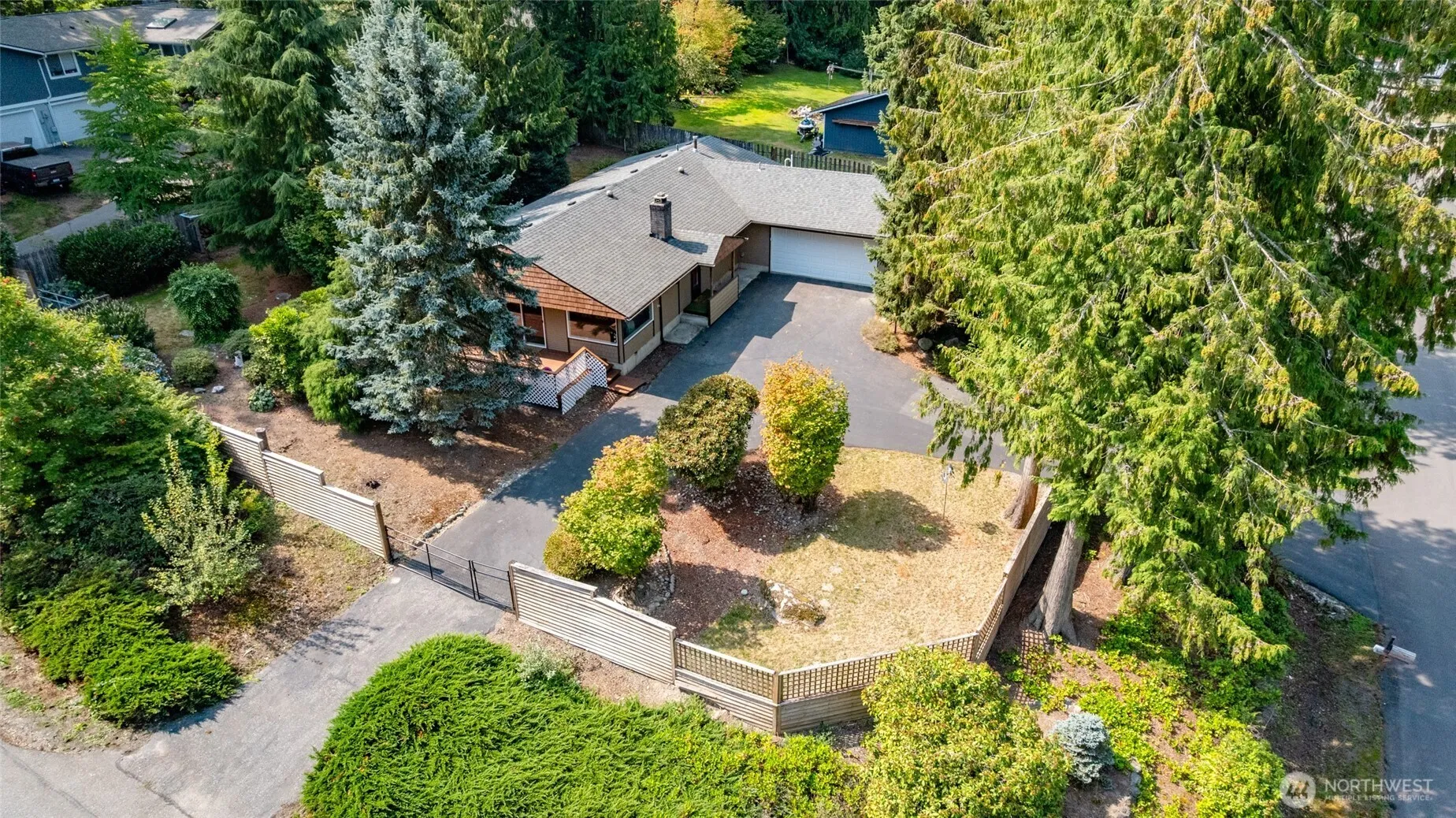 Charming one-level rambler in the sought-after Thunderbird neighborhood in Mt. Vernon. This 3BR, 1¾ bath home offers 1,428 sq ft of comfort with wood and tile floors, cozy living room with welcoming fireplace, and a flexible office/bedroom with elegant French doors. Step from the kitchen and living room to the outdoor deck for grilling and entertaining. There is a 2-car garage with an attached shop, and gated access with plenty of space for cars, boats, and RVs. The nearly half-acre corner lot features lush landscaping, garden beds, and three outbuildings. New electrical panel, oven and garage door opener. Just 2 blocks from Bakerview Park – playing fields, dog park, BMX track, skate park, picnic areas and more. Schedule your showing today!