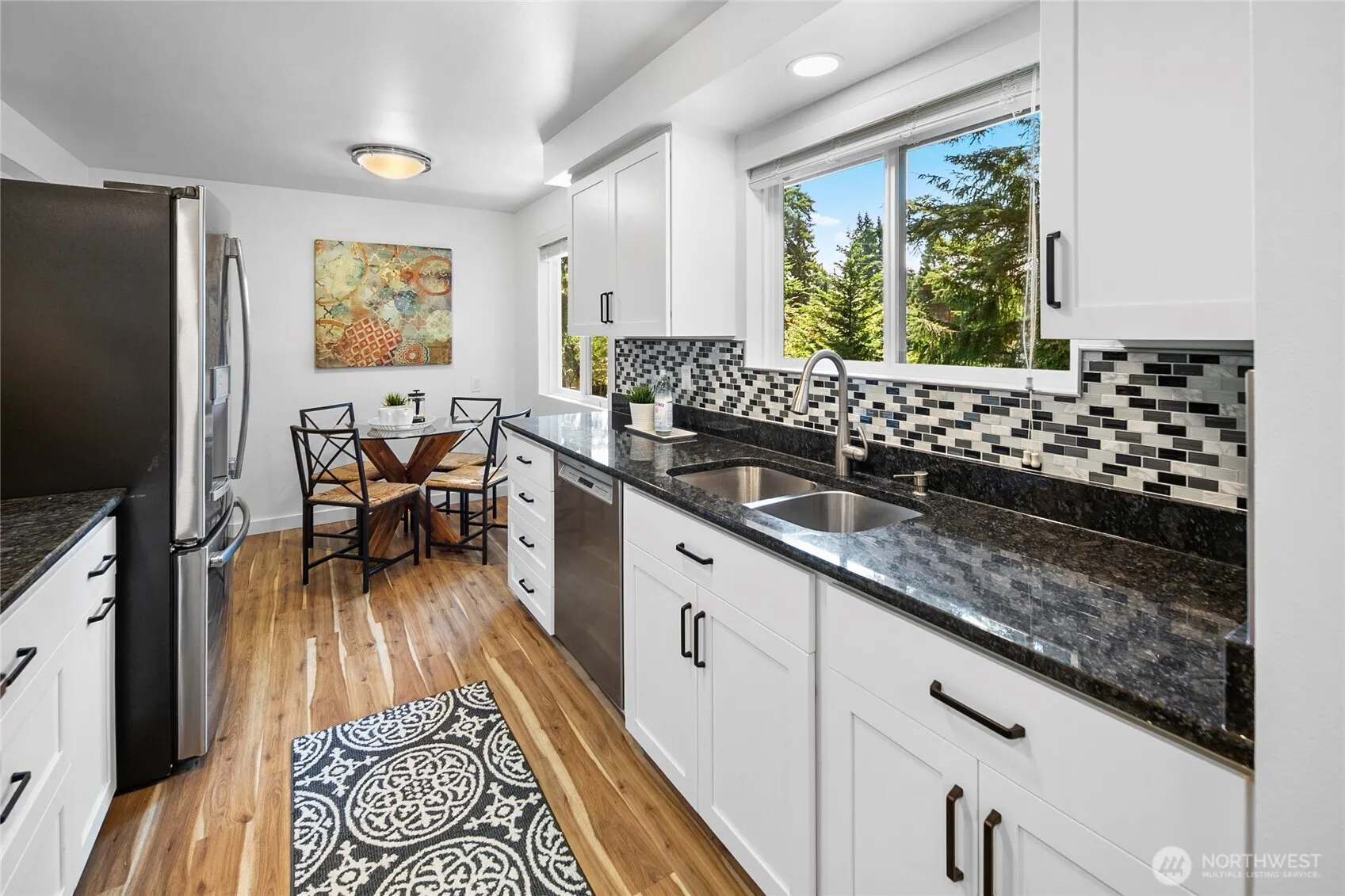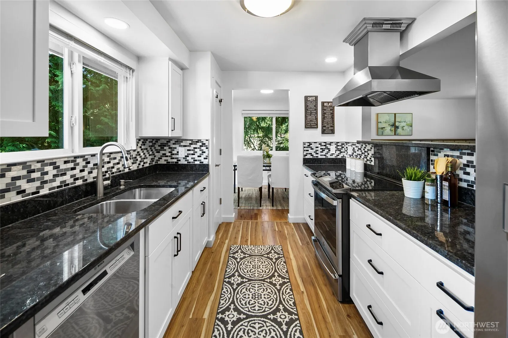 Spacious Shoreline mid-century home with gleaming hardwood floors and refreshed kitchen featuring granite counters, new hood vent, & eat-in kitchen nook. Enjoy the large living room with cozy wood-burning fireplace. Dining room opens up to an entertainment sized Trex deck where you can enjoy dinner al fresco! 3 bedrooms on the main level, including a primary suite. Stay cool all summer long with heat pump cooling. Generous basement with separate entrance with MIL potential -full kitchen, large rec room /living space with fireplace, backyard access, plus storage/workspace. New roof in 2022. Relax in the hot tub, plus enjoy a 2-car carport, EV charging & driveway parking. Close to schools, parks, shopping, restaurants, & light rail stations.