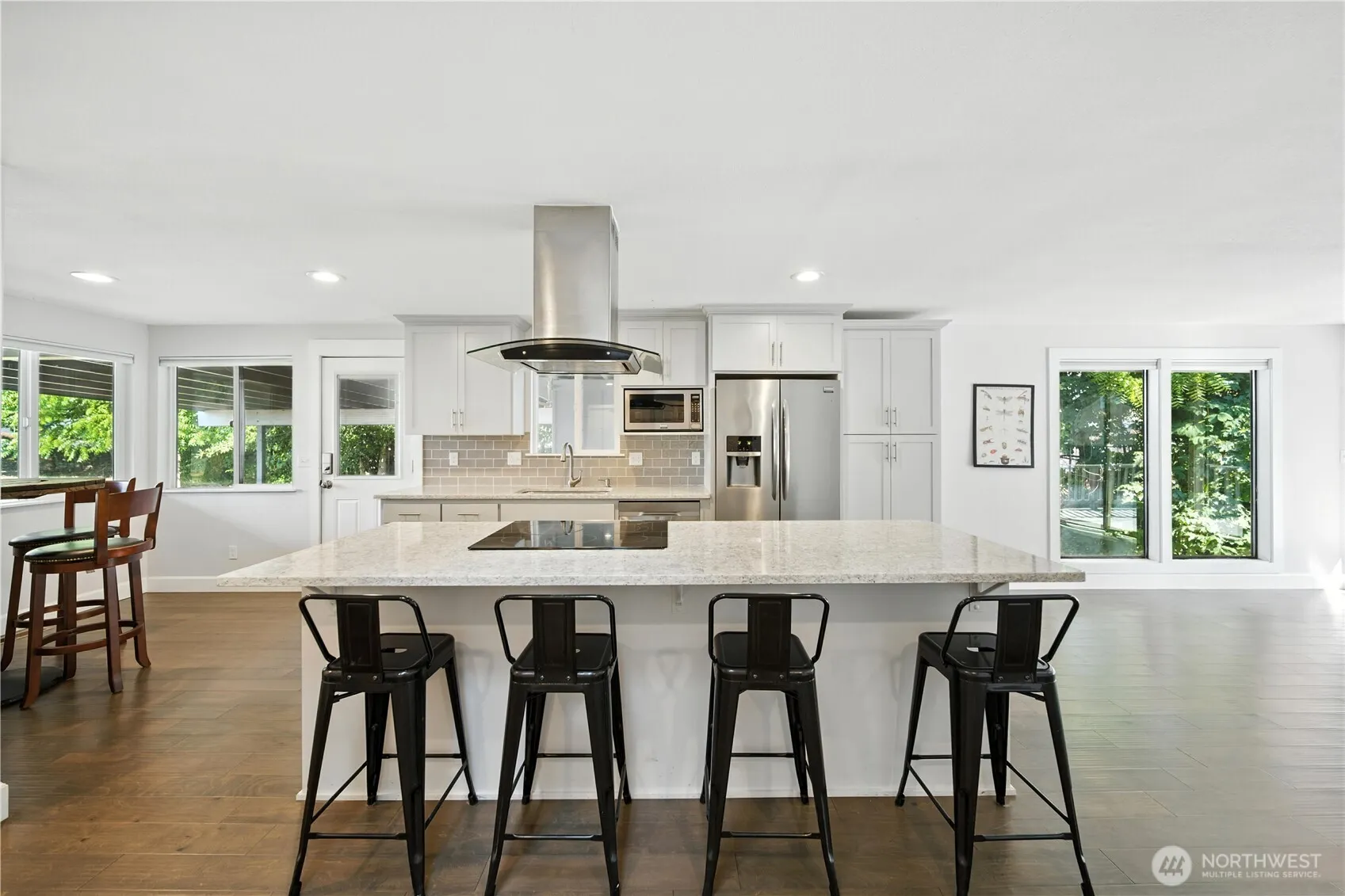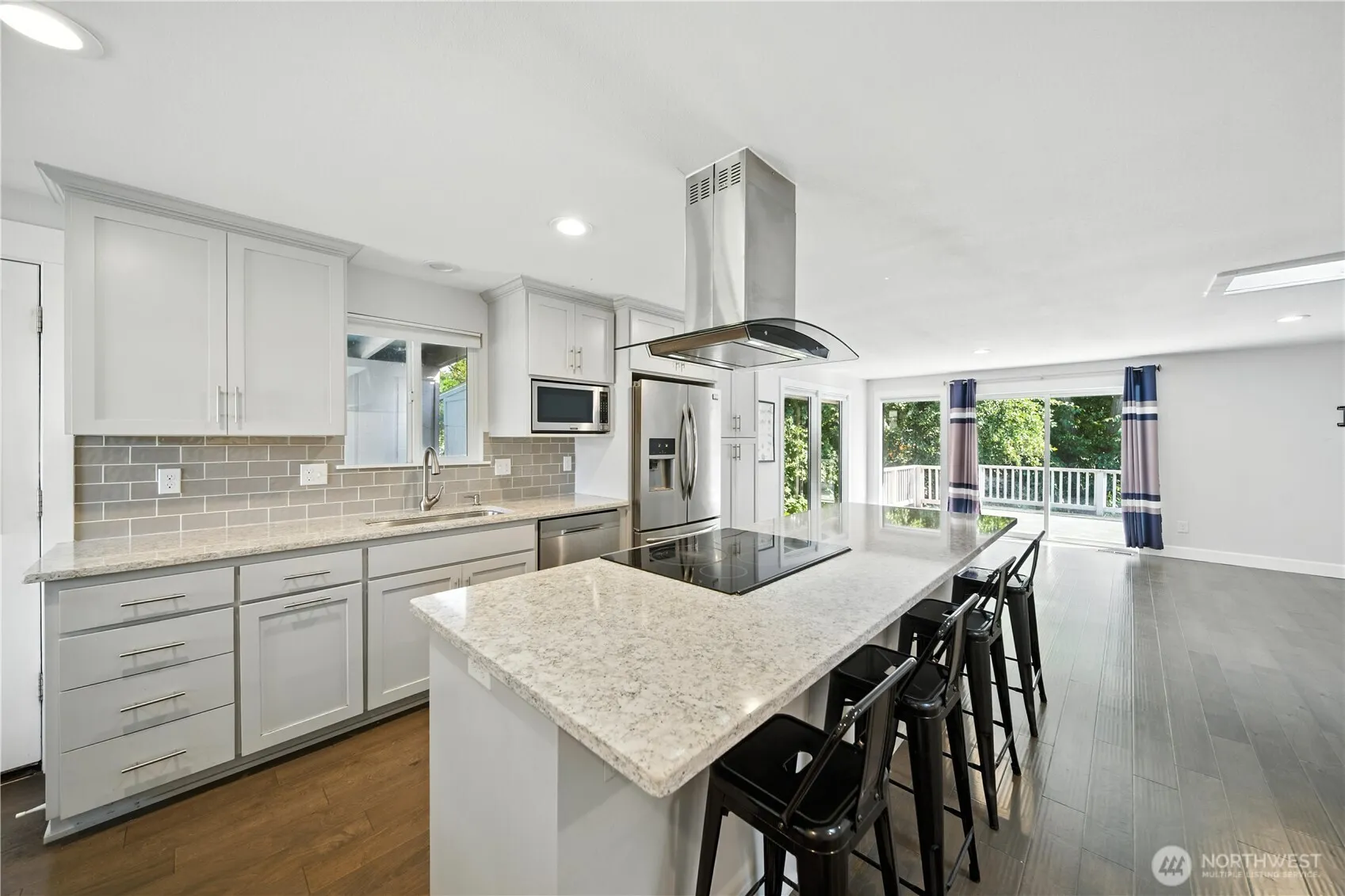 Contemporary rambler with stylish updates throughout! Enjoy a tiled entry, wood floors, quartz kitchen counters, stainless kitchen appliances, custom cabinetry, and solid core doors. Skylights brighten the open floor plan that flows into a spacious great room with eat-in kitchen and island. Updated electrical, plumbing, high-efficiency gas furnace, windows, and Trex decking offer comfort and reliability. Relax in the primary suite with walk-in closet and en-suite. Gracious layout overlooks scenic Garrison Creek. A must-see!