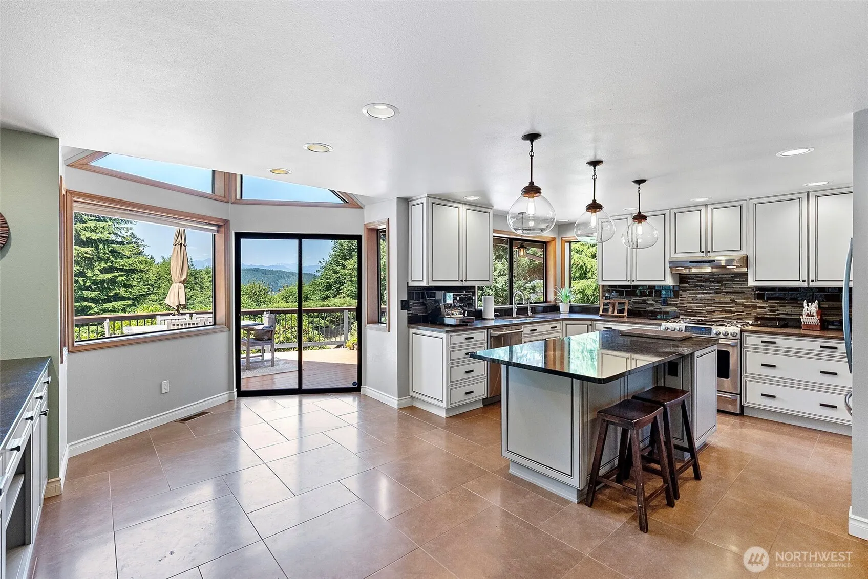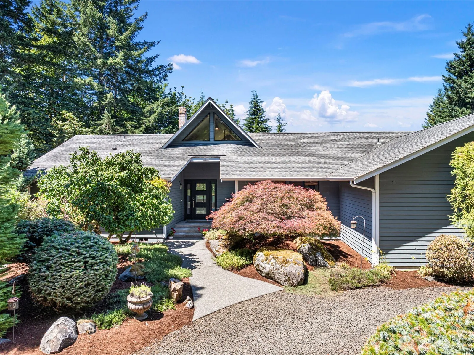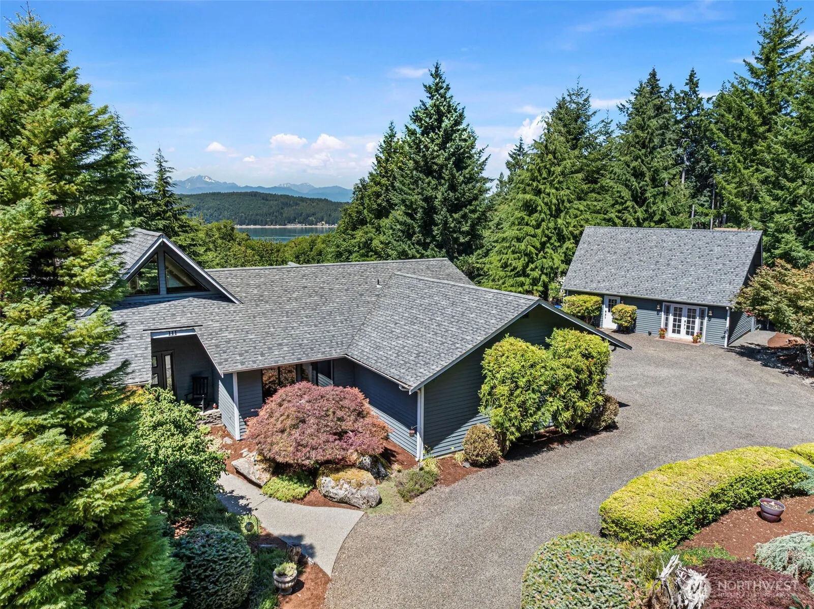Welcome to Olympic Palisades! Set on over 2 acres along a private road, this property offers a 2,145 sq. ft. main home and a 2-bedroom guest house—ideal for multi-generational living. Vaulted ceilings and expansive windows showcase stunning views of the Olympic Mountains, fjord, and beautiful landscaping. Custom cabinetry, counters, and tile extend throughout. The luxurious owner’s suite features a private balcony, heated floors, dual walk-in closets, jetted tub, and spacious shower. Extras include a workshop, sports court, fenced lawn, and fruit trees.