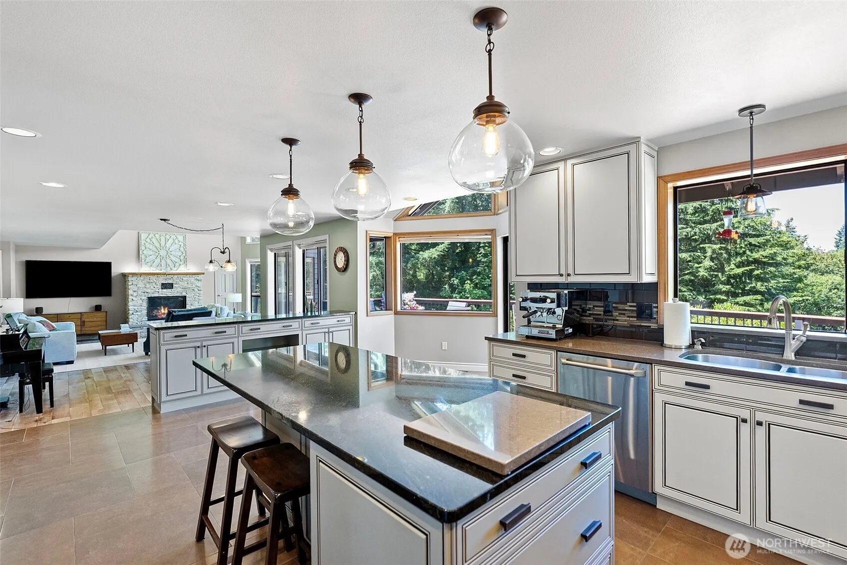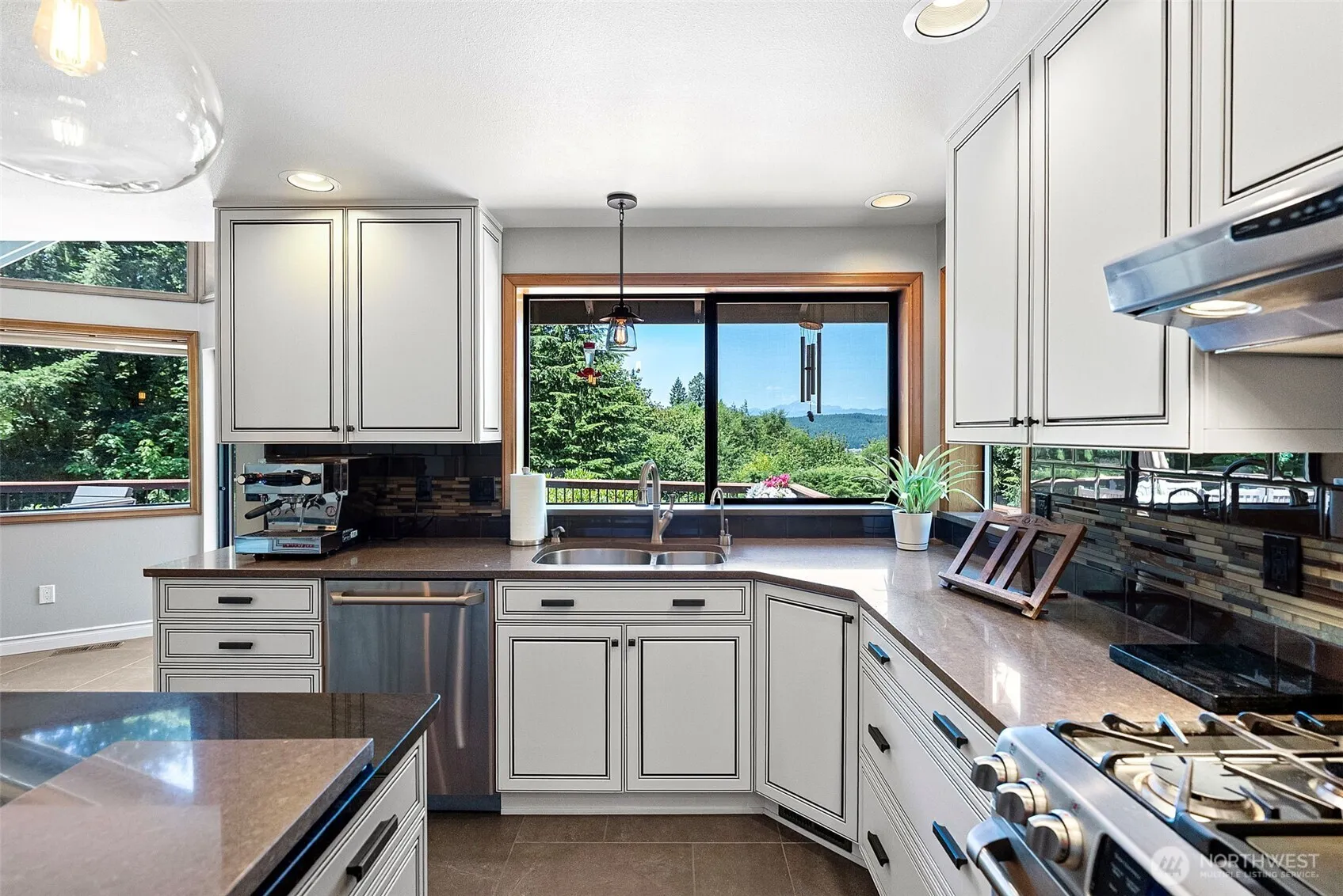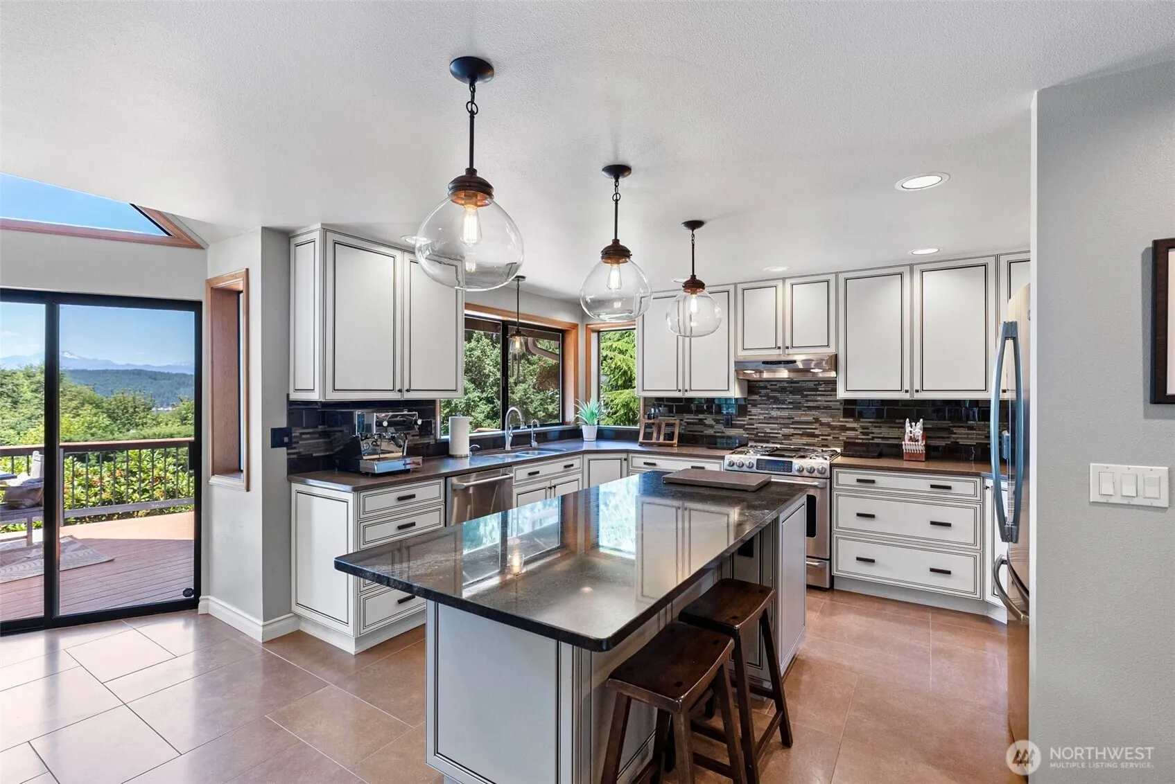 Welcome to Olympic Palisades! Set on over 2 acres along a private road, this property offers a 2,145 sq. ft. main home and a 2-bedroom guest house—ideal for multi-generational living. Vaulted ceilings and expansive windows showcase stunning views of the Olympic Mountains, fjord, and beautiful landscaping. Custom cabinetry, counters, and tile extend throughout. The luxurious owner’s suite features a private balcony, heated floors, dual walk-in closets, jetted tub, and spacious shower. Extras include a workshop, sports court, fenced lawn, and fruit trees.