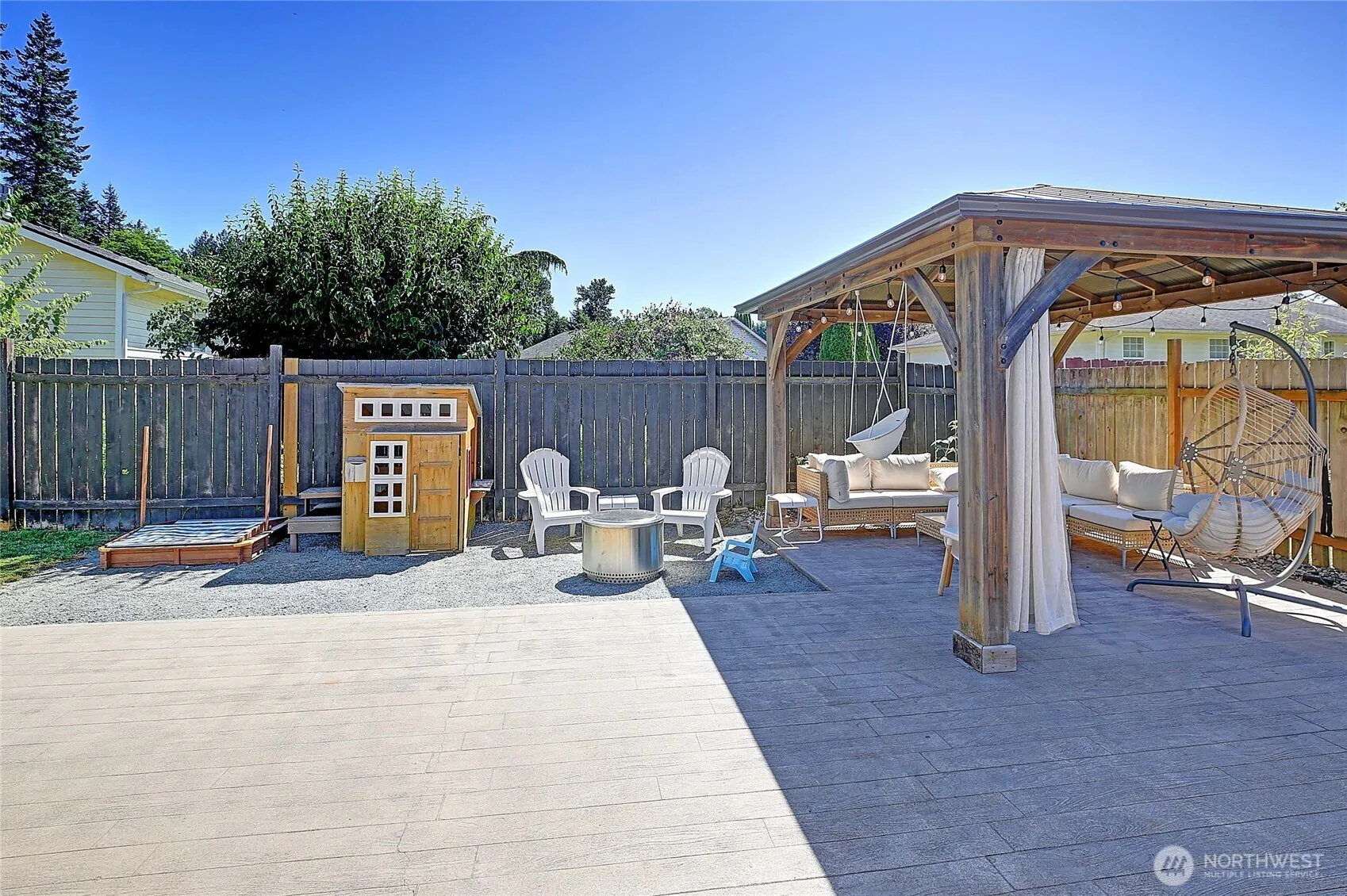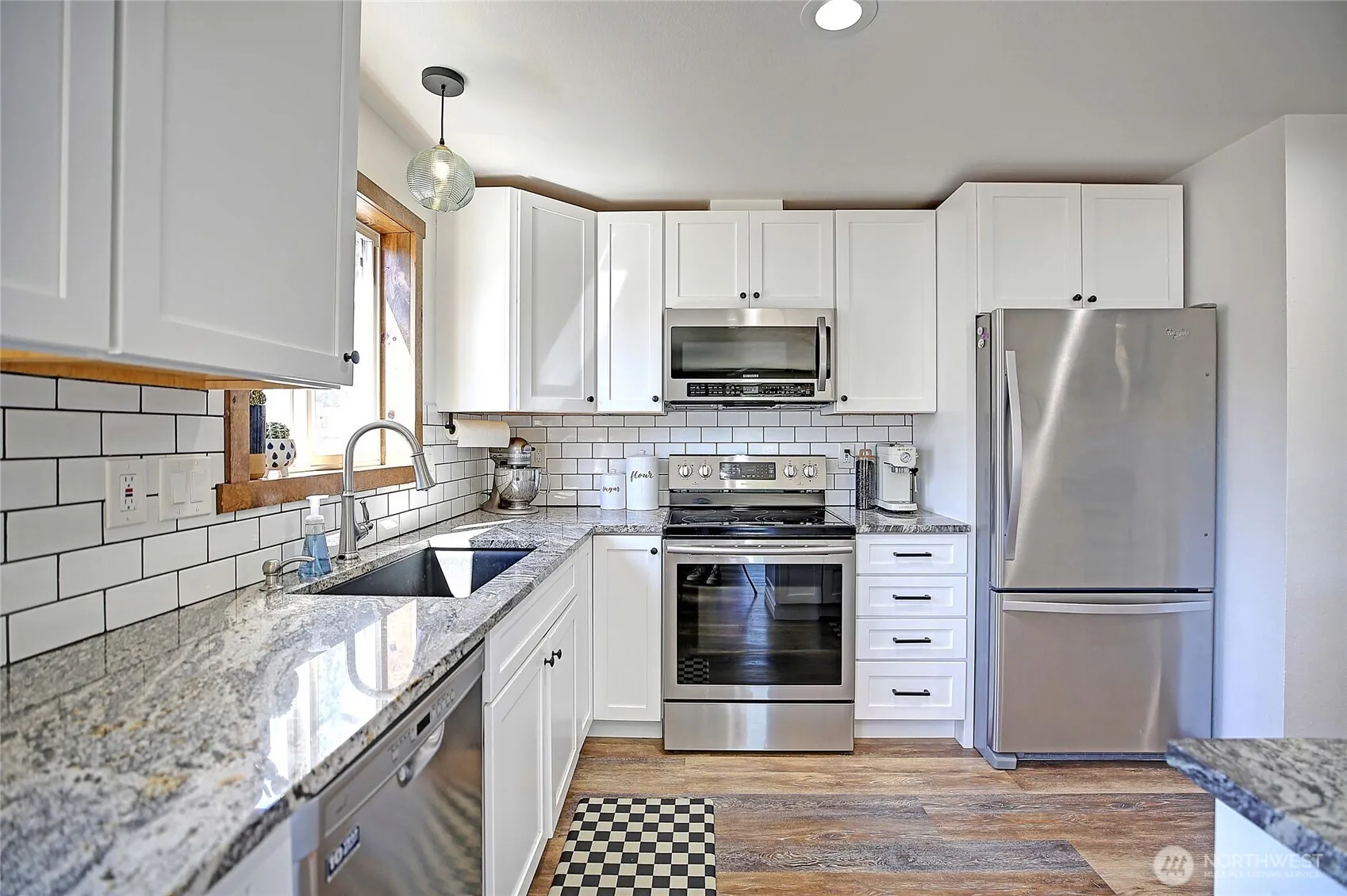 Welcome to this beautifully updated rambler nestled on a spacious, fully fenced corner lot in a quiet, well-established neighborhood—just minutes from local amenities. Open-concept layout, tons of natural light & durable vinyl plank flooring throughout. Enjoy year-round comfort with a ductless mini-split system for efficient heating and cooling. The updated kitchen is a chef’s delight, complete with quartz countertops, modern cabinetry, and a convenient eat-at bar perfect for casual dining or entertaining. Step outside to your private patio & covered outdoor entertainment area—ideal for gatherings rain or shine. The primary suite offers a peaceful retreat with its own ensuite 3/4 bathroom & walk-in closet. New roof in 2022.