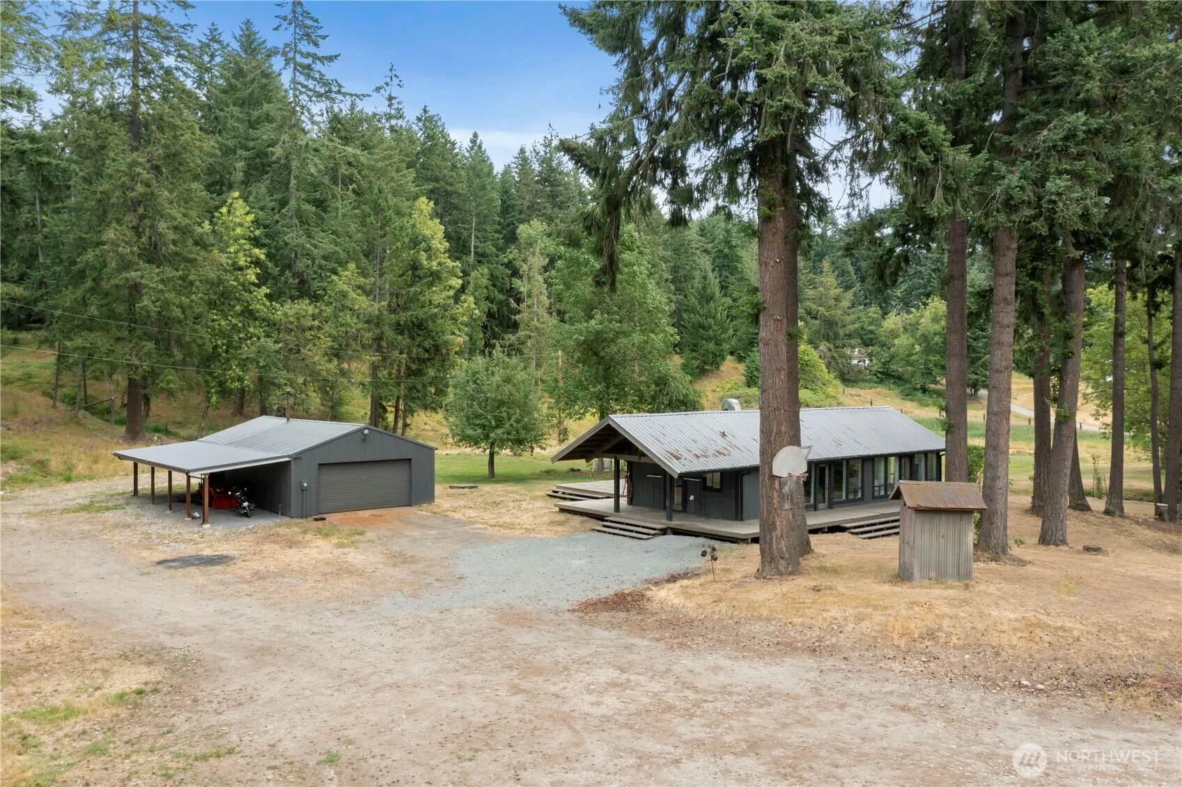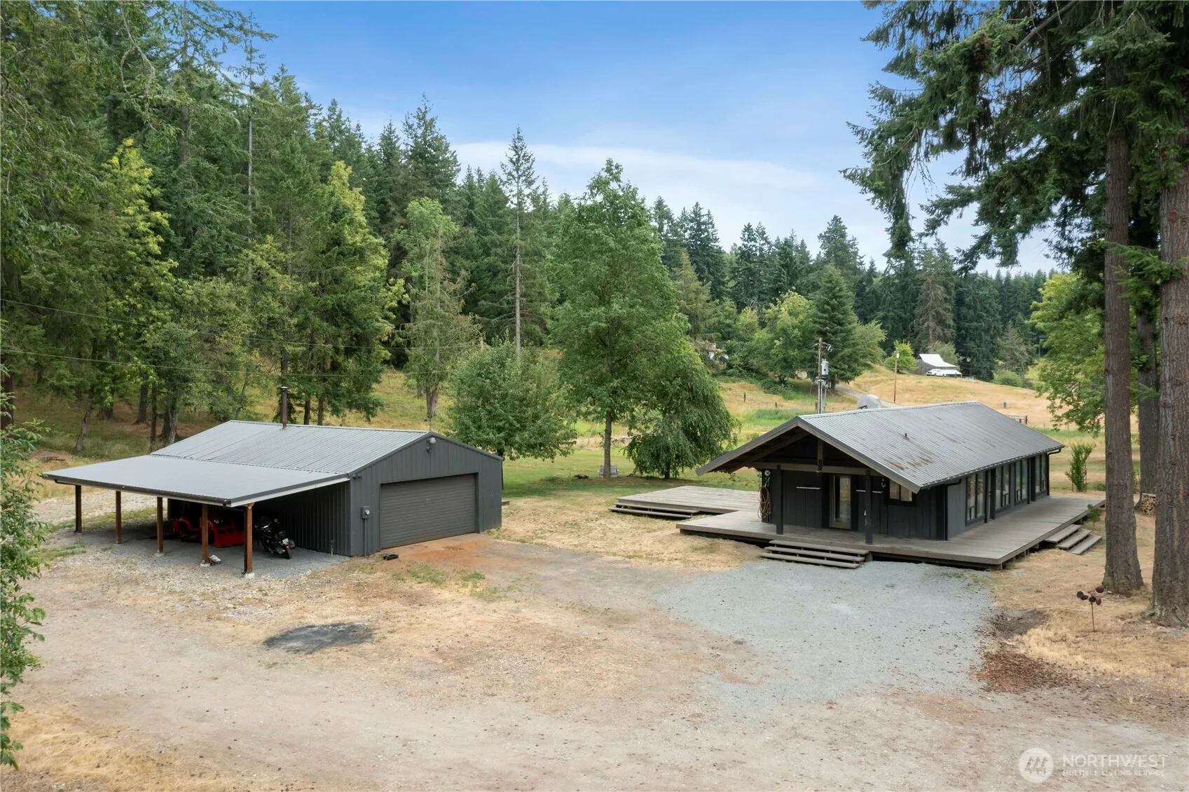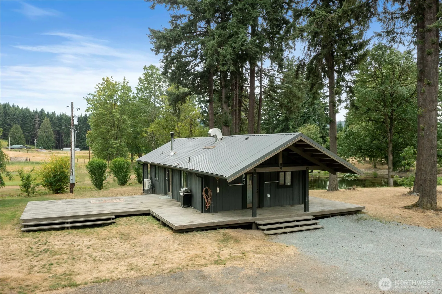 Escape to your own private retreat on 5 fully fenced acres! This serene property features a charming 2-bedroom cabin with a huge wraparound deck overlooking a tranquil pond—perfect for watching wildlife wander by. Inside, enjoy an open, light-filled living space with large windows that bring nature in, a sleek ductless mini-split for year-round comfort, stylish industrial-style plumbing, and a unique sliding barn door. The oversized detached 2-car garage has its own 220-amp meter—ideal for a workshop or hobbyist—and there’s additional covered parking for toys or equipment. With a durable metal roof, no HOA, and total privacy, this is country living with modern flair!