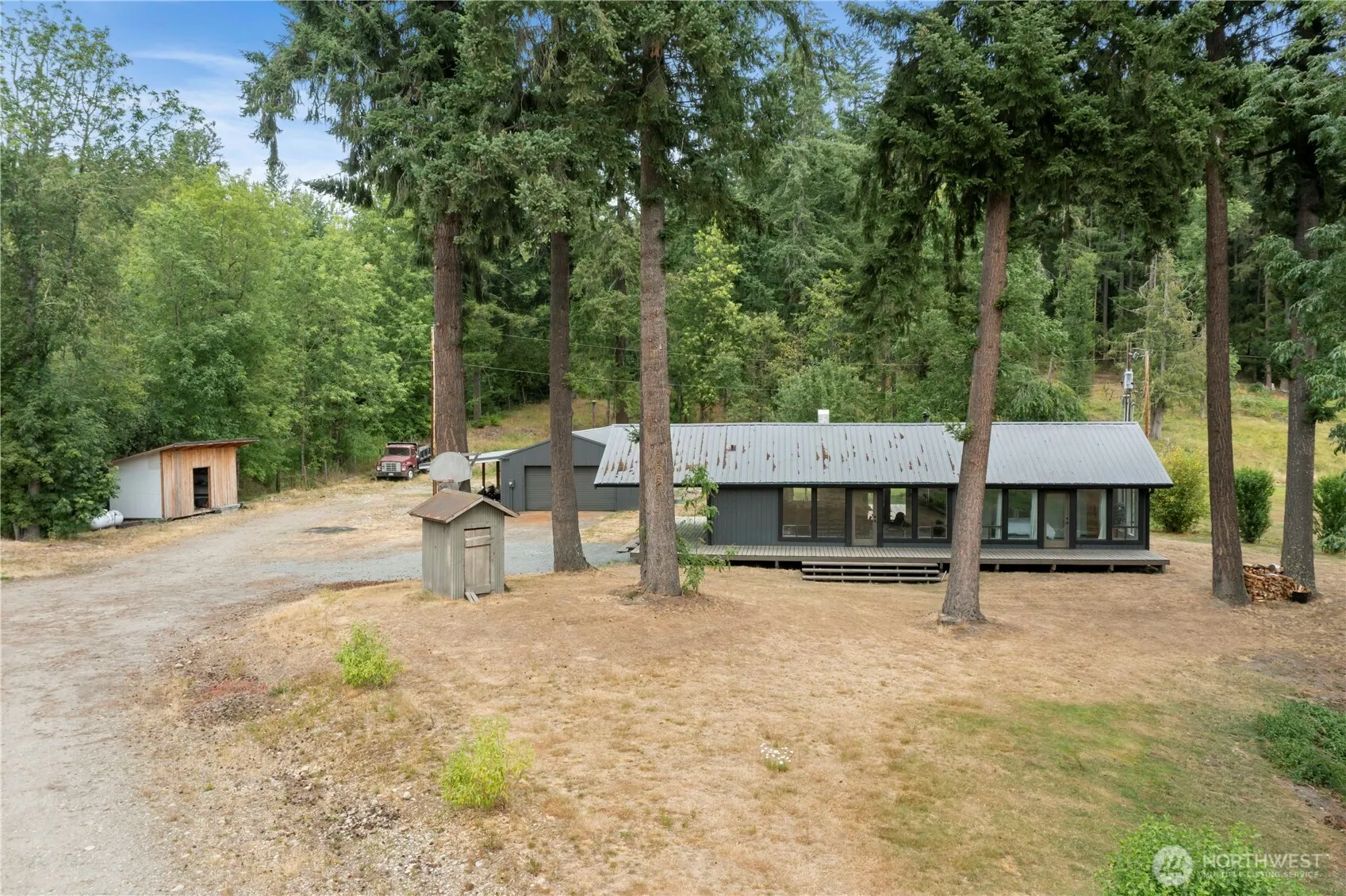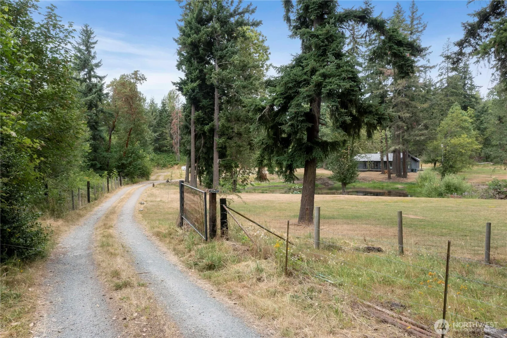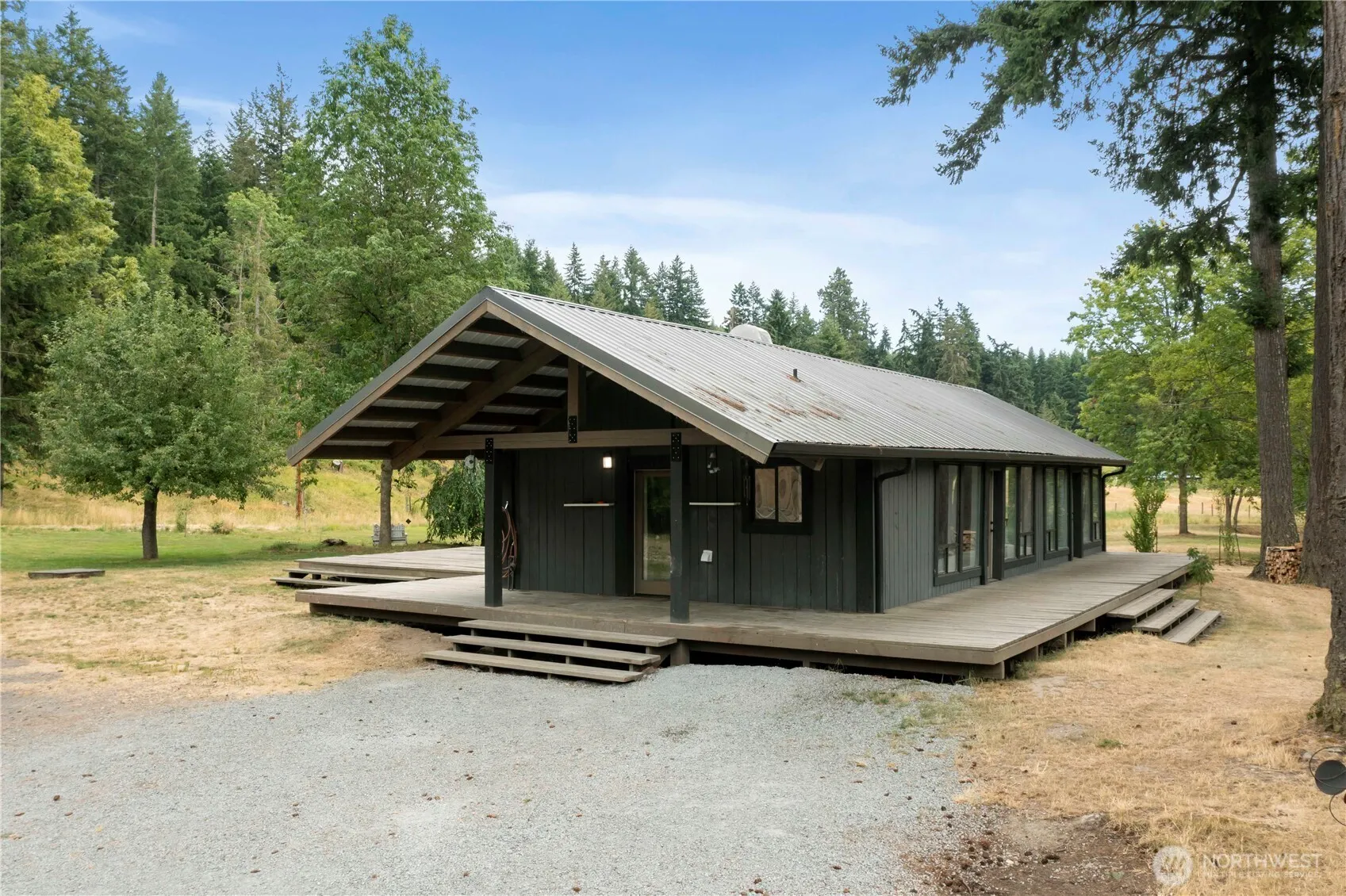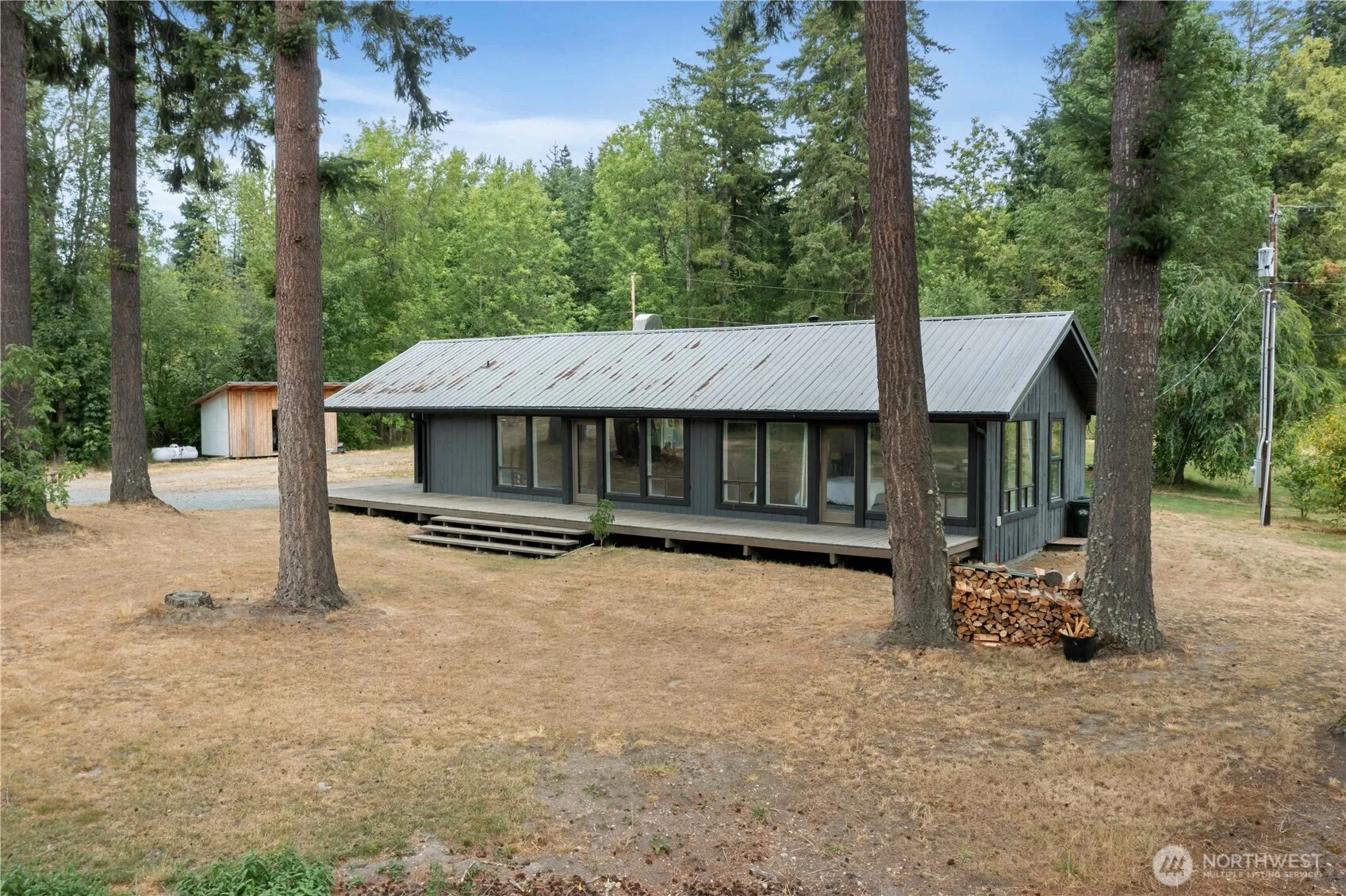 Escape to your own private retreat on 5 fully fenced acres! This serene property features a charming 2-bedroom cabin with a huge wraparound deck overlooking a tranquil pond—perfect for watching wildlife wander by. Inside, enjoy an open, light-filled living space with large windows that bring nature in, a sleek ductless mini-split for year-round comfort, stylish industrial-style plumbing, and a unique sliding barn door. The oversized detached 2-car garage has its own 220-amp meter—ideal for a workshop or hobbyist—and there’s additional covered parking for toys or equipment. With a durable metal roof, no HOA, and total privacy, this is country living with modern flair!