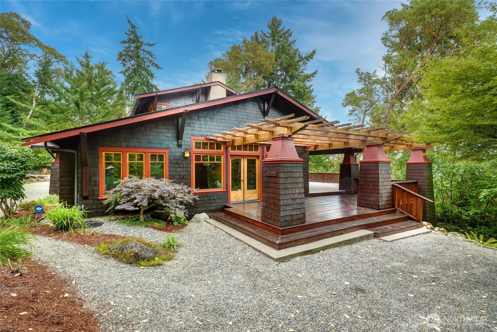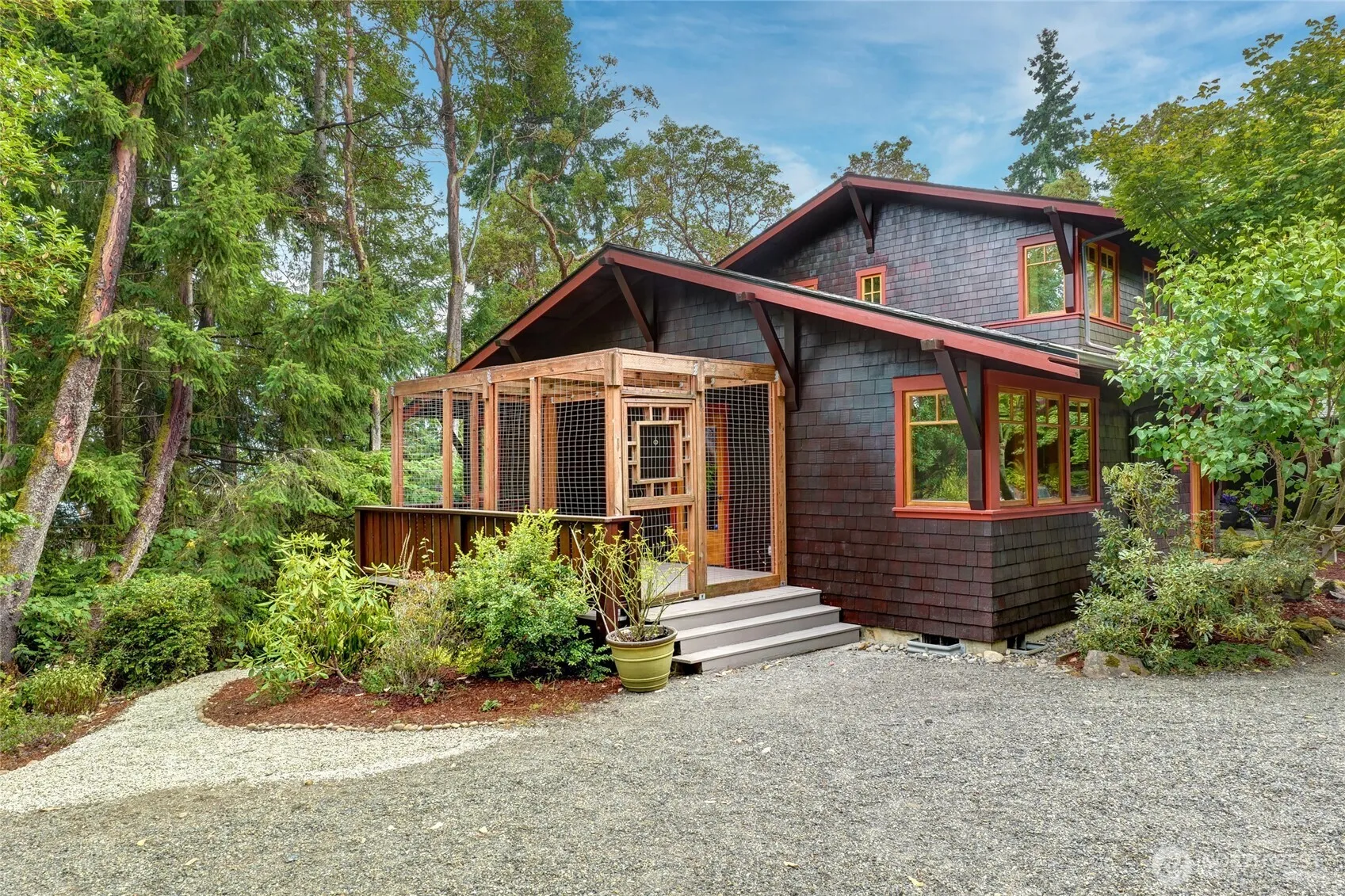Stunning views and thoughtful Craftsman touches from detailed finishings to cherry wood floors set this 3 bed 3 bath house apart. The wide-open kitchen is the heartbeat of this home with its centerpiece Tulikivi fireplace w/bake oven that can heat the whole house for 12hrs w/1 burn. The primary suite has a clawfoot tub, private balcony and beautiful views. Work out, create art or create an apartment in the fully finished basement, includes efficient Runtal heaters, custom sauna, 3/4 bath with imported tile and private entrance. Other features of this gorgeous home include, deluxe Catio, 24ft Yurt w/electric and private entrance on 94th. Fully groomed 1/4 mile trail with a view of the Sound and a quiet spot for a hammock.