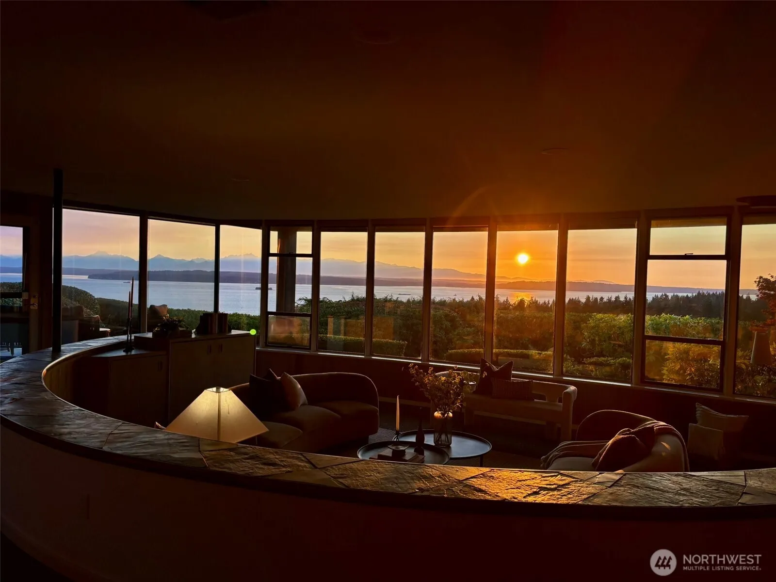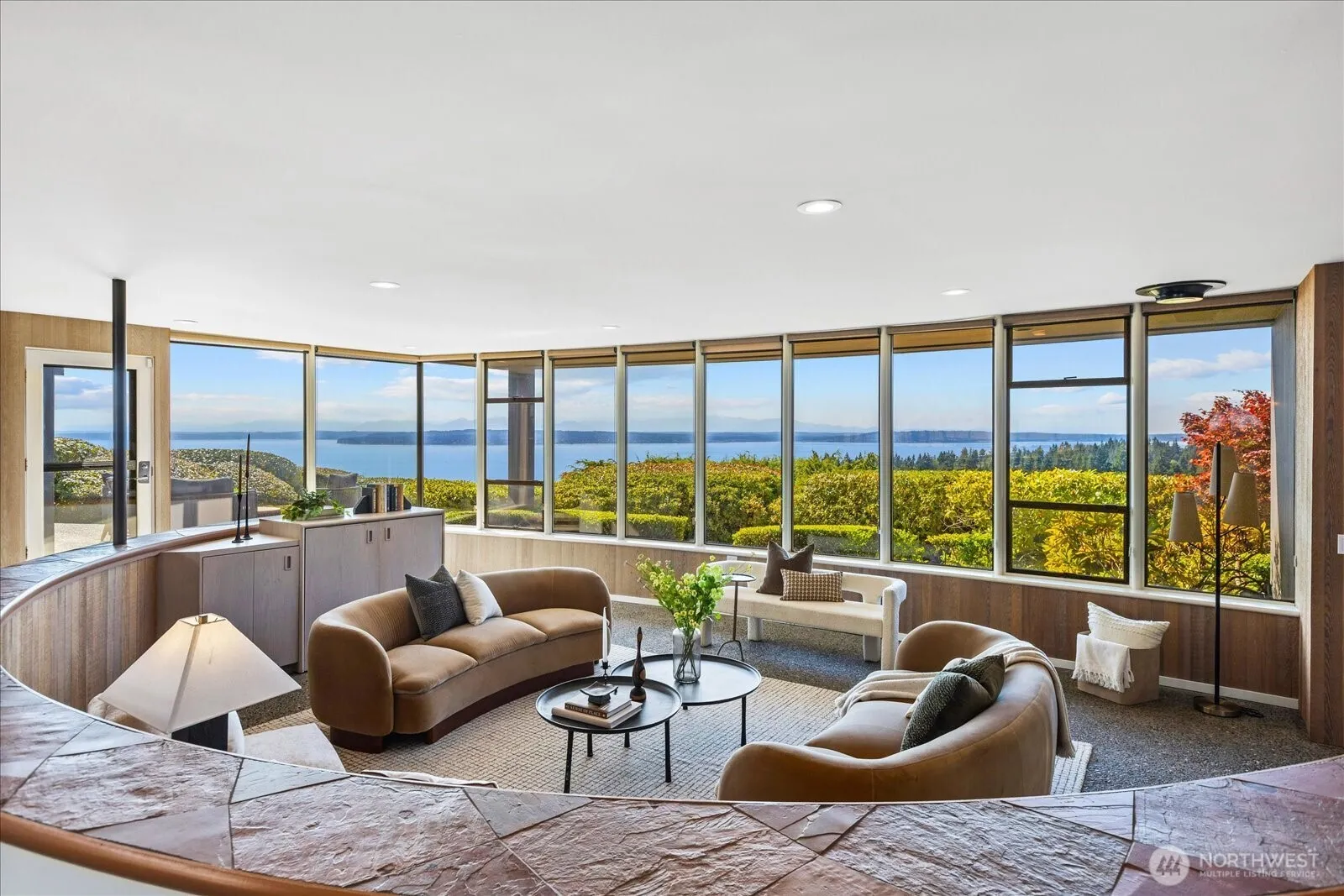 Experience the enchantment of living in the northwest in this architectural masterpiece with breathtaking Sound & mountain views. Crafted by award winning architect William Bastida, this impressive contemporary home was selected as an AIA 1983 home of the year. Capturing the essence of balance & harmony w/ its distinctive circular shape, you will love the large windows throughout flooding each space w/ natural light. The open concept living space & use of natural elements fosters grounding & peaceful presence. A perfect floorplan w/ mostly main floor living. Recently remodeled 3 bdrms/2 baths in the west wing & guest ensuite, bonus, utility & guest bath in the east. Extra rec rm/workout space below. AC! Photos have green grass enhancement.