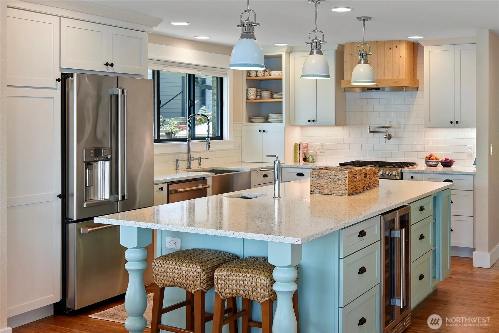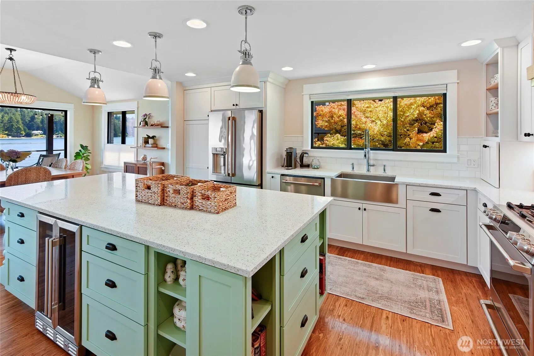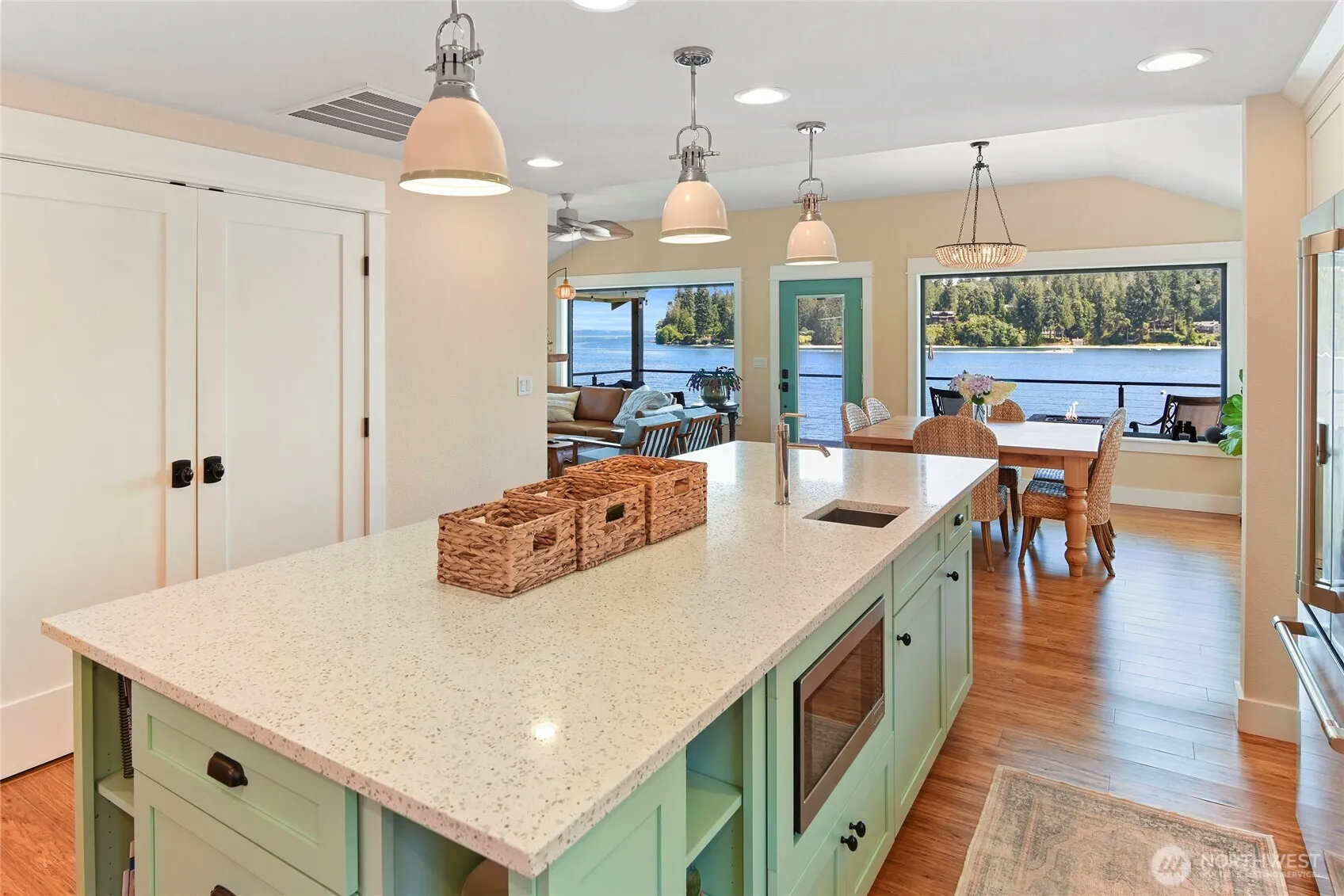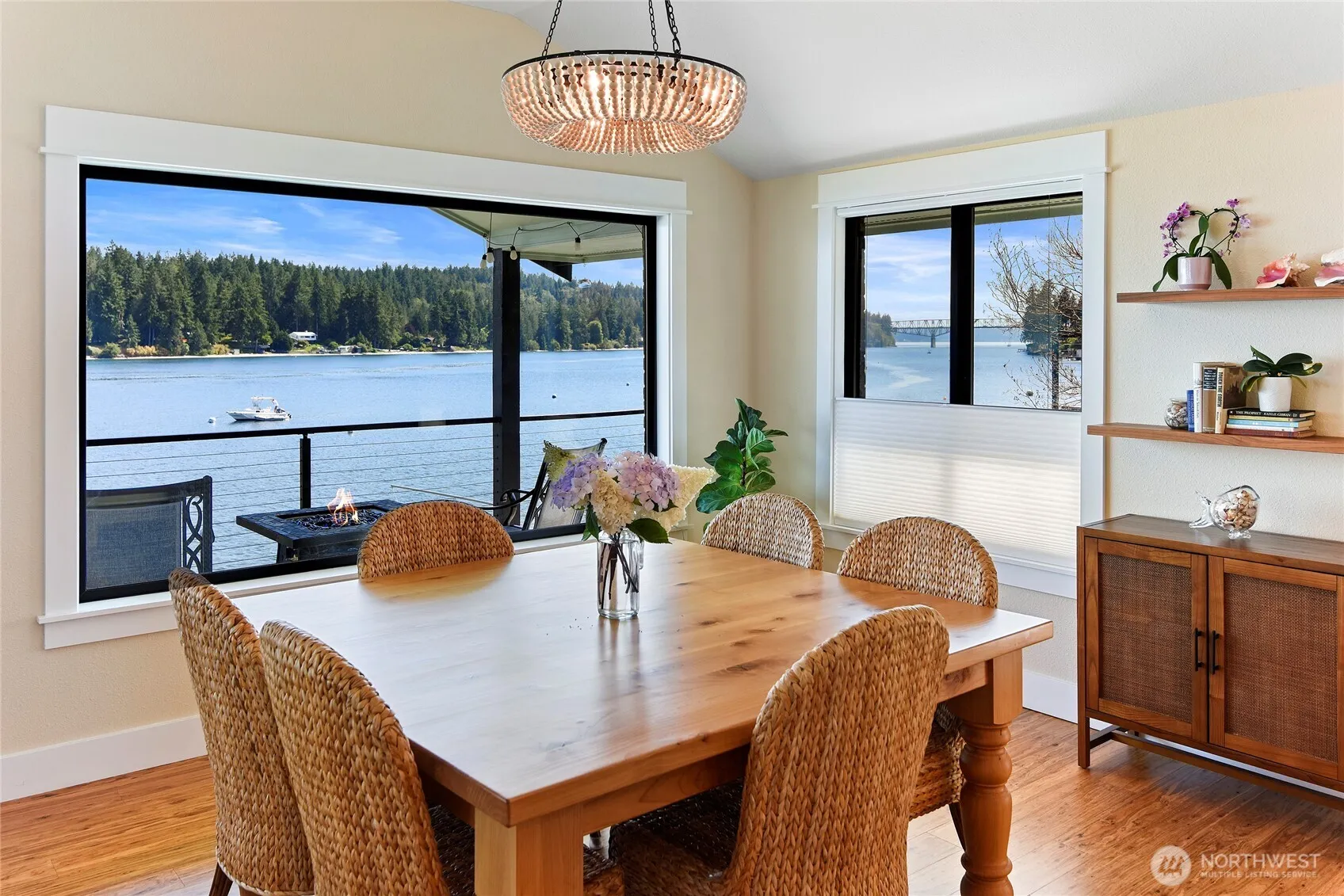 PANORAMIC view of Puget Sound from the Cascades to Agate Pass bridge! Rare sandy beach & water side dock, deep moorage buoy! Coastal beach décor and an independent guest cottage with separate address. Both fully renovated with quality sustainable materials and finishes in 2018 & 2020. Main floor primary with huge walk-in closet that includes W/D! Expansive kitchen with SMART appliances, two fireplaces, lower walk out level bedrooms and roomy work out space, large covered deck and patio. Mature landscaping, fruit trees, garden beds, roses, lavender, and floral beds! Lots of storage inside and out. Near downtown Suquamish, Poulsbo, Bainbridge Island, and Kingston. Access to multiple ferries nearby! Furnishings included! Fishing at its finest!