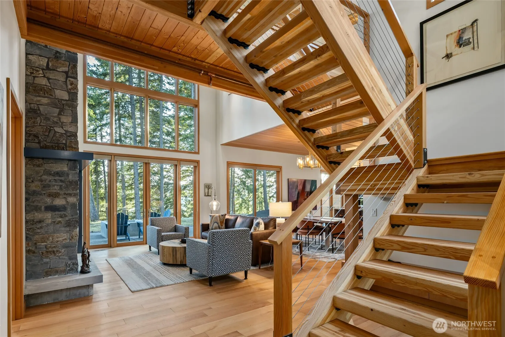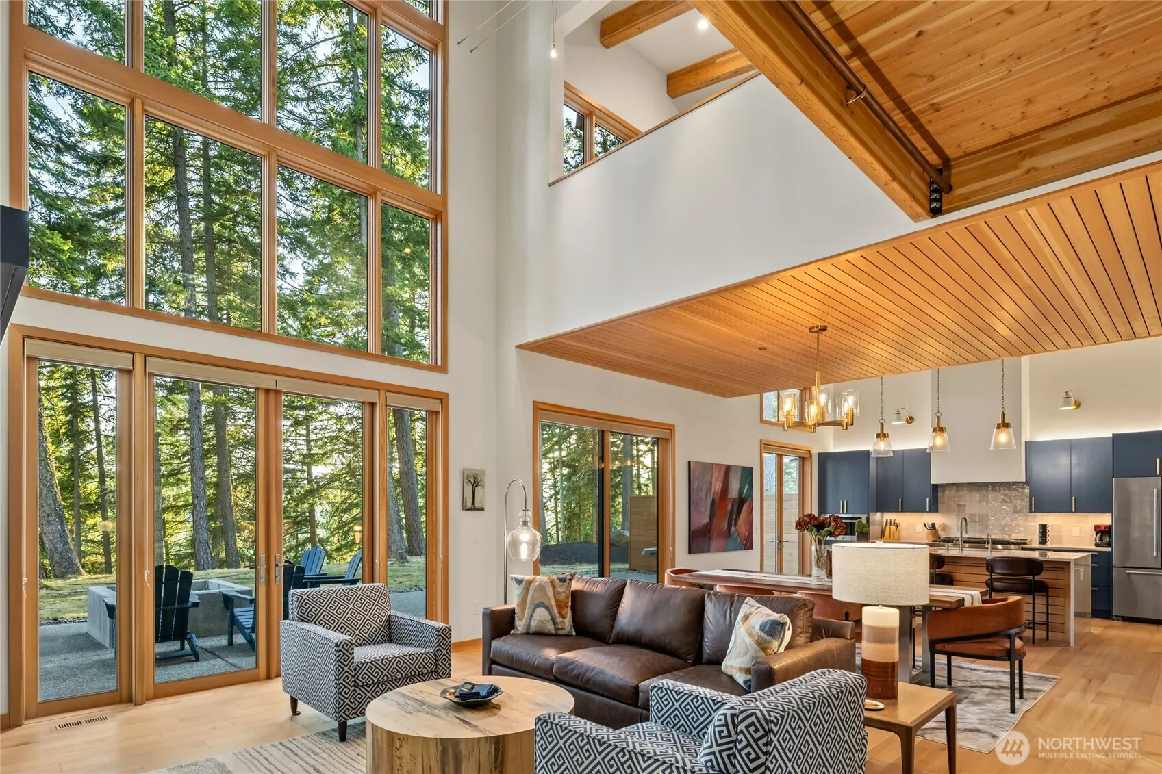 Sweeping mountain views and bold modern design define this 4-bedroom luxury retreat in Suncadia’s gated River Ridge neighborhood. Thoughtfully crafted for gathering, the home features an open great room with stunning beamwork, two primary suites, plus flexible bedroom, office, rec, and loft spaces. Walls of glass invite in southwestern light and frame views over the Cle Elum River Conservancy. The expansive patio—with privacy panels and a hot tub—seamlessly extends the living outdoors. Upstairs, a loft offers a second hangout or media space. Ideal for full-time living or a second-home escape. Nearby trails connect to membership pools, the river, dining options, the historical town of Roslyn, and so much more.