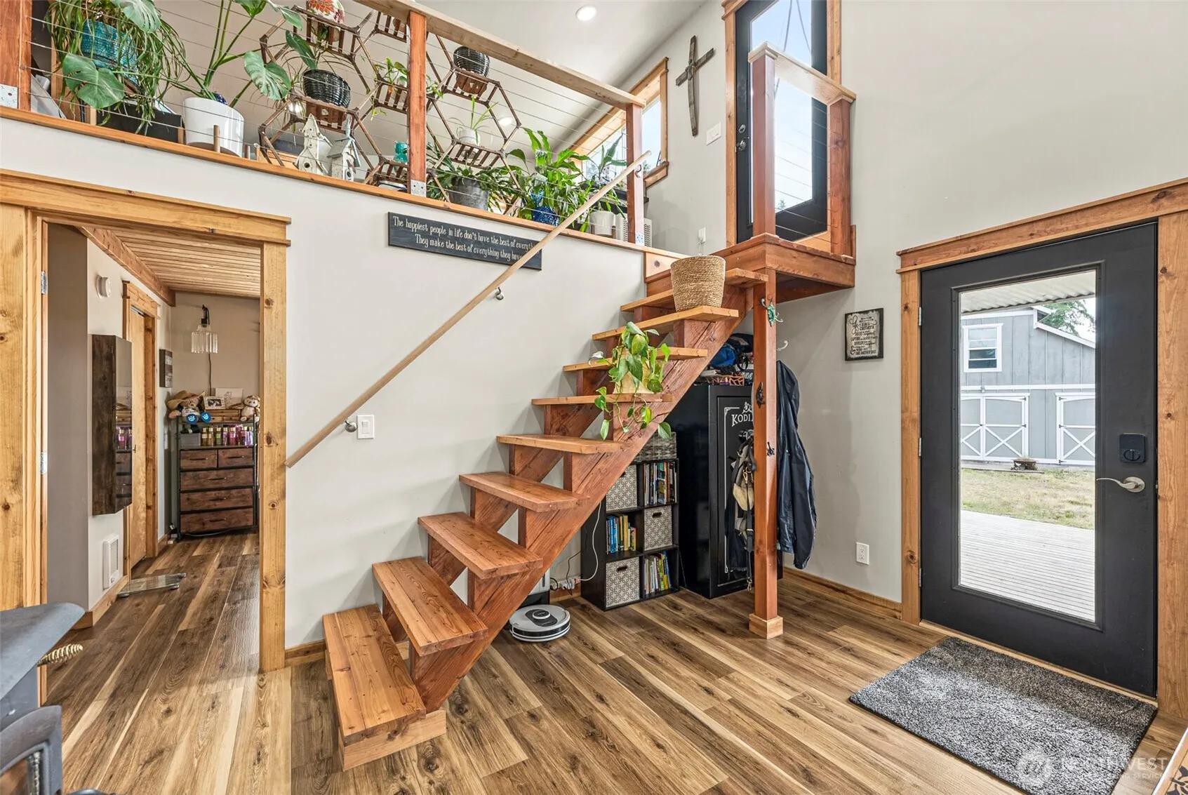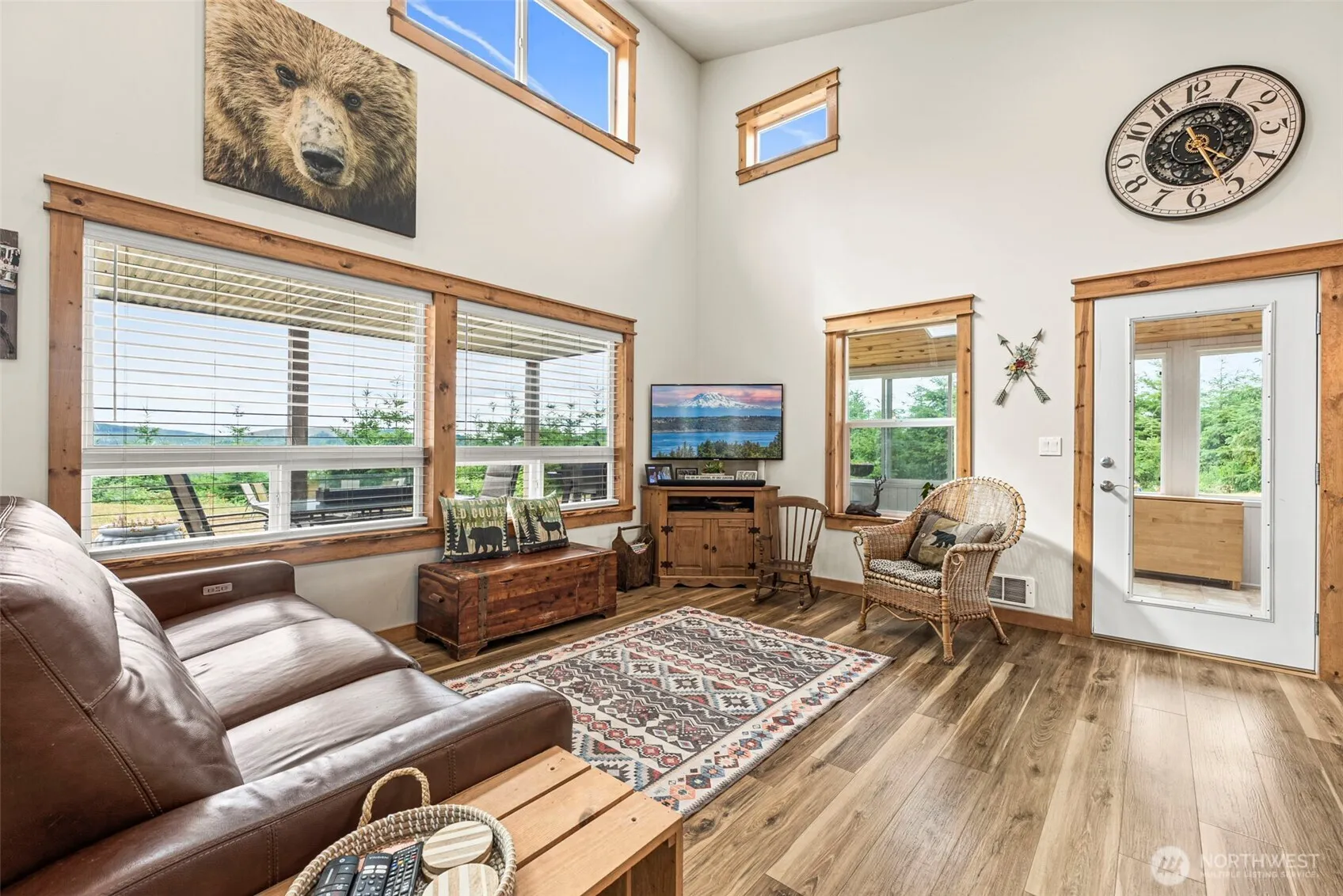 Perfect Blend of Comfort, Design & Nature. Fully custom cabin (1014 sf) overlooking Alder Lake (plat has legal access to Lake). Full time living, vacation home or STR opportunity, your imagination is your only limits. 1 bdr + Loft W/ great lake views, WIC, beautiful woodwork. Loft, currently used as office/extra room W/ great lake views. Amazing bath W/direct access to bedroom. Dream kitchen with large butcherblock island W/seating. Sunroom (200 sf) could be playroom, dining rm, ect. Wdstv heats entire space. Tons of decks to enjoy the wild life, sunsets, lake view, stars, ect. 836 Sq. Ft. insulated Barn/Shop has a finished upper floor. RV parking W/30 amp. Cabin could be ADU & still build your Custom Dream Home. Electric Gated Entry.