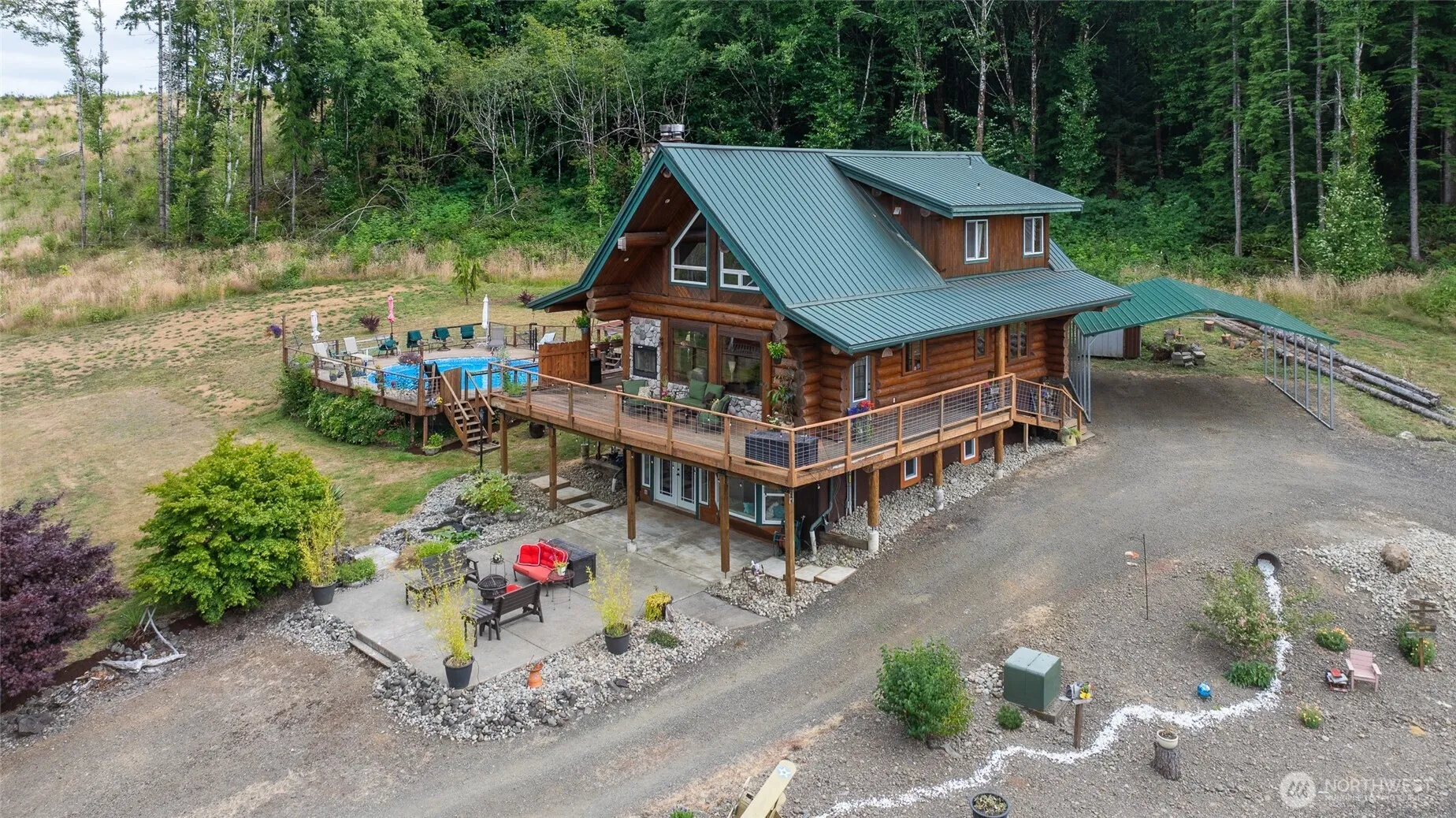 Custom Built Northern Canadian Spruce LOG HOME nested in the trees! Sitting 15 min from town on over 7 acres, this beautiful home includes 3 bdrms plus a flex rm, 3 bathrms, loft area, sitting room, custom built dining table that converts off the kitchen island, & a two-sided fireplace to enjoy inside or out on the wraparound deck! For the warmer days go outside & jump into the 26 ft POOL w/ its own wrap around deck & slide. Or on cooler days enjoy the hot tub! Property includes a detached 1,080 sf 2-story shop, garden space & fruit trees that include strawberries, blackberries, marionberries, cherry, apples, blueberries, & a grapevine! Just up the street is a General Store and school serving K-12. This property is a Entertainment Haven!