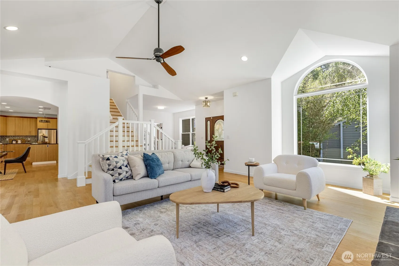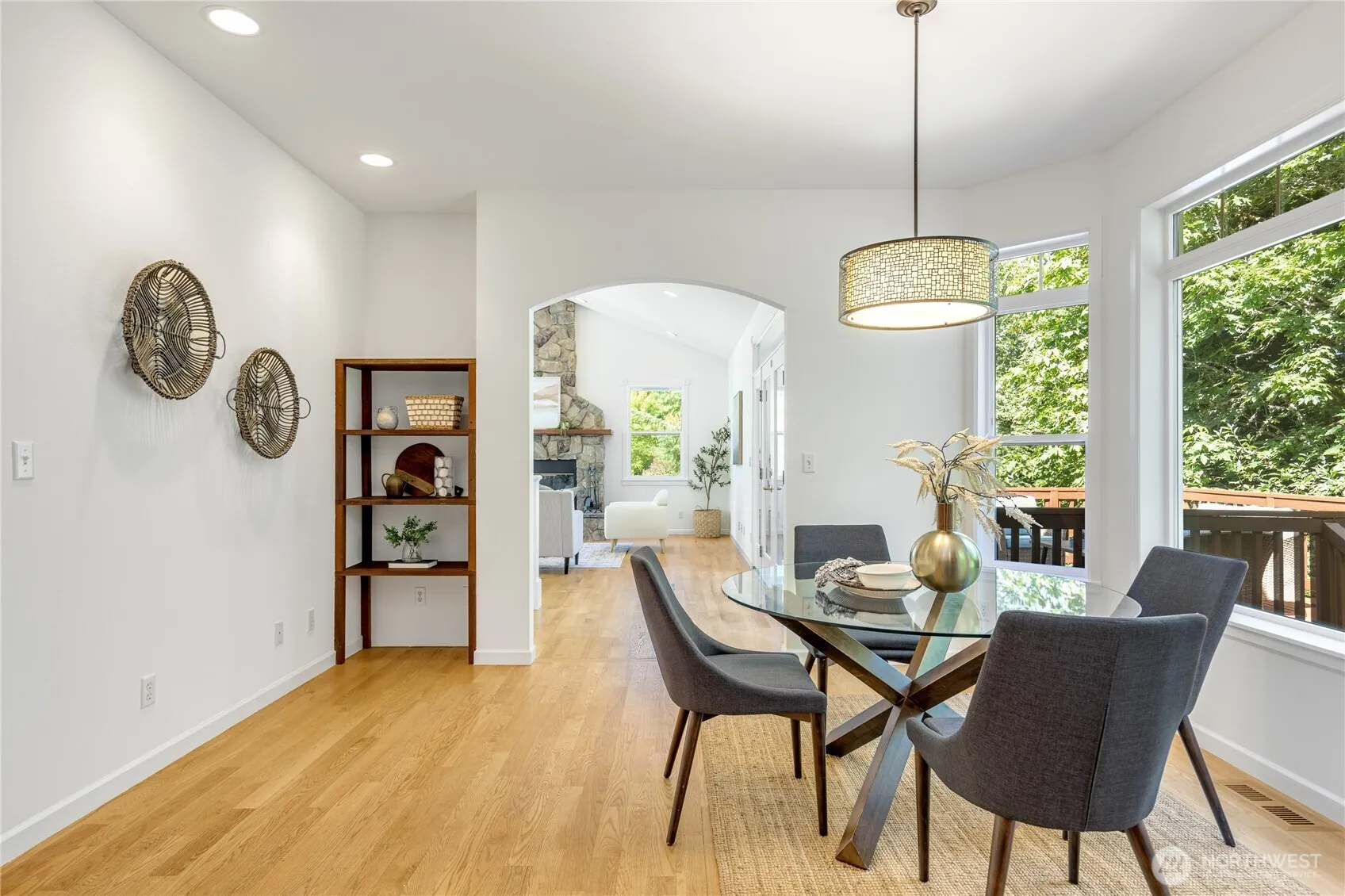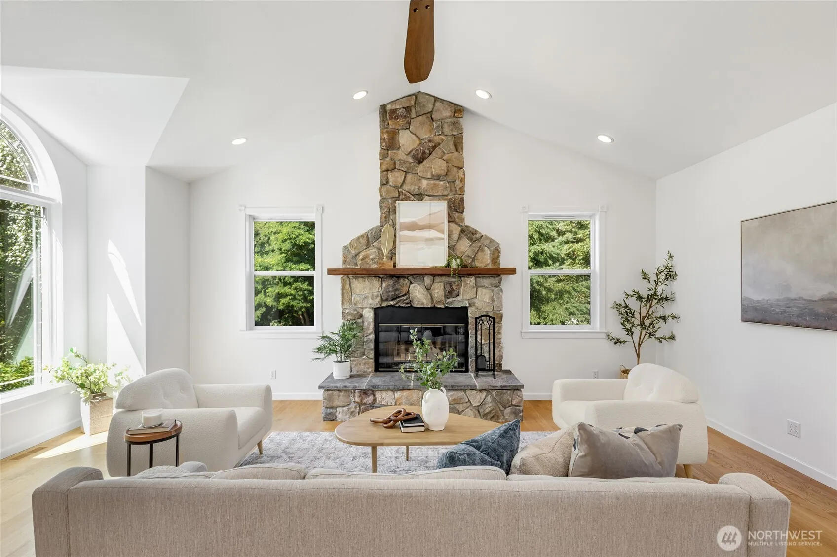 Lovely light-filled home close to downtown Winslow and the ferry. Perched atop a quiet cul-de-sac and adjacent to almost an acre of open space, this home offers privacy and an extended backyard without the maintenance. Impressive living spaces with vaulted ceilings and a wall of west-facing windows overlooks the open space. Updated kitchen with newer appliances including an induction cooktop. Four bedrooms all upstairs with a private main floor office and a lower level family/bonus room. Private back deck, patio and space for a play structure or fire pit. Mature landscaping with irrigation surrounds the home and offers nice privacy. Over-sized 2-car garage with a flat driveway and nice work benches + shop space. A terrific in-town package.