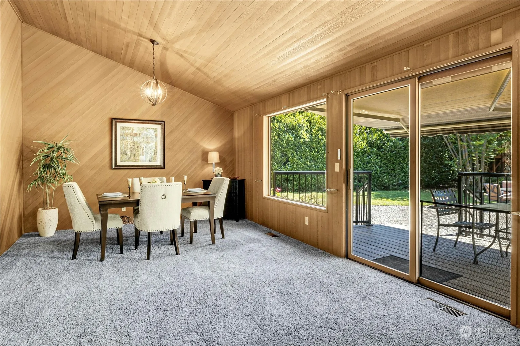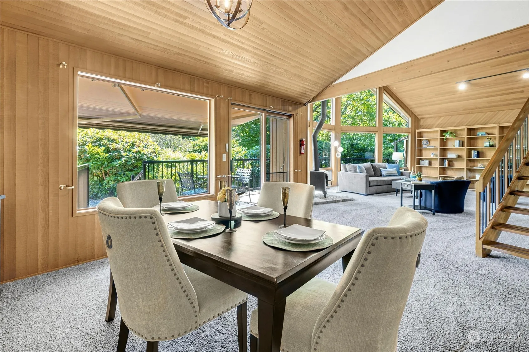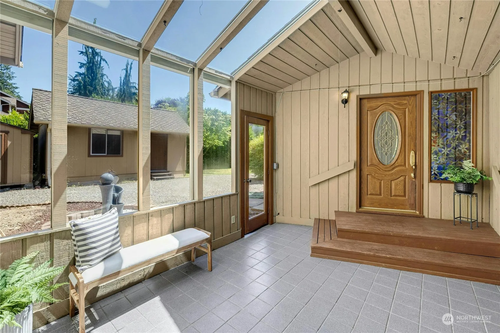 Space, space, space! This acre+, 3 bed-2.25 bath, gated property is waiting for you. From the enclosed breezeway, enter the home to the right. Soaring ceilings and windows draw you into the living room. The primary bedroom with ensuite bath lives at the peak of the home and includes a charming private deck. 2 BR with .75 bath + powder room near kitchen round out the main floor. Flex space above garage w/ separate entry is perfect for a secluded, 2 room home office, art studio, or a fun gathering place. Celebrate our beautiful Northwest weather; relax in the solarium, BBQ on the back deck and explore the winding garden paths. The property includes outbuildings (1 finished) & a treehouse. New septic 2024. Heat pump for efficient heat and a/c.