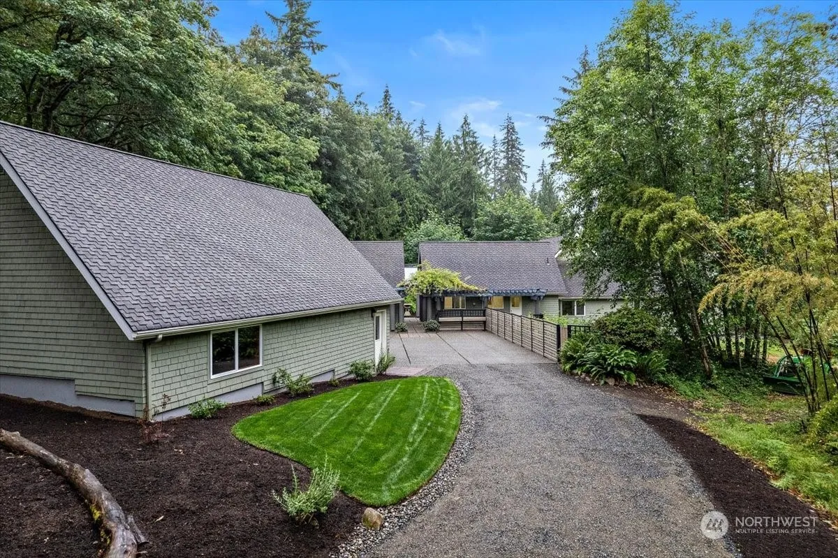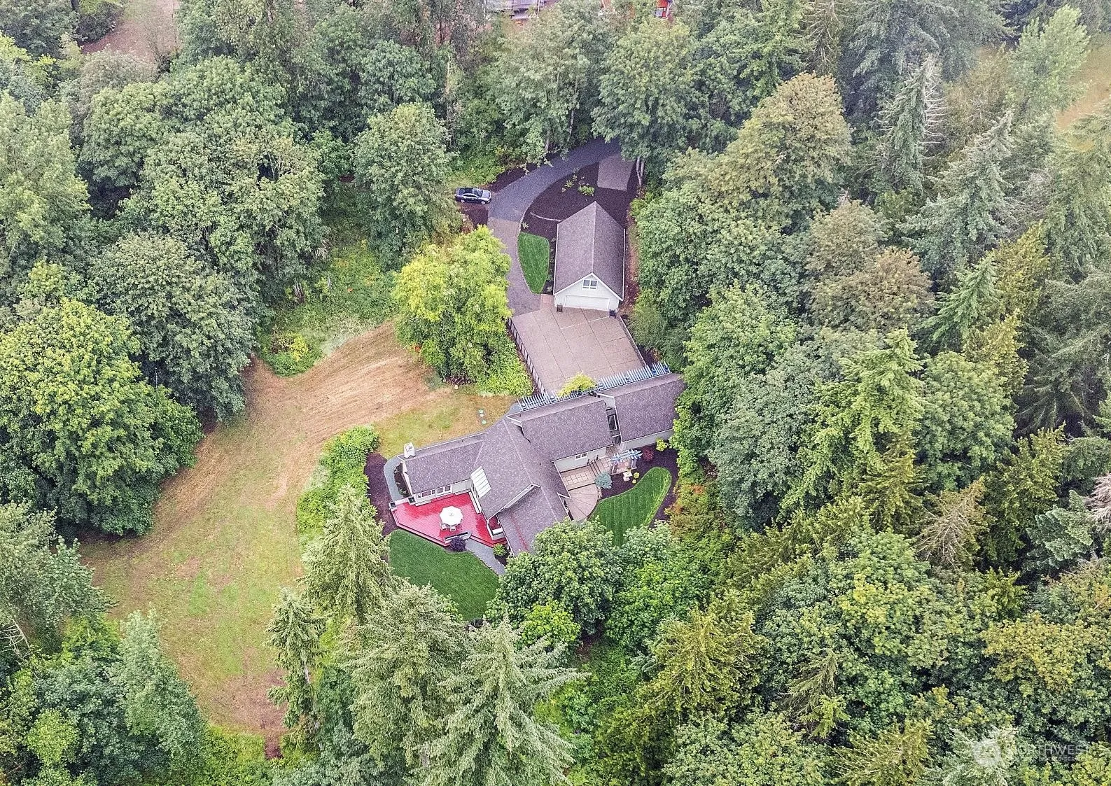 Nestled on a serene 5-Acre Private Estate, This Pacific NW Contemporary home offers unparalleled Natural Beauty & Tranquility. The Focal point of the Formal Living Rm is the Architecturally Designed Floor-to-ceiling brick fireplace, Complemented by Soaring ceilings! Open Concept Kit & Dining area features Skywall Windows that flood the space w/natural light. Updated Primary Suite boasts Cathedral Ceilings, Cozy Fireplace, Updated en-suite Bath is a retreat in itself! Featuring a Massaging shower, Rain head, Soaking tub, & Luxurious Tile finishes. A substantial Main Floor BONUS rm spanning 506 sqft serves as a versatile space, ideal for Art studio,Media room, or Extended Living. Detached 2 Car Gar/Shop w/living quarters.Easy Equestrian land