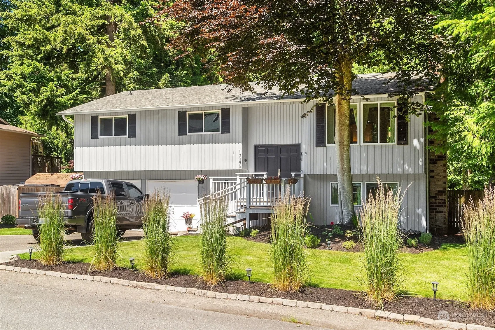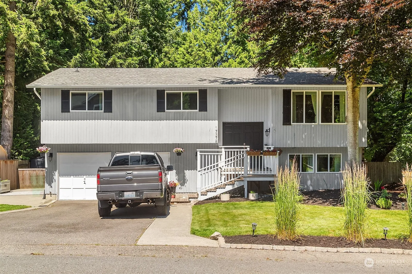 An outdoor living oasis majestically set on a sunny, level & private .27 acre cul-de-sac lot backed to lush evergreens in Cottage Lake, this spacious 2168sf 4 bed 3 bath mid-entry charmer boasts dual ensuites & an absolutely stunning new multi-level dream deck! Sunken living room with picture windows & floor-to-ceiling arched fireplace with floating wood beam mantle. Gorgeous white kitchen with stainless steel appliances & peninsula bar opens to formal dining with showcase chandelier. Move-in ready with updated baths & laundry room. Ideal multi-generational setup features lower level with huge family room, 2nd fireplace, bonus flex-space, secondary suite & ample storage. Sprawling yard with playground & RV/boat parking. Prime Schools & A?C!