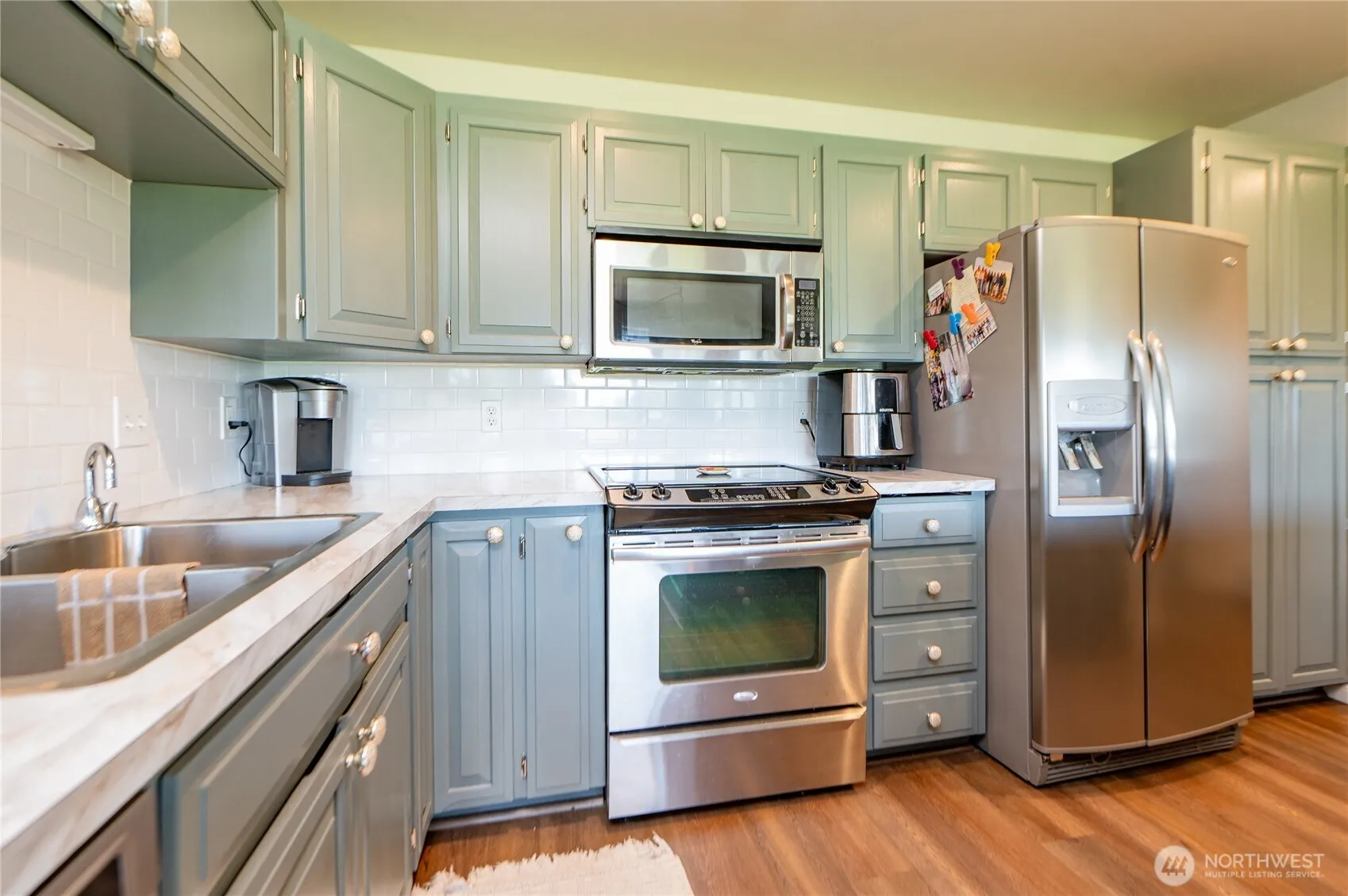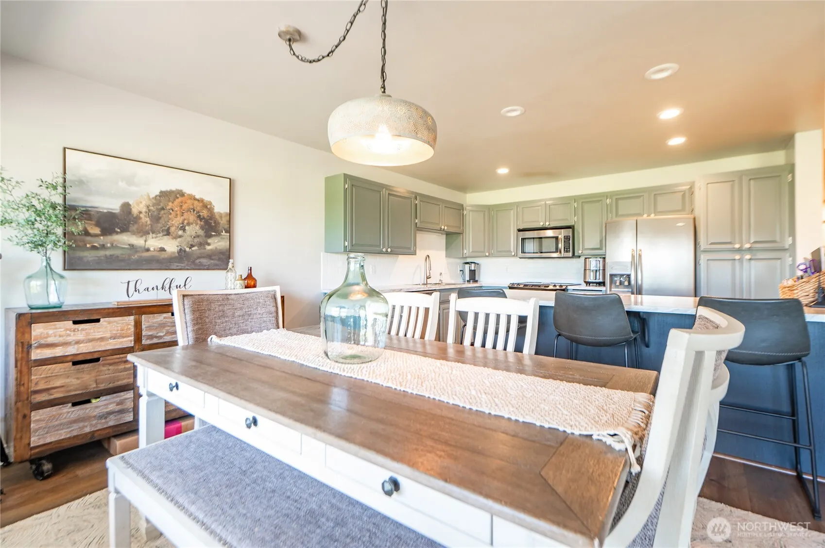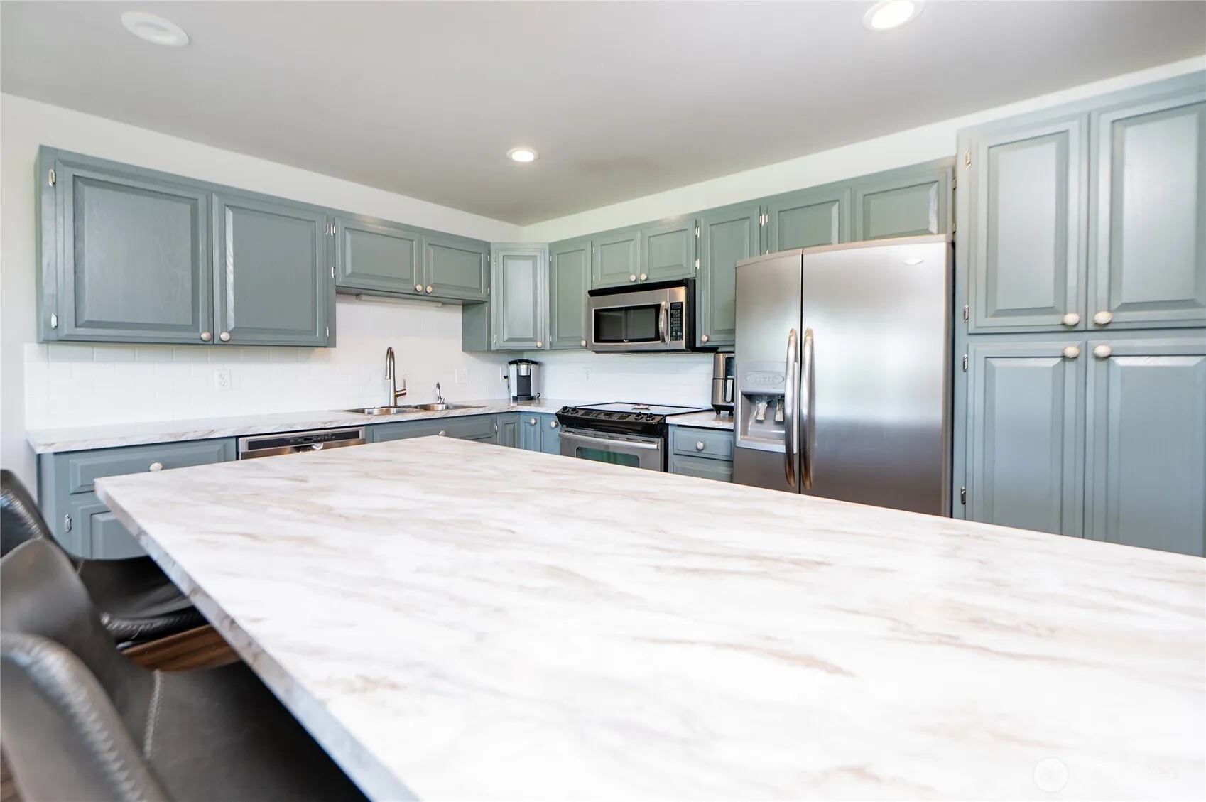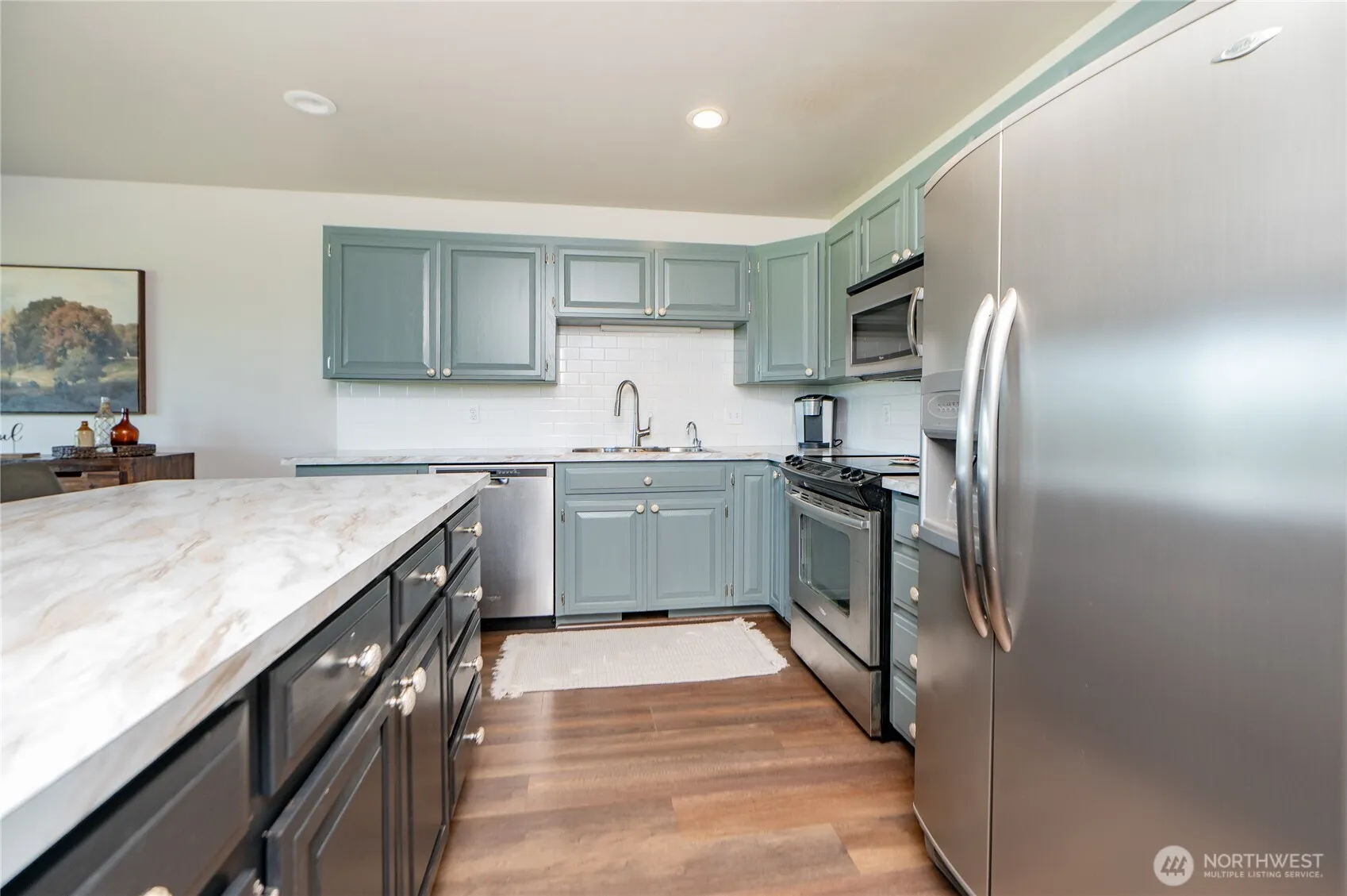 Enjoy stunning territorial views from this spacious and light filled 2 bed, 3 bath condo. Designed for comfort and convenience, this home features an open-concept living area, a well-appointed kitchen w/eating bar and a generously sized primary bedroom with an ensuite bathroom. Unit has been recently updated with new hardwood laminate flooring/trim, fresh paint, new kitchen counter tops and light fixtures. Lower level offers a bonus/rec room with a 3/4 bath, adding extra flexibility for guest or entertaining. Large windows and a private balcony invite natural light and frame the scenic surroundings, plenty of storage in the oversized 2 car garage, prime location within walking distance to downtown Lynden.