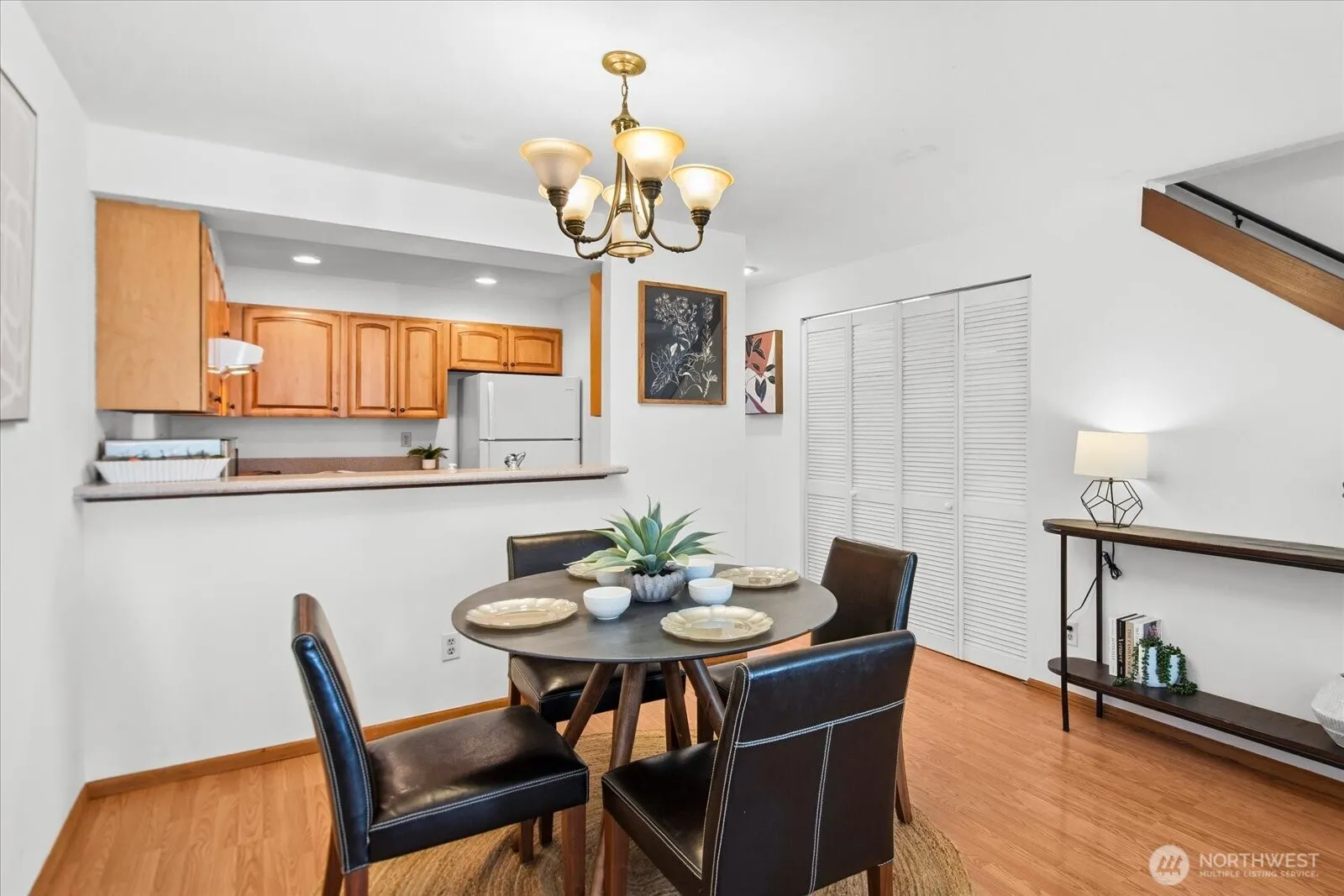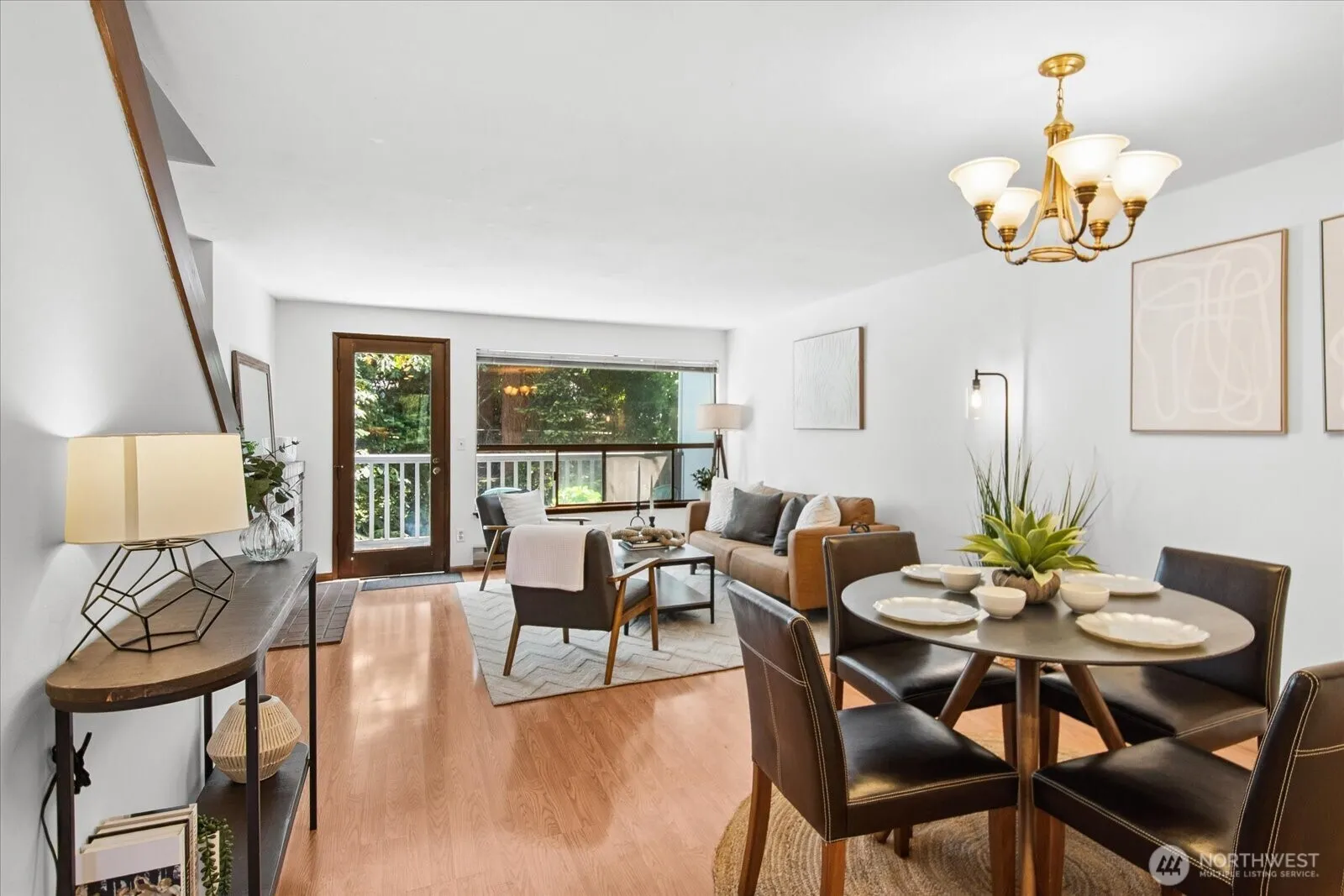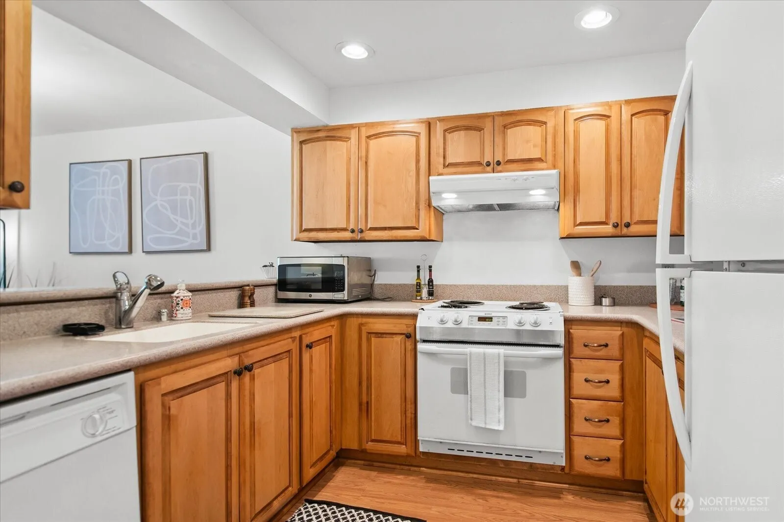 Welcome to this peaceful townhome! Located on the top two floors of a quiet three-story building, this spacious home features bright laminate floors and an open living/dining area that flows into a freshly updated kitchen with newer cabinets and sleek Corian countertops. Main level also boasts a powder and cozy wood burning fireplace. Relax and sip a beverage of your choice on your private deck surrounded by trees. Upstairs, enjoy a full bath with dual vanities and a dressing area. 2 miles from the light rail as well as the beach, this home is located near a mix of everyday conveniences and outdoor escapes that make life a little easier and a lot more enjoyable.
