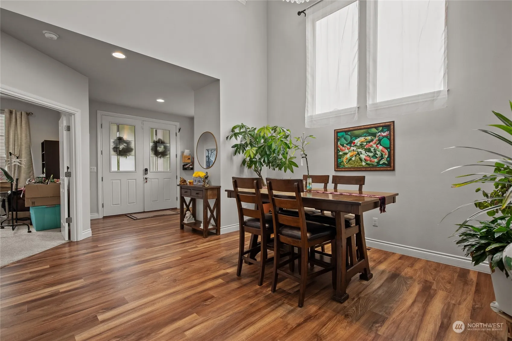 Step into luxury living in the sought-after Vinterra community! This 2-story gem offers 5 bedrooms, including 2 primary suites with attached baths and spacious walk-in closets. Work from home in the convenient office room, or entertain effortlessly in the expansive kitchen and family room area. With a large 2-car garage, ample storage in the crawlspace, and a custom chandelier illuminating the high-ceiling entryway, this home exudes elegance. Step outside to enjoy the artificial turf backyard and relax on the small deck, or indulge your green thumb in the side garden space. Don’t miss your chance to own this exquisite property!