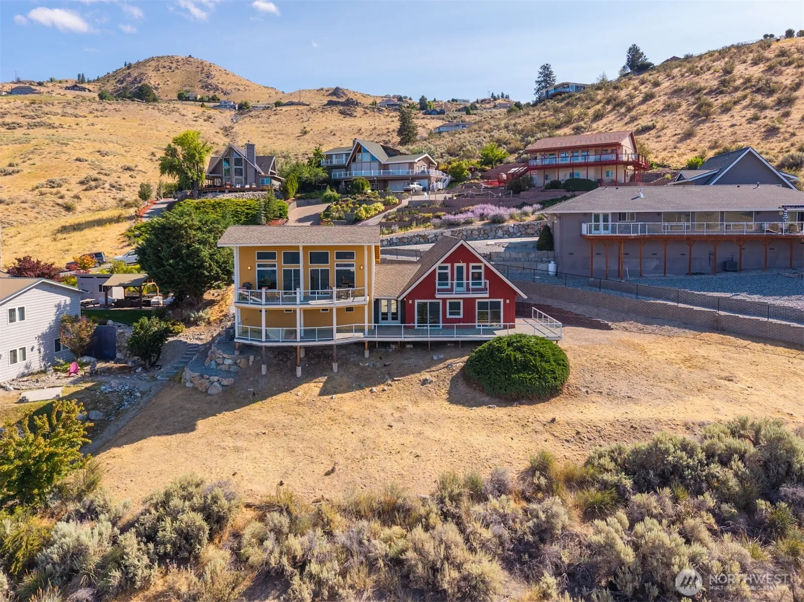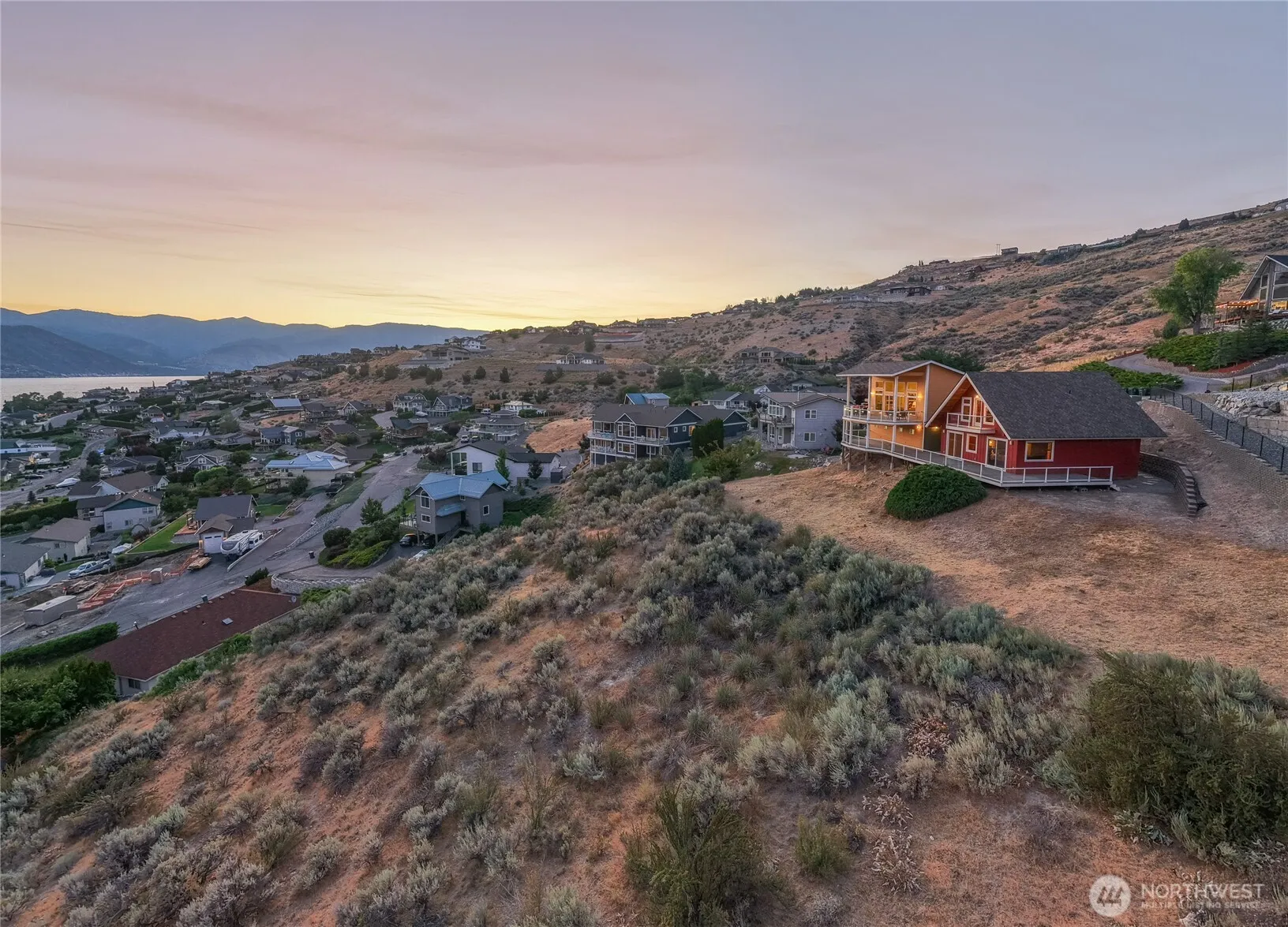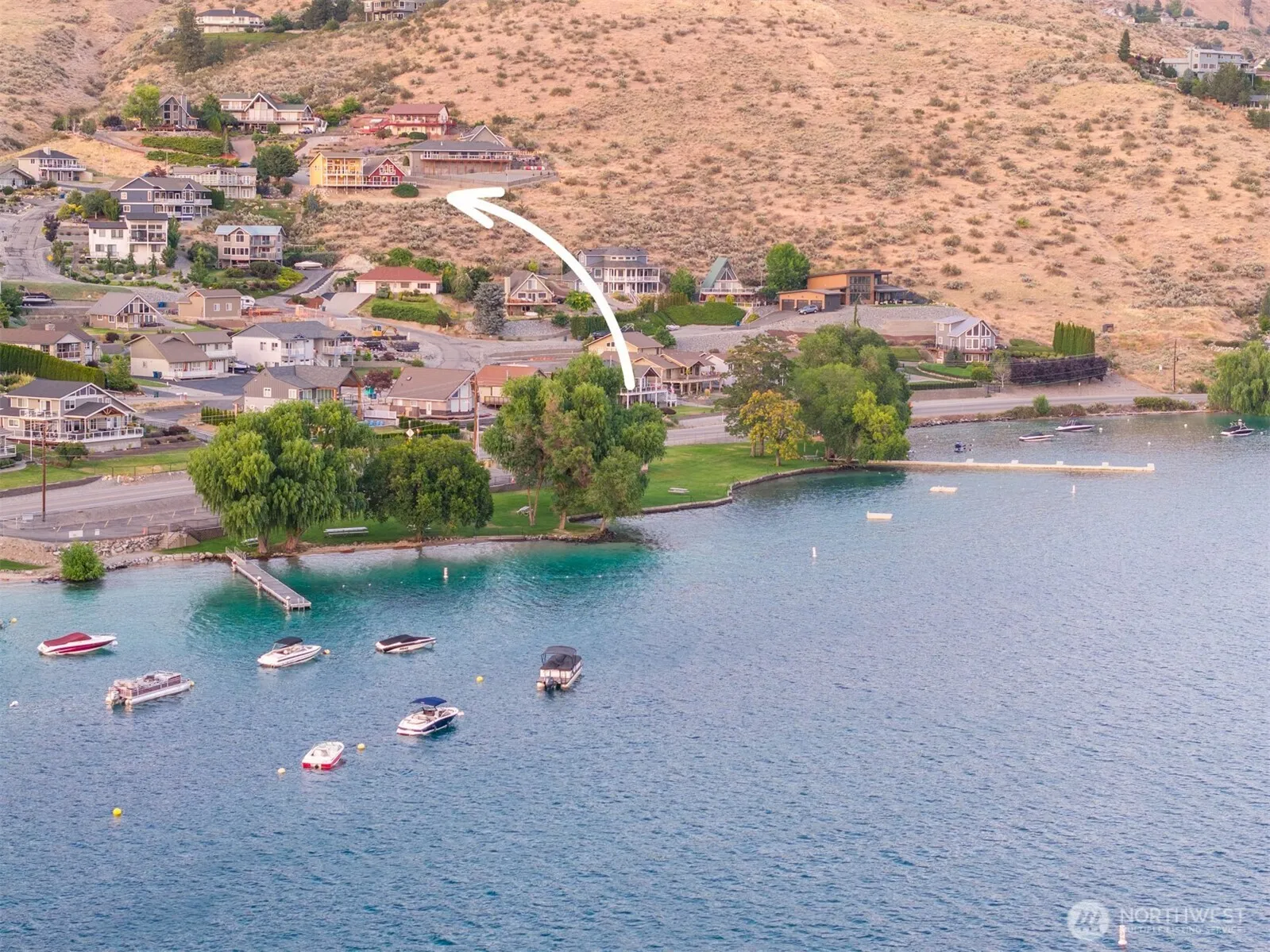 Spectacular unobstructed views of Lake Chelan from 106 Eldorado Pl, located in the highly sought-after Chelan Hills Div 3. This community waterfront home effortlessly blends a 1975 remodeled A-frame cabin w/ a 2007 built contemporary 2-story home, connected by a breezeway. Turnkey home is ideally designed to host big groups (sleeps 12), all 4 bedrooms separate from the upstairs open-concept great room & entertaining areas, making it a perfect vacation getaway. Outside showcases multi-story trex decks offering views from every vantage point & shade, a low-maintenance landscape, & a heated driveway. Home is at the end of a cul-de-sac, & minutes walking distance from Willows Park-private beach. Best Community Waterfront amenities in Chelan.