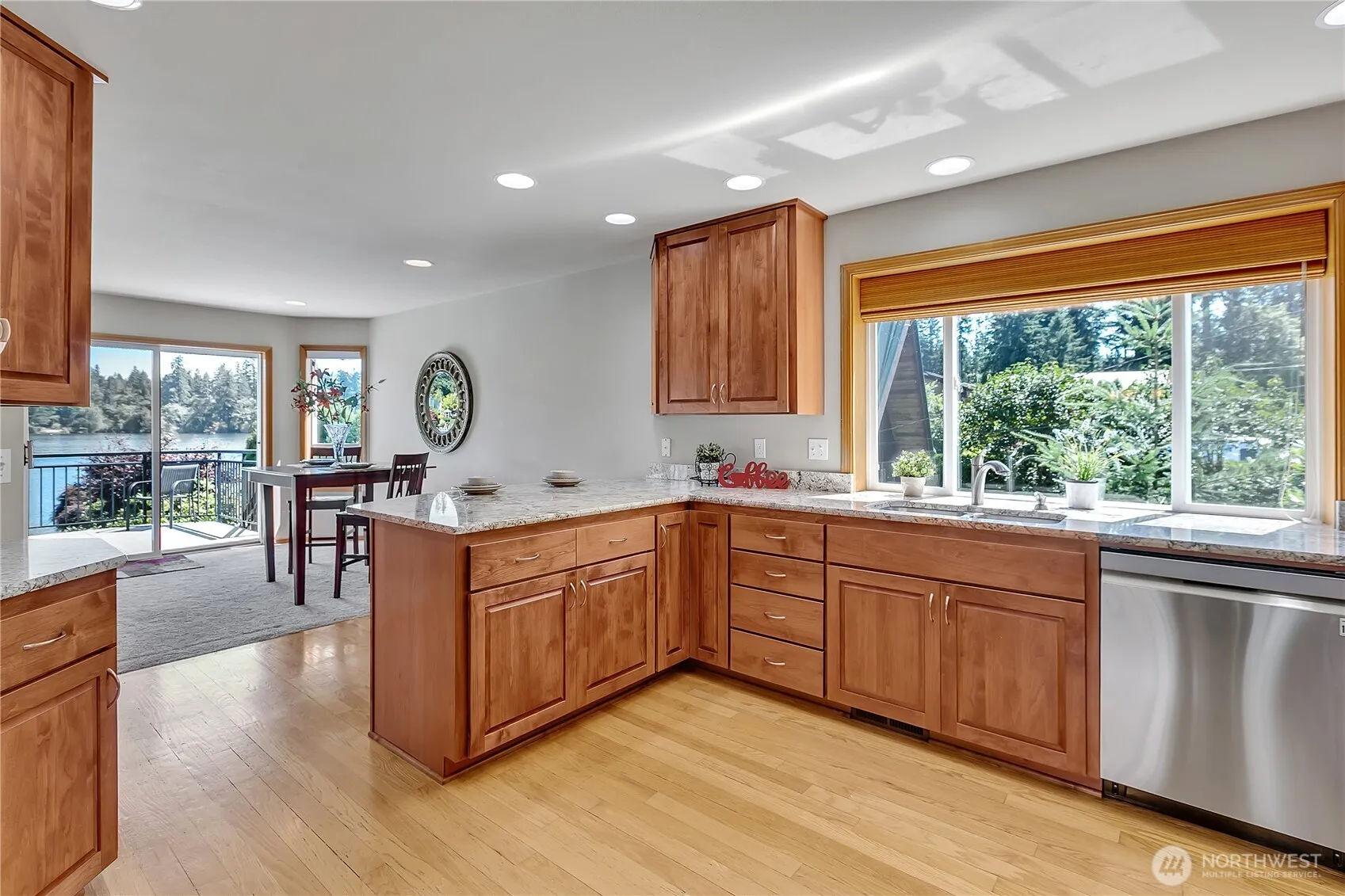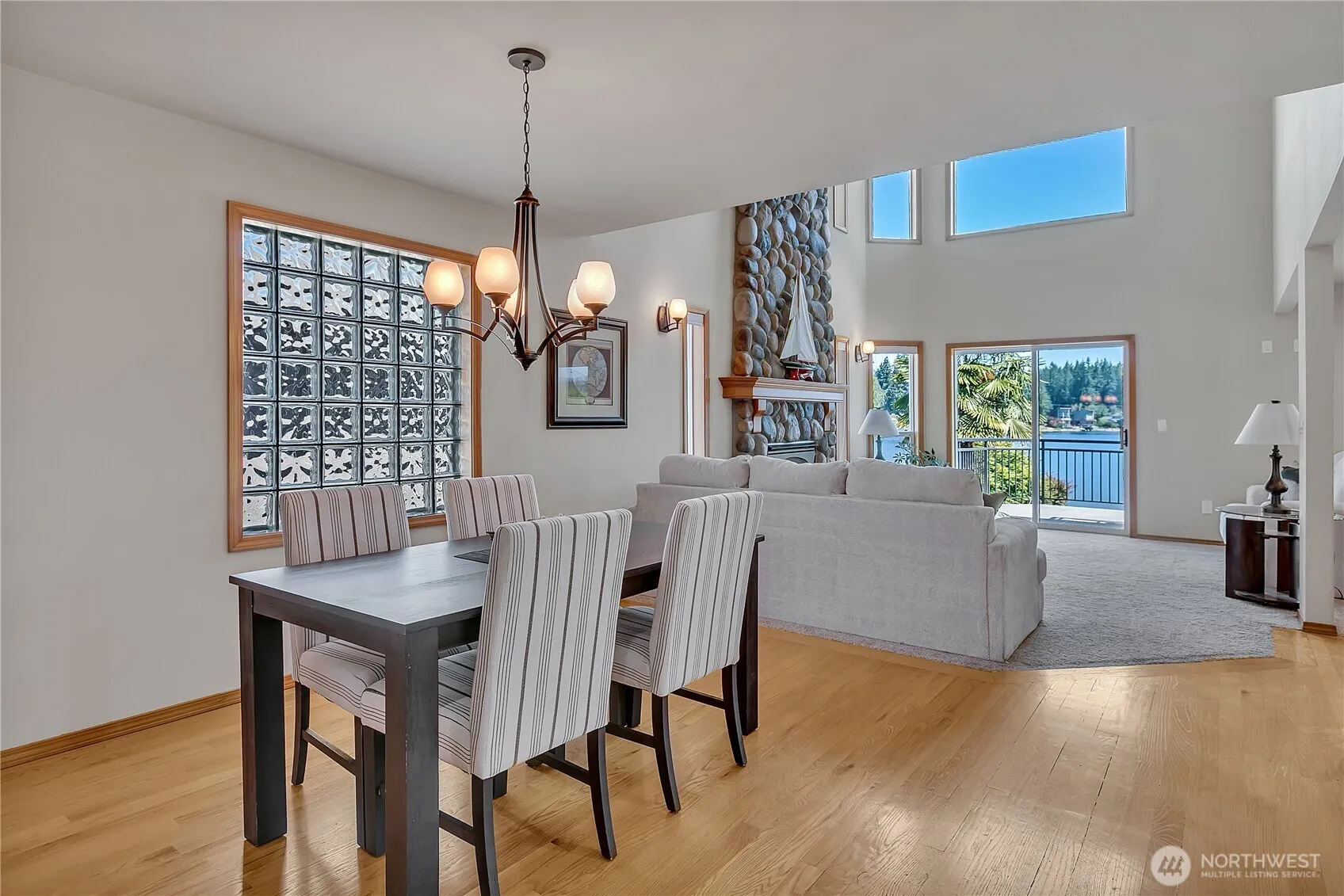 Lake living at its best! Beautiful, deep water, 40 feet of lake front home with soaring ceilings, open floor plan, gorgeous river rock fireplace, large deck, central air, remodeled chef’s kitchen with gas cooking and newer appliances, newer carpet and paint, primary bedroom with deck, oversized bath and walk in shower, 2 more upper bedrooms with custom closets, additional full bath & upper laundry. Lower level boasts huge rec room, wet bar, full bath, guest bedroom, tons of storage, opens to patio and beautifully landscaped grounds, blueberries and potted plants for new owner, newer dock and boat lift. Gated entry, detached garage, shed, tons of parking! Newer roof and gutters, stand-by generator, connected to sewer, this one has it all!