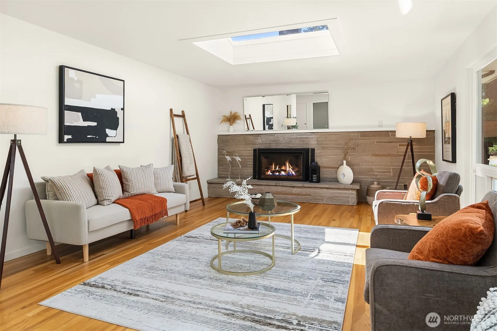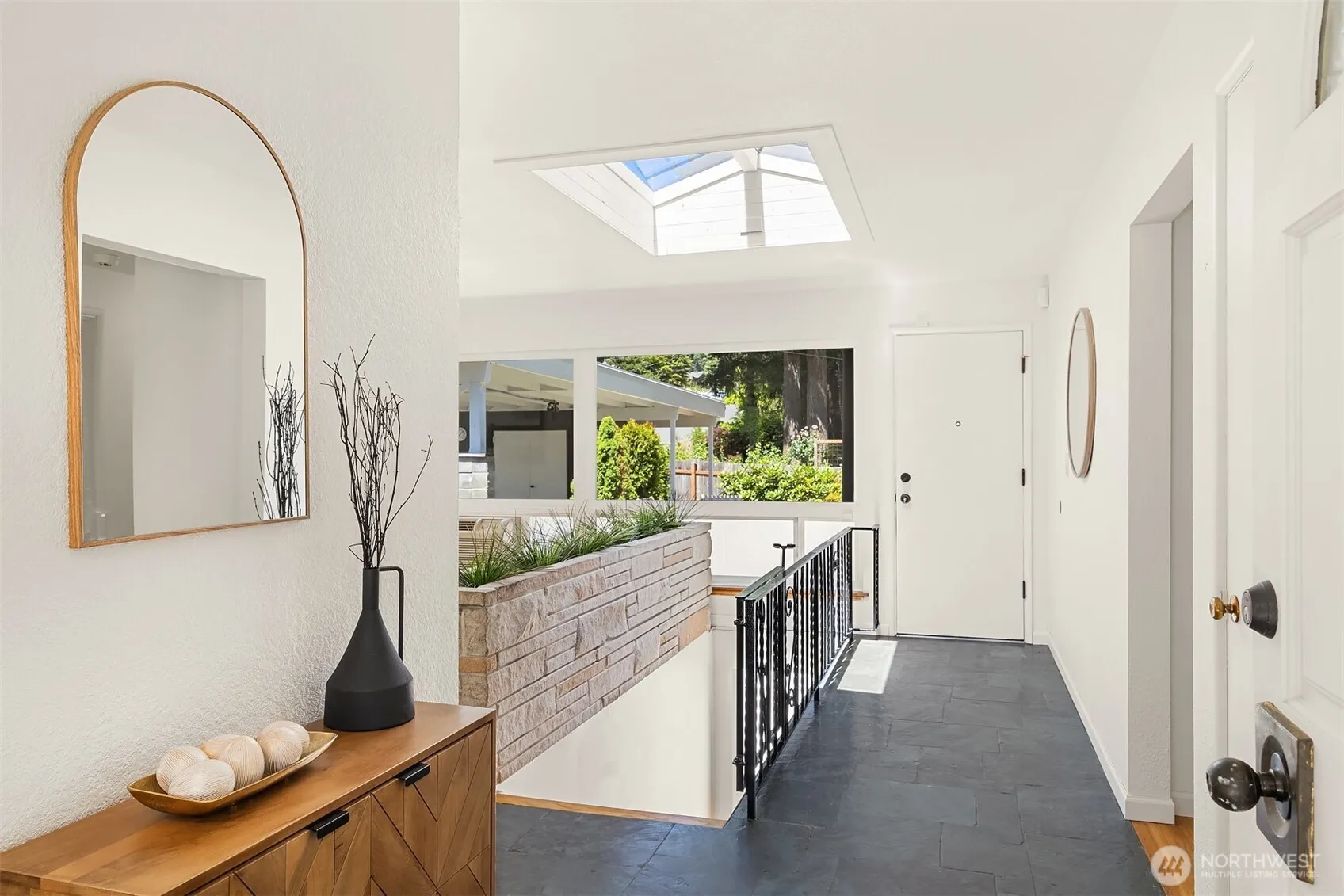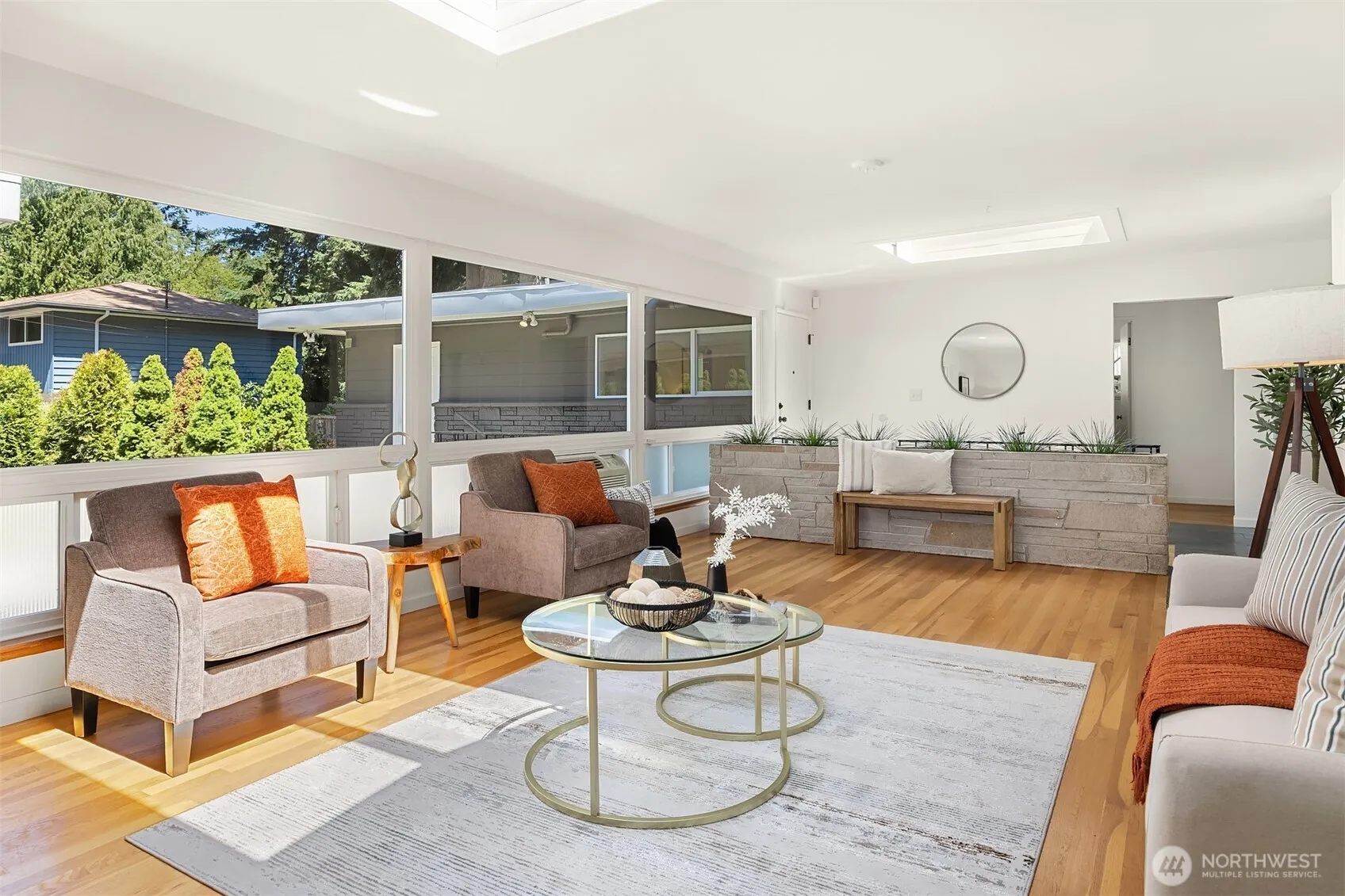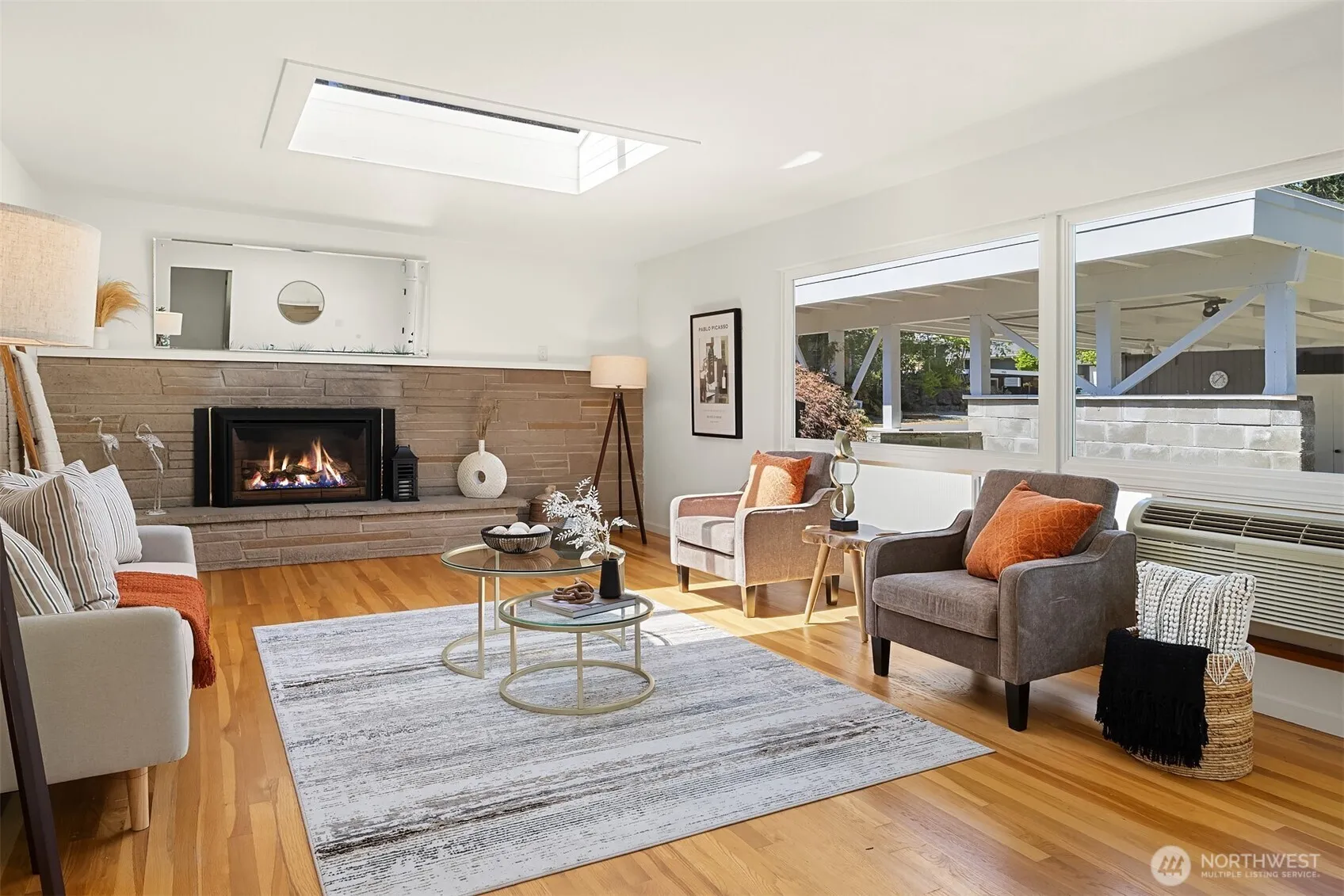 Nestled in Hillwood blocks from Kings Schools, this 4-bed mid-century daylight rambler has tons of original character: slate entry, built-ins. Skylights & walls of windows looking out to the back courtyard let in tons of natural light. Hardwoods throughout. Spacious living rm w/ PTAC unit for heating & cooling. Kitchen features classic wood cabinetry, newer appliances & flows to dining—ideal for entertaining. Generous Primary Suite offers quad closets & en-suite 5-piece bath w/ double vanity & soaking tub & ADA access. Downstairs rec room w/ fireplace & vintage paneling adds flexible living. Huge workshop space. Enjoy the private courtyard framed by evergreens & landscaping. Covered carport & tons of storage. Mins to parks, shops & I-5.