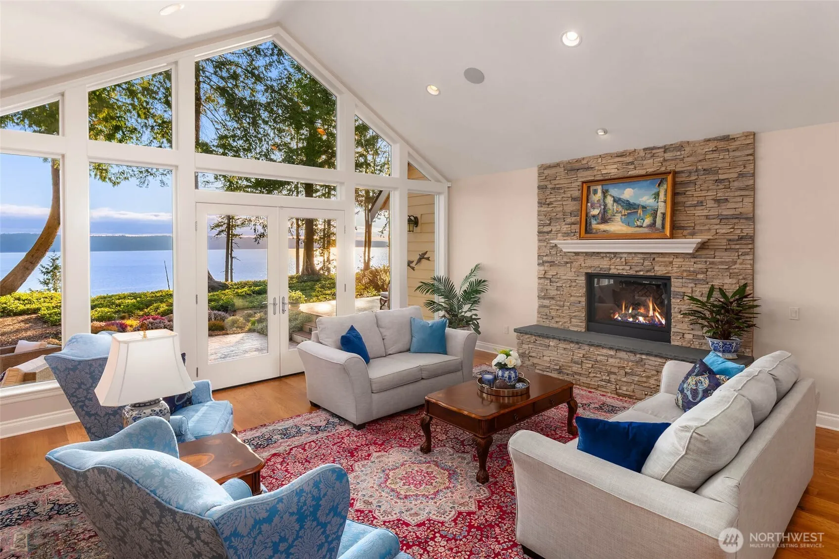 Tucked down a private winding drive, Eagle Bluff is a breathtaking 3.7 acre waterfront retreat where bald eagles soar & whales glide below. This custom one story home features oak floors, a LR with soaring ceilings, a ledgestone fireplace, French doors & a wall of windows framing stunning bay & Cascade views. The chef’s kitchen boasts granite countertops, tumbled marble tile, gas cooktop, double ovens & huge walk-in pantry. Relax & enjoy the wine cellar, home theater & hot tub. The primary suite has two walk-in closets. The bath has heated floors & a 6-ft soaking tub. Ample outdoor spaces including a terrace & a covered deck to let you enjoy nature to the fullest. This Pacific Northwest oasis offers you serenity & beauty inside & out.