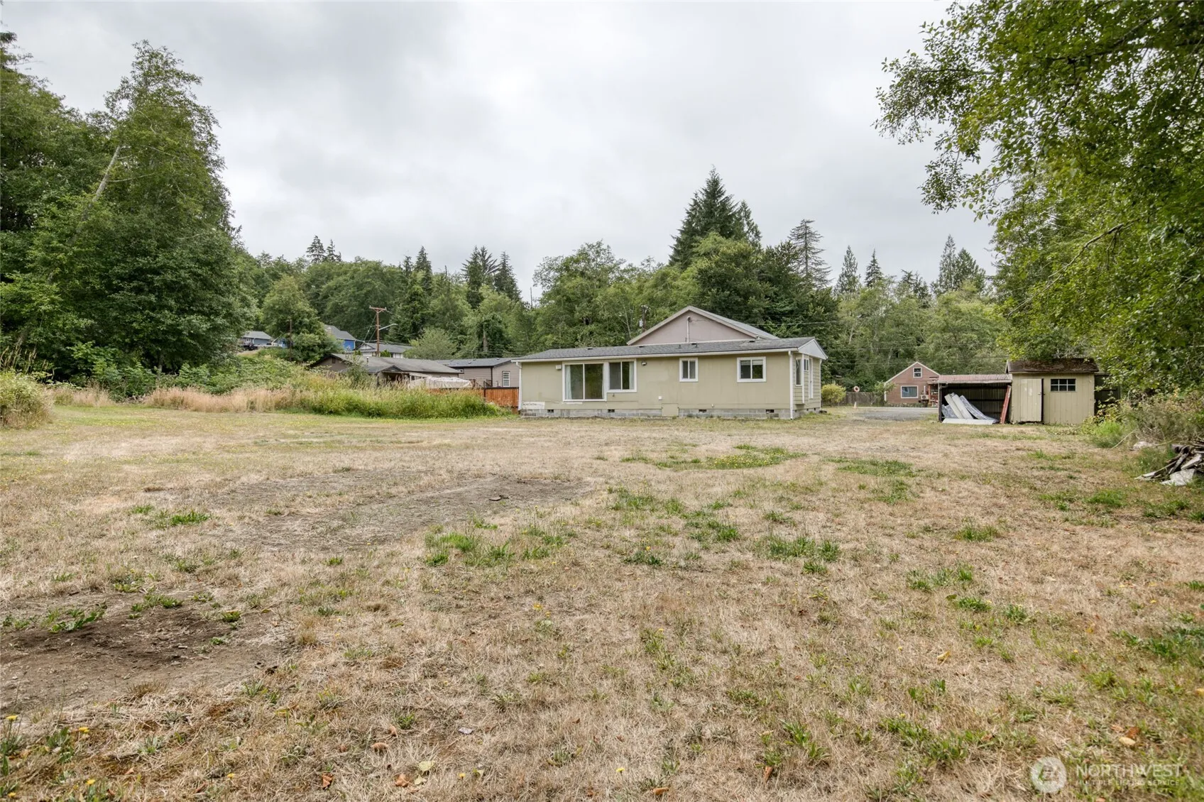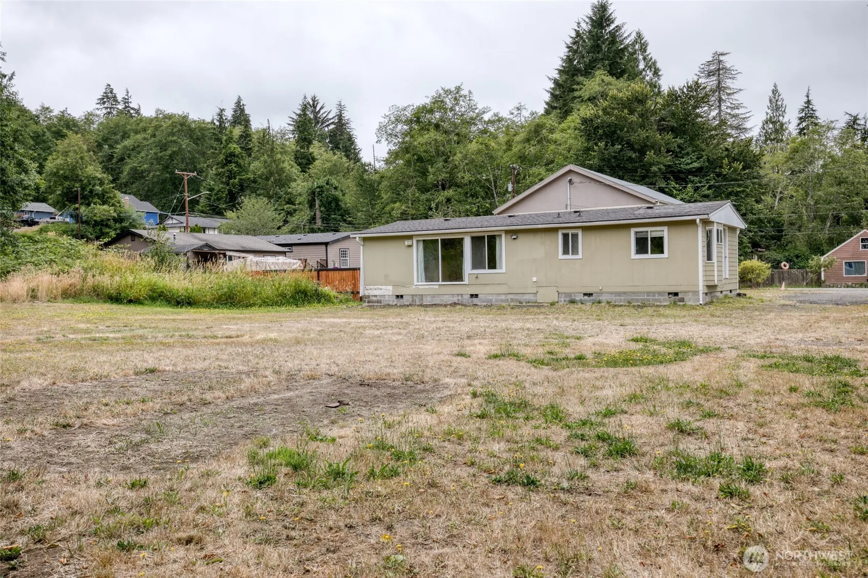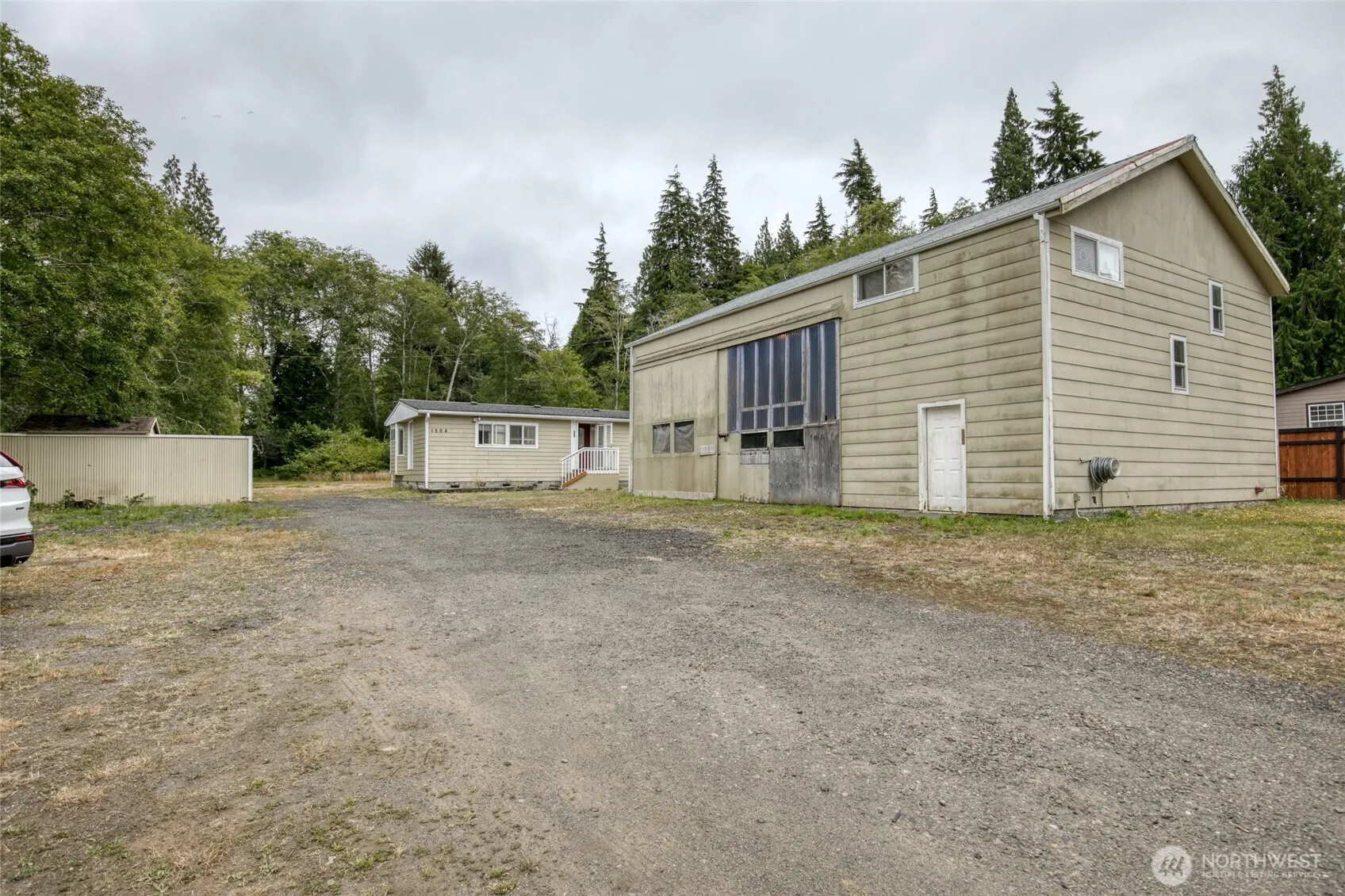 Approximately 3/4 acre piece of land, having 2 parcel lots. Lot with the home & shop is 13,438 sq ft. The vacant land is 20,125 sq ft. 2 bedroom, 1 1/2 bath, double wide manufactured home is ready for a new season! An office area is off the kitchen. Spacious, living/dining great room. Roomy primary suite has a half bath. Also, there is the large shop, 62′ x 31′, once used as a logging truck repair shop. It has a half bath and electricity, and an upstairs room with lots of storage space. This corner lot is level with a creek on the back edge of the property. Out of flood zone. Full RV hook-up with water/sewer/electricity. Being sold “AS IS”, cash. Additional lot included in this price. Motivated Seller! Buyer Provide Proof of Funds w/offer,