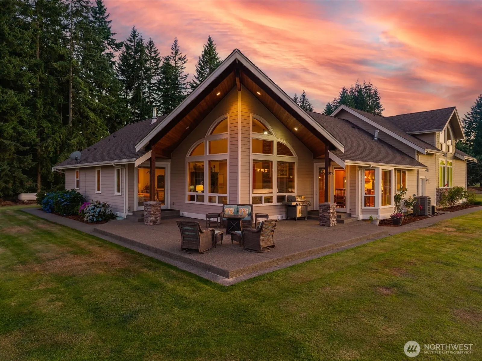 Wake up to breathtaking views of Mount Rainier & sparkling lake waters from your custom-built retreat on a private waterski lake. Set on 5 acres in a gated community w/ clubhouse, boat basin, dock, & miles of wooded trails. Includes personal boat slip, lift, & ski locker. High end luxury finishes throughout. Features include gorgeous chefs kitchen, new furnace & heat pump, vaulted beam ceilings, heated floors, hickory cabinetry, Fivestar 6-burner range, spa-inspired primary suite w/ jetted tub, dual shower & custom closets. Solar-powered w/ ultra-low bills. Oversized 3 car garage w/ EV plug & huge bonus room/flex space. Fully landscaped w/ fruit trees, 15-zone irrigation & RV parking. Designed for year-round luxury, adventure & serenity.