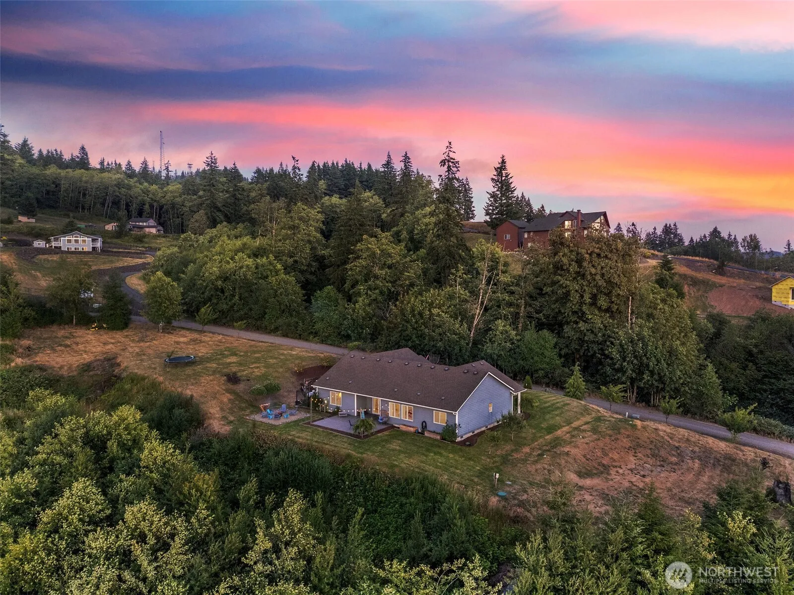 Single-level living with VIEWS on a peaceful 2-acre parcel! 2018 build! Open floorplan with a cozy family room and dining nook off the kitchen—featuring Alder cabinets, granite counters, a farmhouse sink, and pantry. Separate dining room that could double as an office or flex space. Spacious primary suite with soaking tub, walk-in shower, and large walk-in closet. Two more bedrooms, a full bath, and a guest powder room offer plenty of room for everyone. 3-car garage, and RV parking. Outside there is a stamped concrete patio with lights and a firepit—perfect for entertaining or just enjoying the quiet beauty of the PNW!