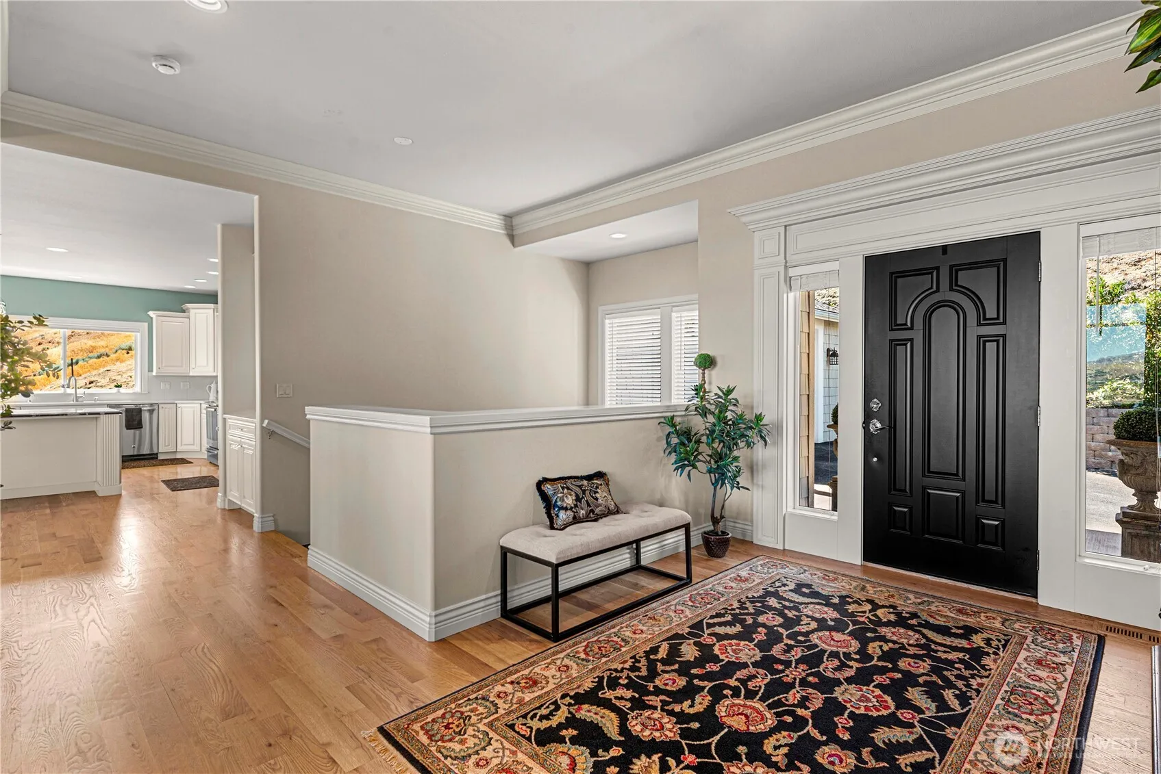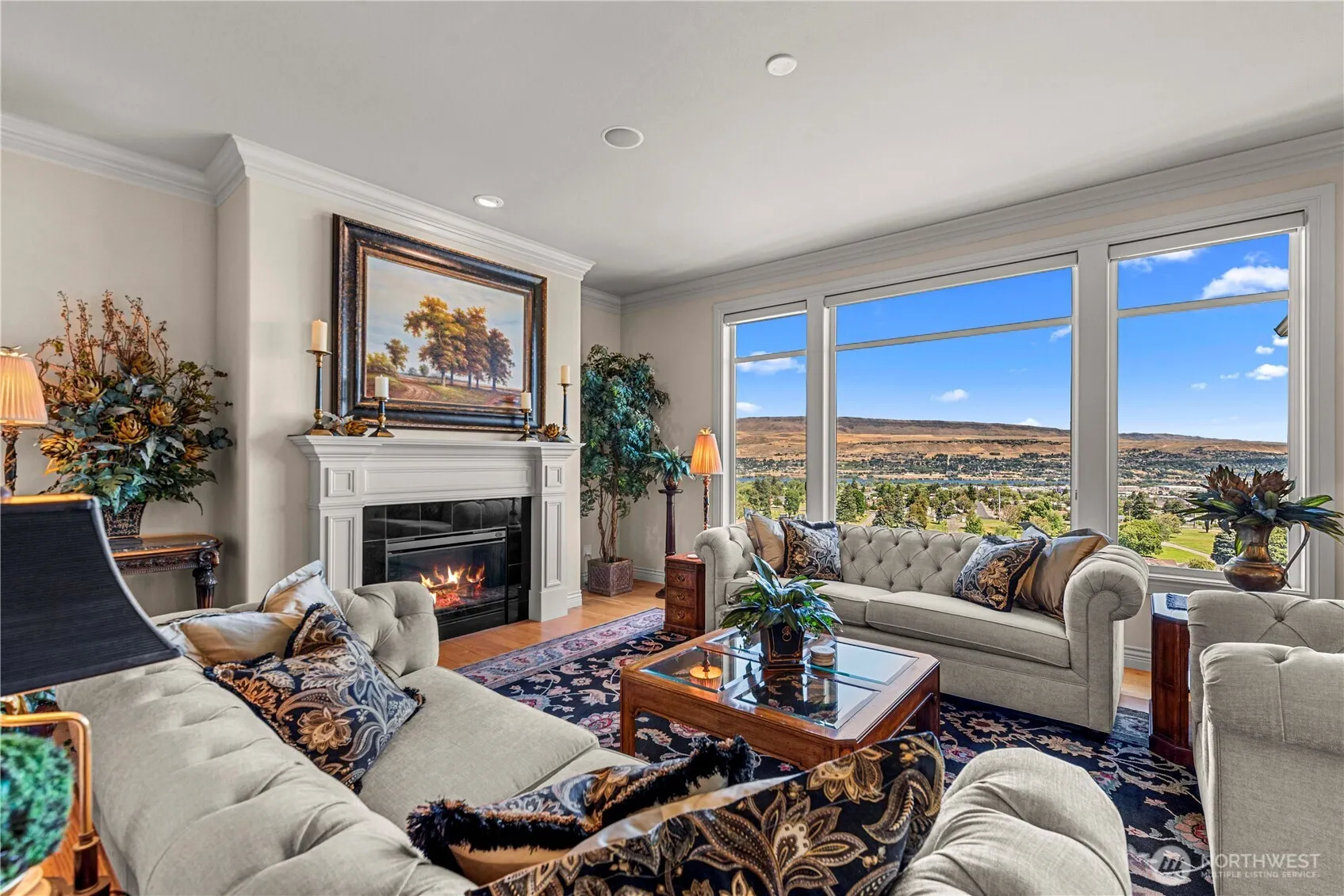 Luxurious comfort w/ SPECTACULAR unobstructed 200+ degree VIEWS of Wenatchee Valley, Mountains, Columbia River, City Lights, Sun & Moon rises. This spacious gorgeous daylight rambler boasts high end finishes, with 9/10-ft ceilings, abundant natural light framing amazing views, impressive millwork, & white oak wood floors throughout main level. The spacious Kitchen features Bagdon’s cabinets, great counter space, extra-large island, butler’s pantry & brand new/newer stainless appliances. With Main floor living, the primary suite includes a lavish primary bath with heated floors, extensive double vanity, & walk in tile surround shower. 2 garages with room for 4 cars plus a shop. This is a Rare find in a gated 55+ community of lovely homes.