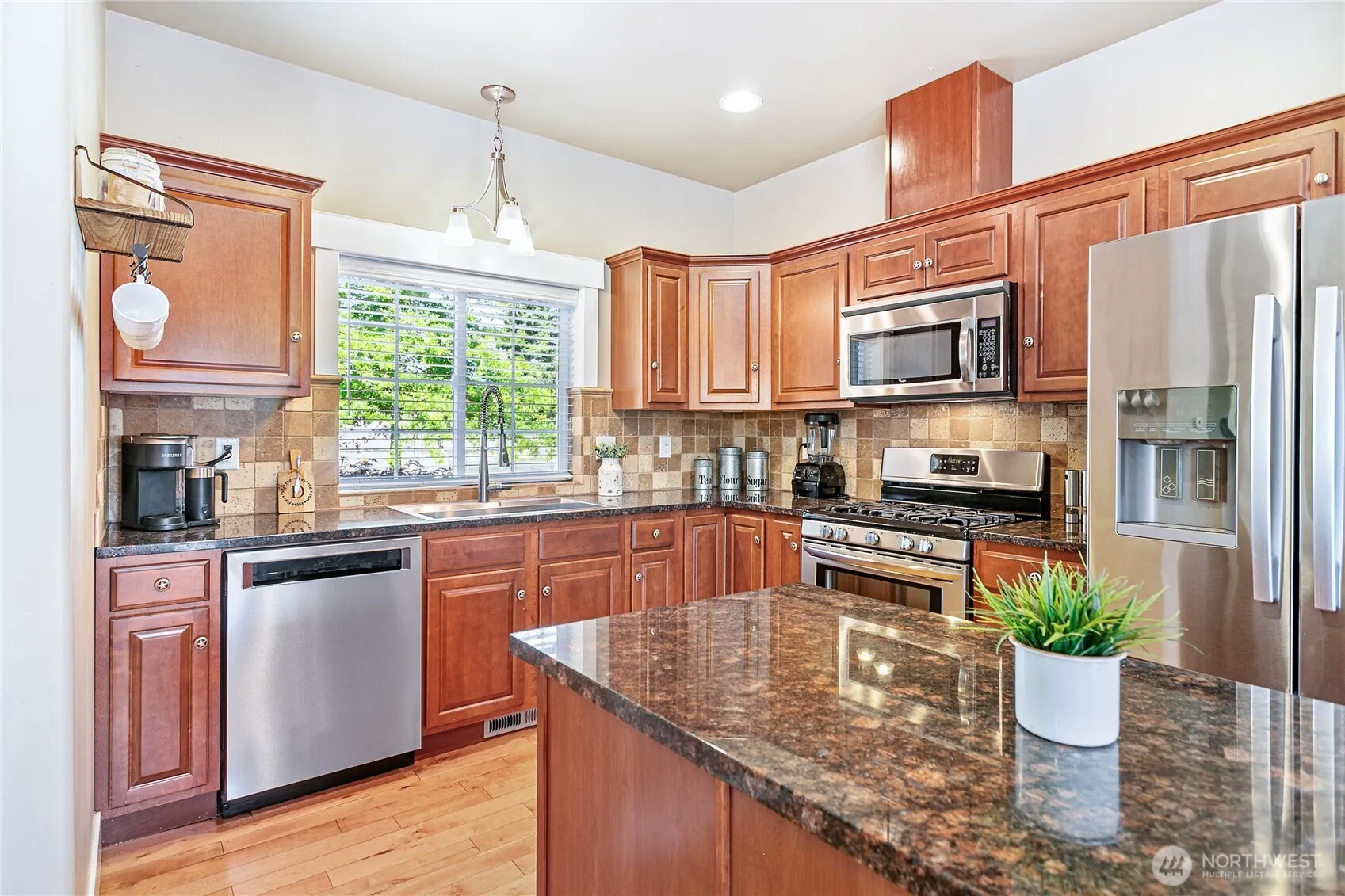 Beautifully designed 4 bedroom, 2 bath single-level home with 9-foot ceilings and open-concept layout. The living room features vaulted ceilings, creating a bright and spacious feel. The kitchen includes granite countertops, stainless steel appliances, a center island & a walk in pantry. The versatile 4th bedroom can serve as a home office or flex space. The private primary suite is separated from other bedrooms and offers a spacious bath with separate toilet area, and a large walk-in closet with updated shelving. Situated in a quiet, peaceful area with the lawn of your dreams. The fully fenced backyard is a private oasis with an updated deck & patio, sun shade, hot tub, and raised garden box—perfect for relaxing and entertaining.