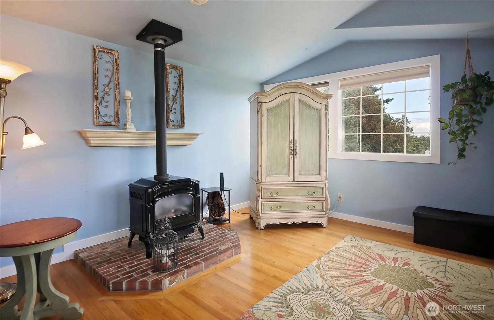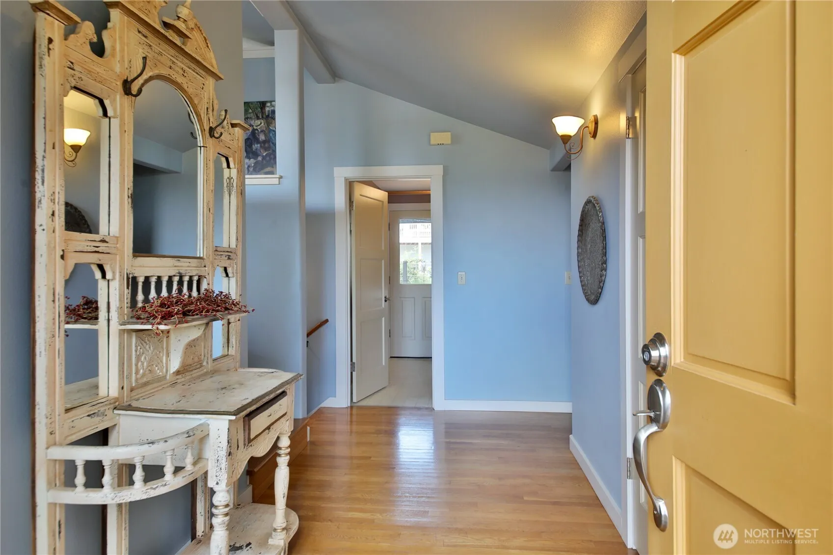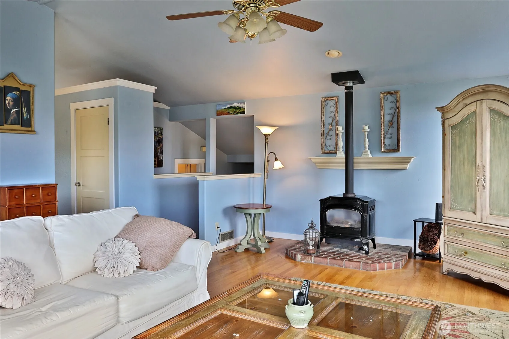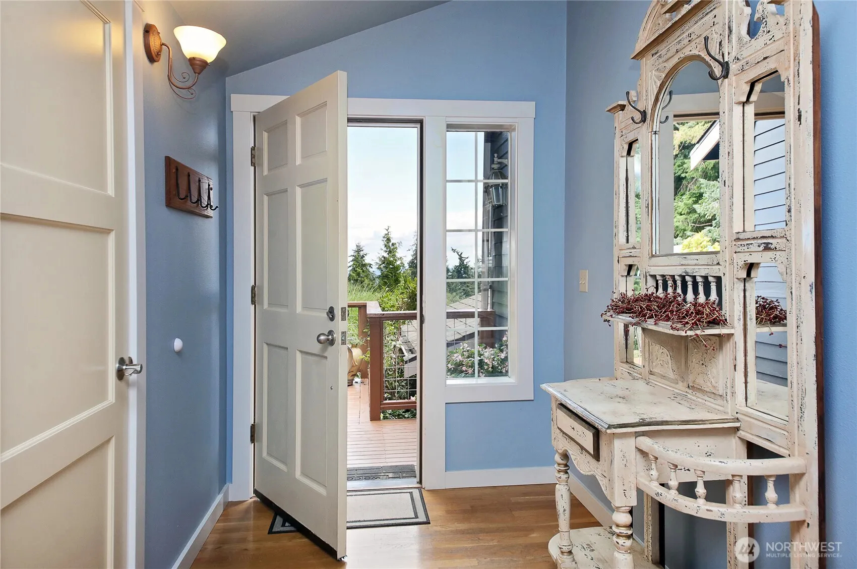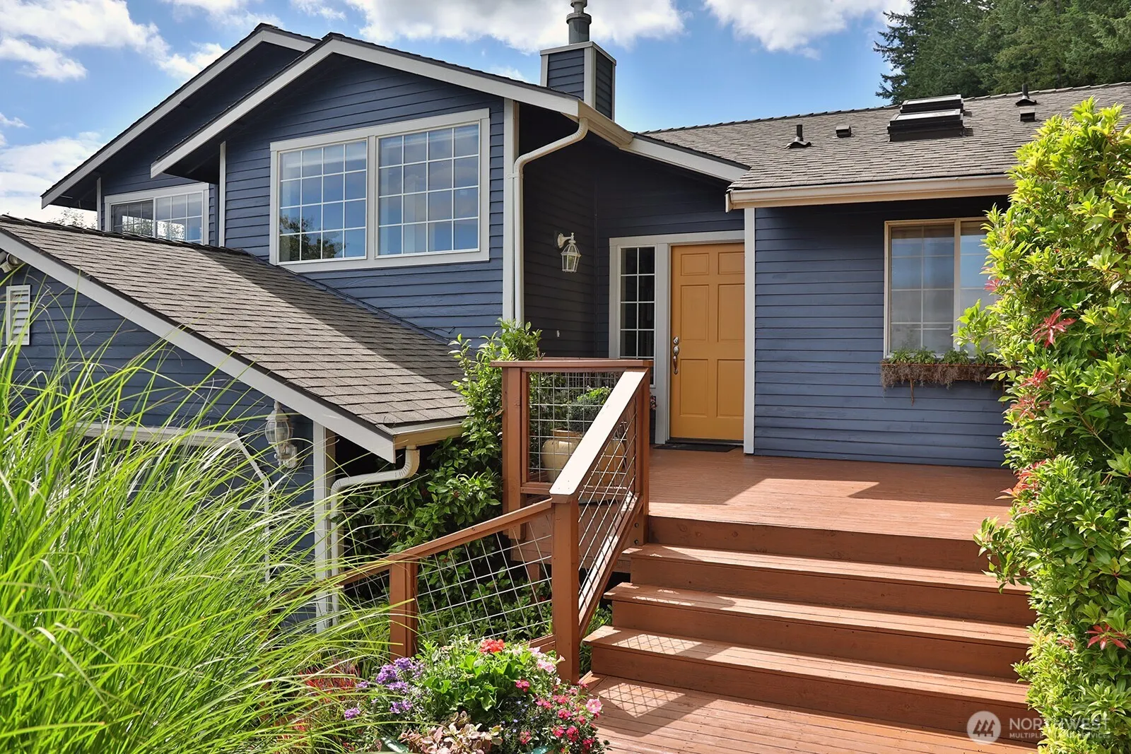 Welcome to this inviting 3 bed, 1.75 bath home in the desirable Hilltop Terrace neighborhood—just a 5-minute drive from the ferry. Just shy of 2,000 square feet, the layout offers the perfect blend of cozy and spacious, with thoughtful design including hardwood floors and a large deck ideal for entertaining or relaxing. The primary bedroom features double doors that open directly to the deck, creating a peaceful retreat with a partial view of the Puget Sound and Cascade Mountains. Enjoy fresh apples and cherries from your own trees, gather around the graveled firepit, or tend to the fully fenced area great for raised garden beds. This home combines natural beauty, comfort, and convenience in a nice neighborhood setting.