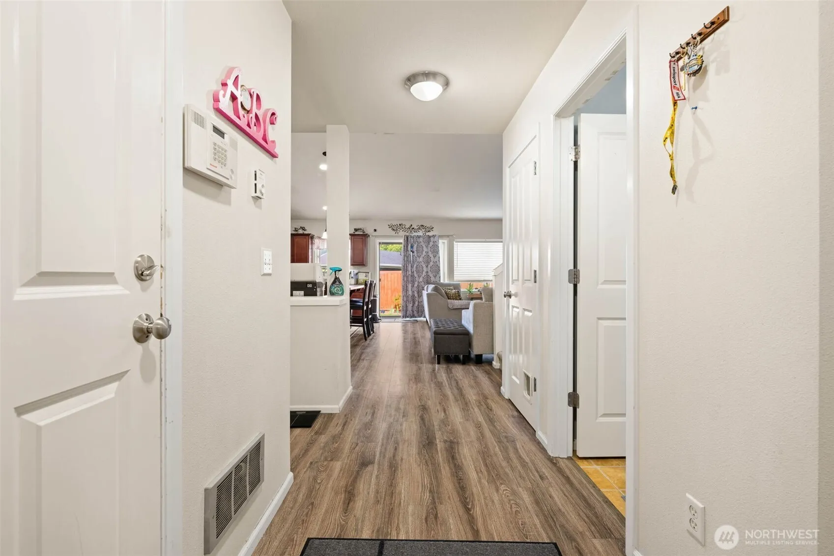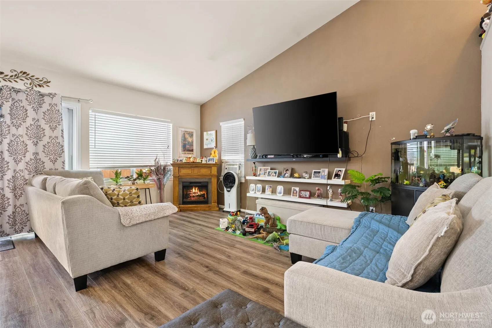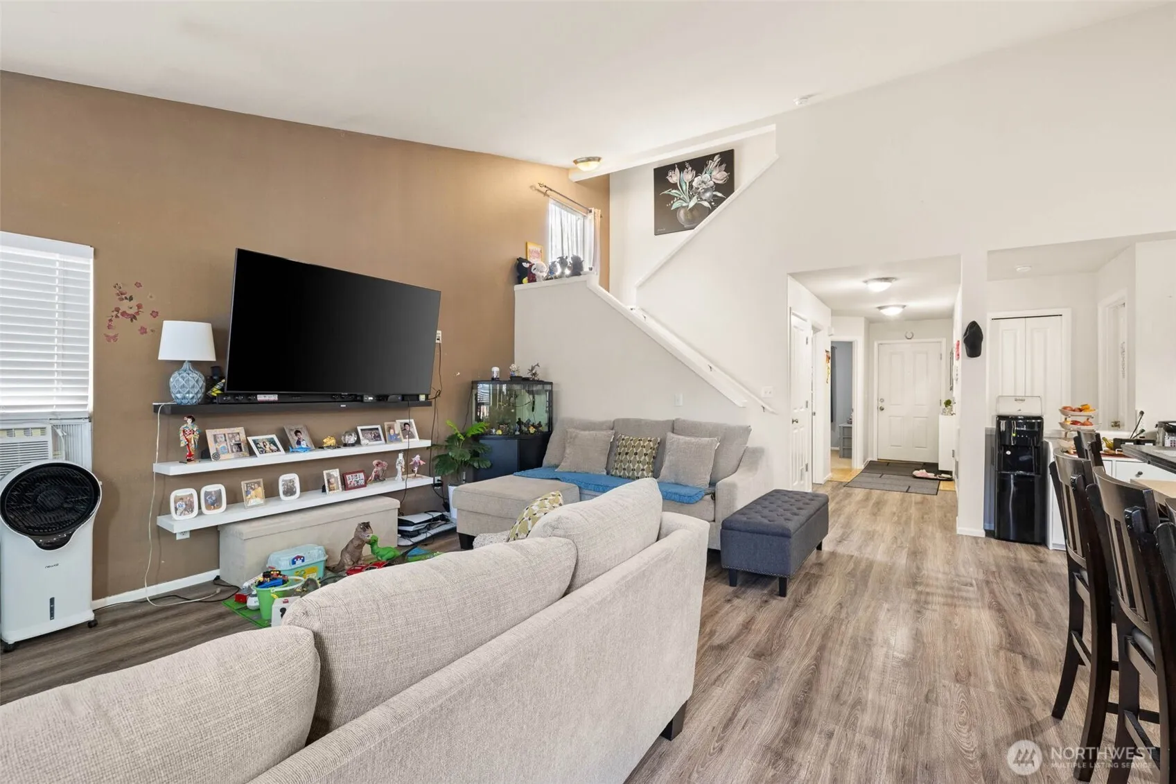 Welcome to this stunning 2-bedroom, 2-bathroom townhome that shines with soaring vaulted ceilings, brand-new flooring, and sun-filled living spaces! The open-concept kitchen is a dream—featuring a spacious island with plenty of storage, perfect for entertaining or everyday living. The smart floor plan offers a main-level bedroom and full bath, while the upstairs retreat includes the primary suite with its own private bath. Step outside to your fully fenced backyard with a patio, backing directly to Five Acre Park for added privacy and nature at your doorstep—no neighbors behind you! All this in a prime Fife location, close to shopping, dining, and easy commuting. Schedule your tour today!