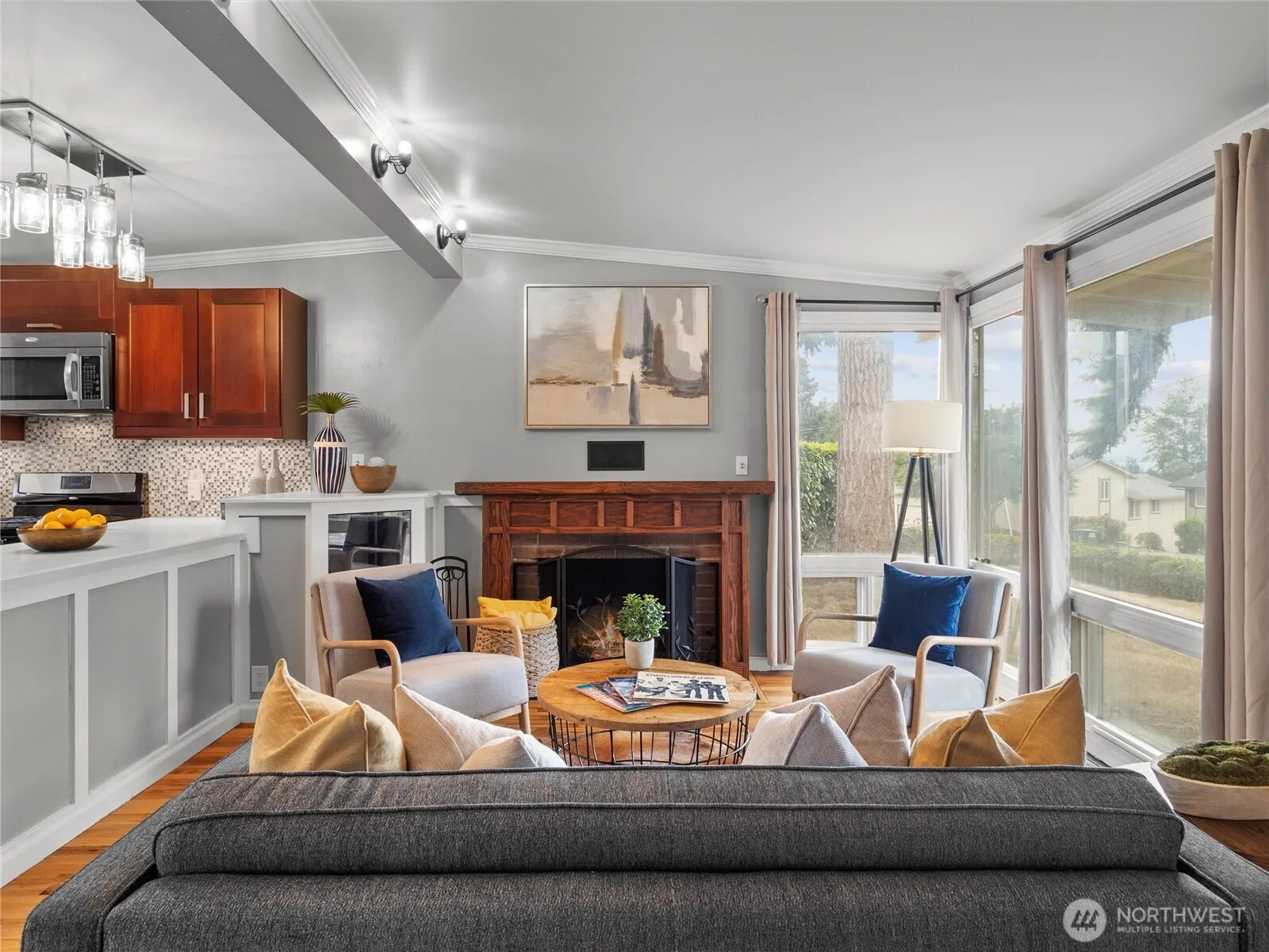 Step into timeless style & effortless comfort in this beautifully maintained mid-century modern home, perfectly perched in a quiet cul-de-sac allowing peaceful living & privacy. Clean lines, gleaming hardwoods, vaulted ceiling & an open floor plan welcome you into this captivating space. Expansive floor-to-ceiling windows fill the home with natural light while seamlessly blending indoor & outdoor living. Rare en-suite primary & dedicated office make for convenient & flexible living. Expansive fully fenced yard, perfect for morning coffee or entertaining. Located in sought-after Des Moines, minutes from waterfront parks, marina, local shops, and vibrant community amenities. Experience the best of PNW living in this mid-century masterpiece!
