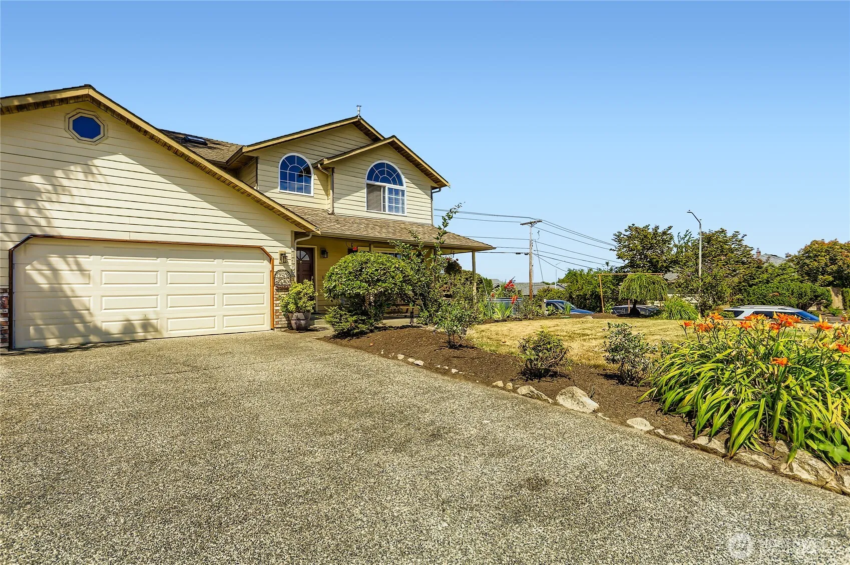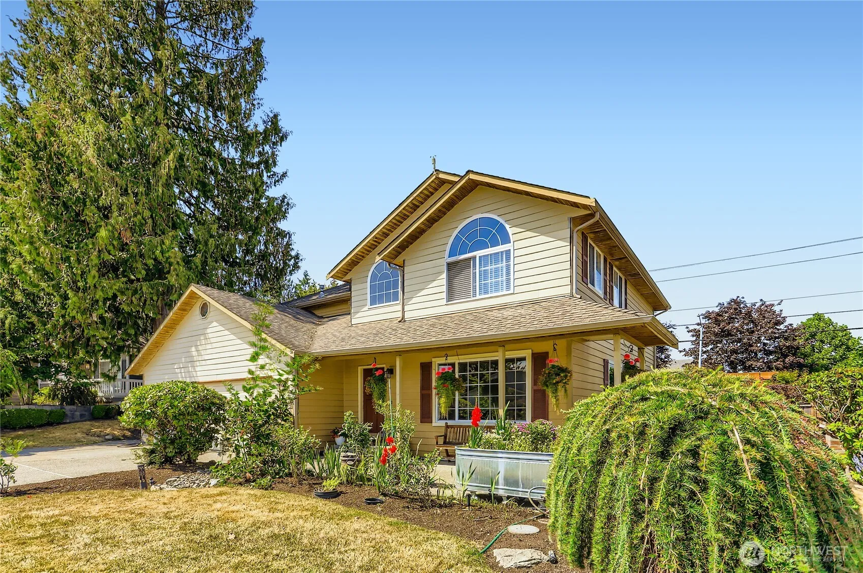 Beautiful Views, Large 5-bedroom home with triple garage on a corner lot on cul-de-sac. Freshly painted, lushly landscaped, with nice views of the Cascades. Modern kitchen with S/S appliances; large living and dining room area; eating spaces in kitchen blend into the large family room featuring warm engineered cherry hardwood floors and a gas fireplace; The bathrooms have recently been stylishly upgraded. The primary bedroom features a five-piece suite with a pedestal tub and large walk-in closet. Pleasant patio space surrounded by gardens with private hot tub adjacent. Unusual amount of storage space is easily accessible on second level. Laundry is conveniently located on the second level. Make this warm, view home, your own.