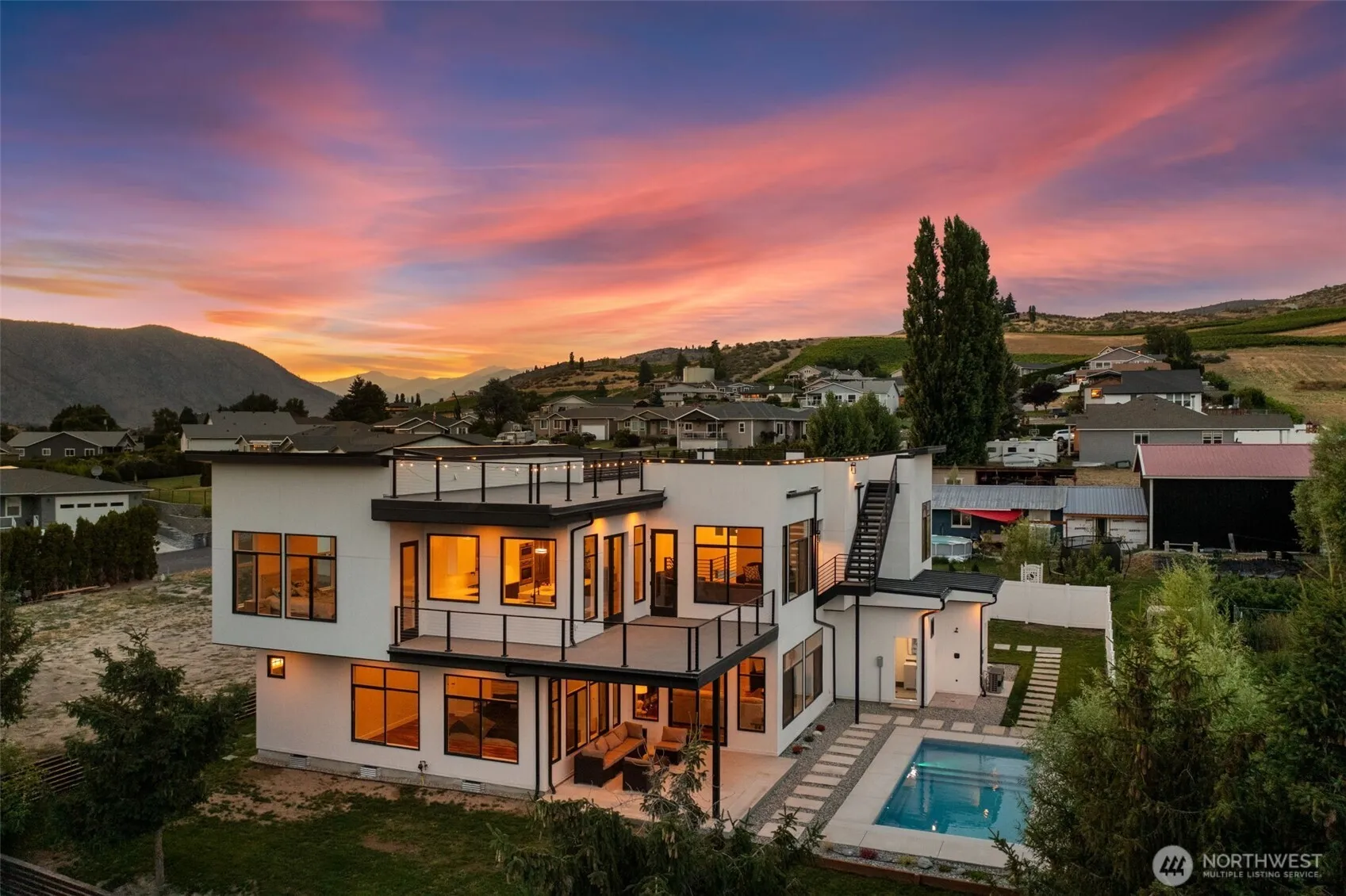 Priced Reduced!!! Welcome to your private oasis in the heart of Lake Chelan! This brand-new luxury residence offers 6 bedrooms (4 suites), 7 bathrooms, and is perfectly located just minutes from the winery, casino, and boat launch, yet tucked in-town for ideal privacy and convenience. Enjoy panoramic views of Lake Chelan, surrounding mountains, and orchards from nearly every room. Relax in your private pool, unwind by the fireplace, or take in sunsets from the expansive rooftop deck. Features include a metal roof, no HOA, engineered wood floors, quartz countertops, Fisher & Paykel & Frigidaire appliances, EV charger, optional den/7th bedroom, and outdoor bathroom and shower. Luxury Chelan living at its best!