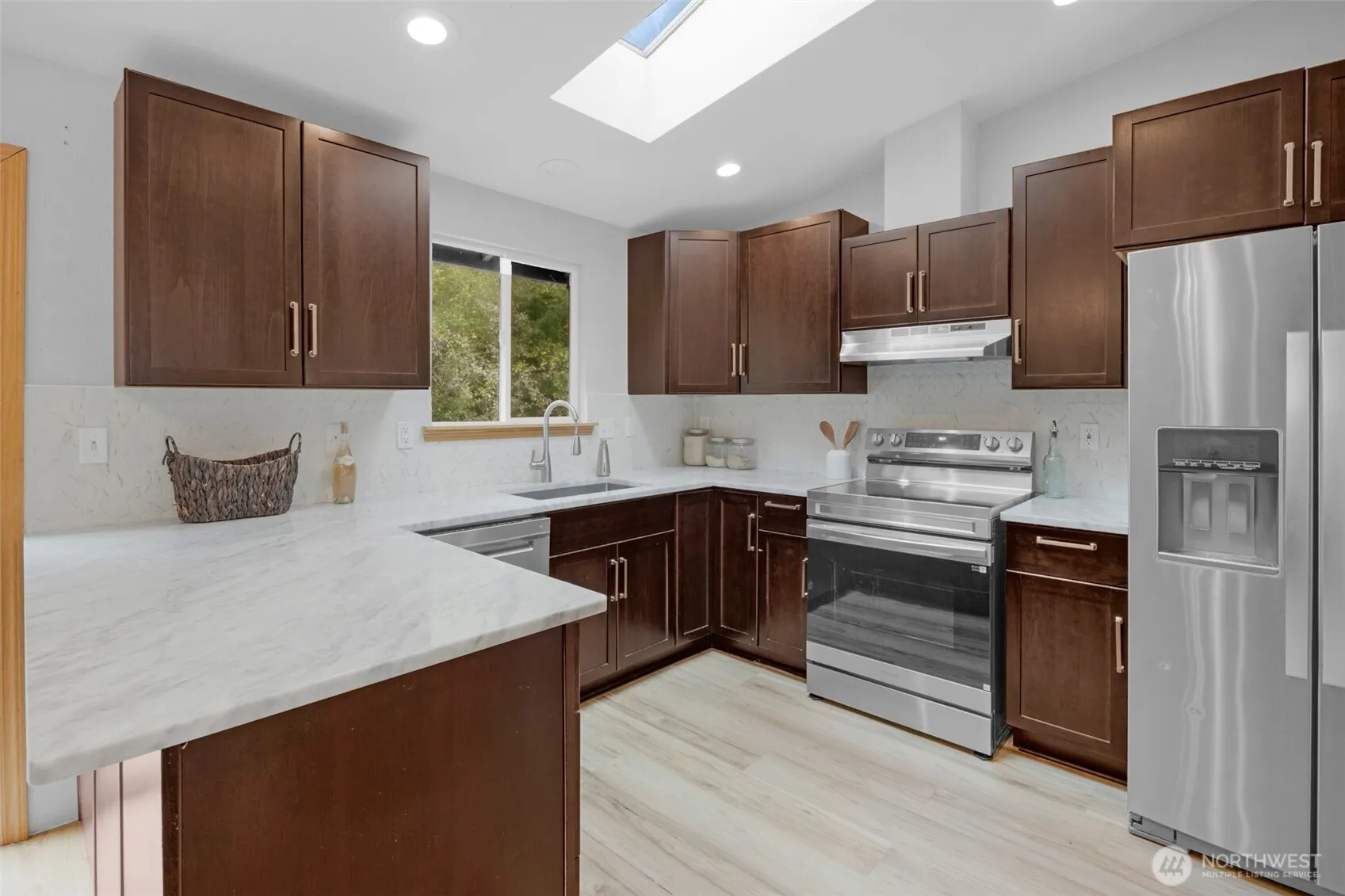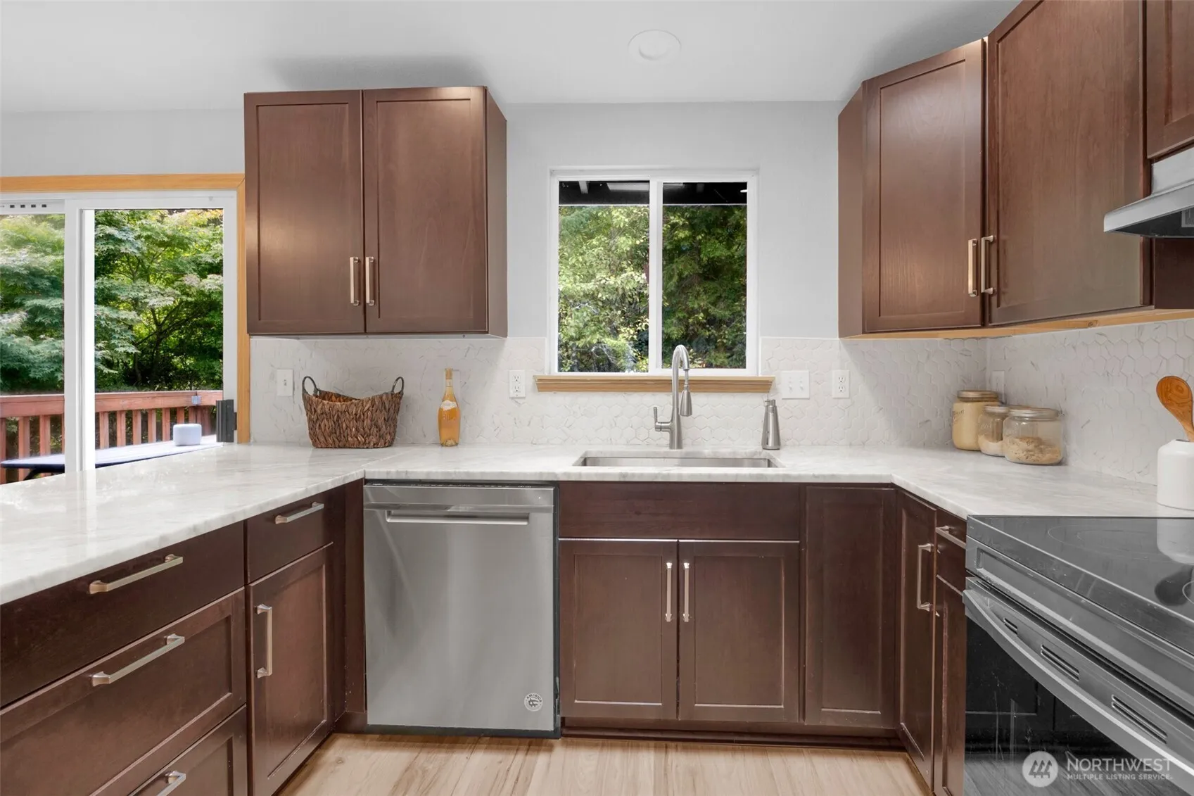 Just steps from the Centennial Trail, Frisbee Park, Boat launch, The Mill Town Center & the Lake! This private creekside setting has trees as your backdrop. Upper level features an updated kitchen with skylights, newer marble countertops, cabinets & newer appliances. The great room has vaulted ceilings with floor-to-ceiling windows & a gas fireplace. Large primary suite, 2 full baths & 2 additional bedrooms up stairs. Lower level lives large! 2nd primary/bedroom with sitting area has ADU potential. A nice size bonus room leading out back & 3/4 bath. 3 living areas! Newer roof, carpet & fixtures—move-in ready! Located in a cul de sac. Large terraced yard backing to NGPA & the creek. You can’t beat the location! New mini splits for AC & heat!