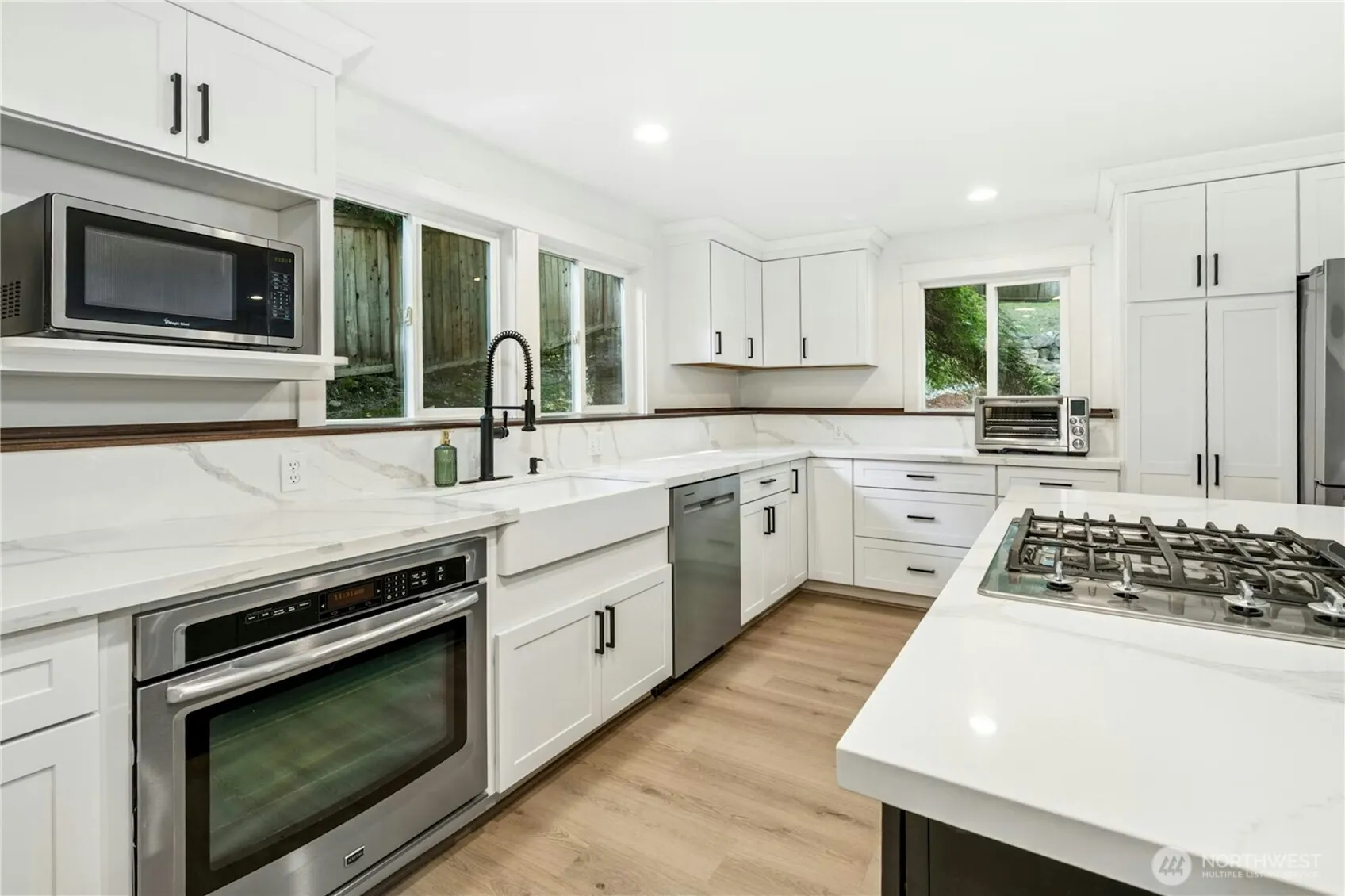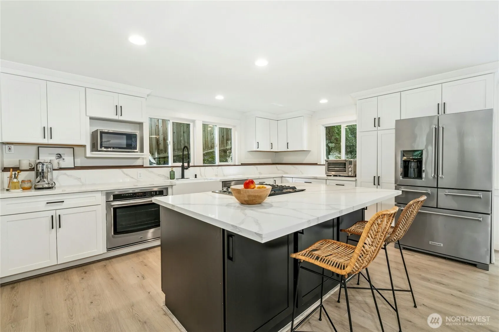 Restoration Hardware polish with a classic airy, grandeur that isn’t found anymore! Fantastic & beautiful livability on all levels nestled up quietly in the trees to enjoy filtered light through cedar & Japanese maple trees. A legacy property in the heart of LFP ¾ mile to the Towncenter, deeded waterfront LFPCC, Top SD & easy commute to Seattle/Eastside. 1,600sf of decks (Trex & freshly stained back deck) flank both sides of home for al-fresco Summer socials & quaint lawn venue for happy hour picnics, play & pets. Timeless shaker white & black 6.5’ island kitchen is a culinary statement w/walls of glass to outdoors, estate dining room, 2 living rooms. 4 oversized bedrooms + office niche upstairs. Owner Suite lives like a penthouse LUX hotel