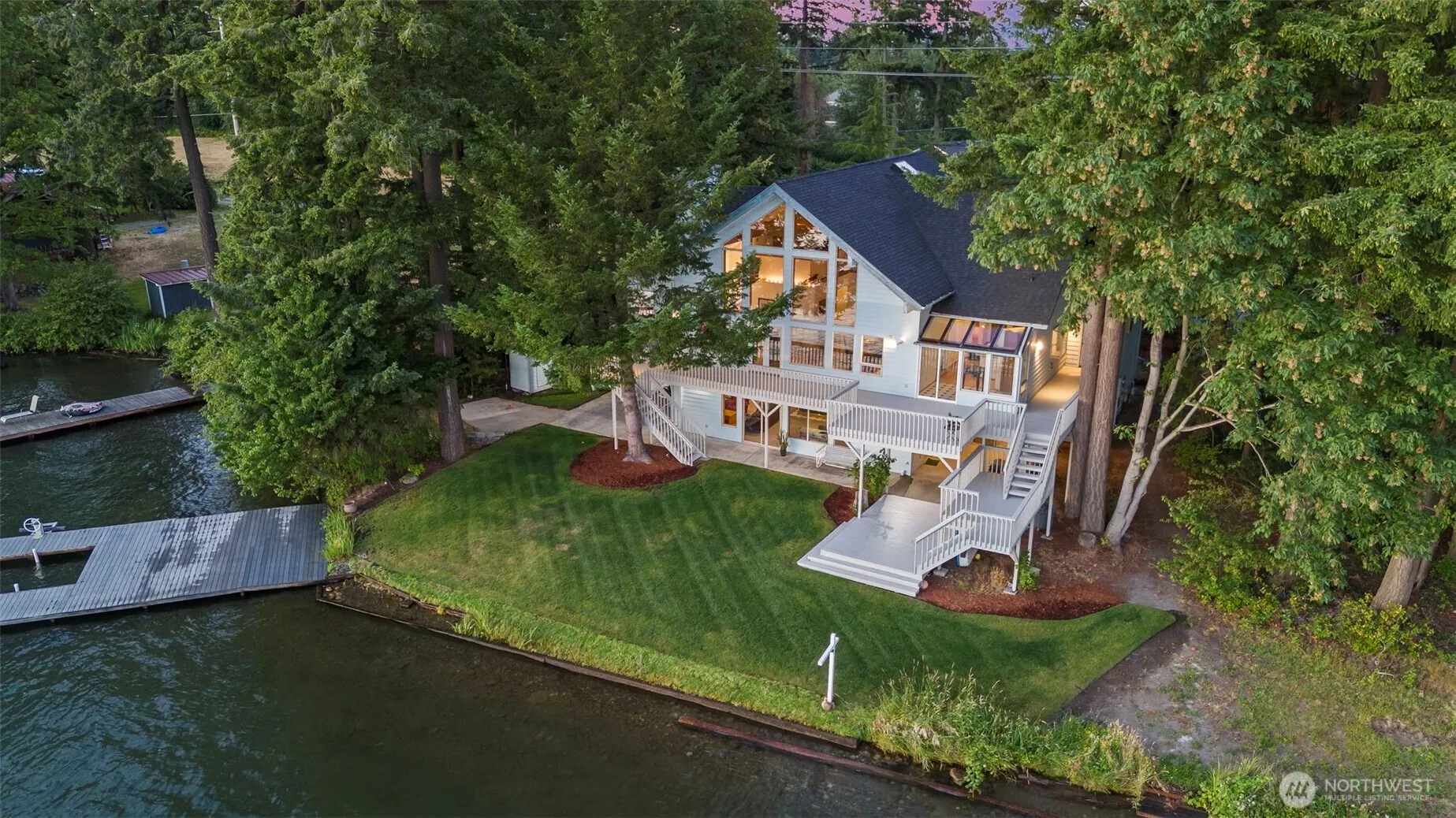 POSSIBLE PARTIAL SELLER FINANCING AVAILABLE! Western facing luxury home on Lake Tapps, 102′ of FLAT bank WATERFRONT, 1200 sq ft 2-story boat shop with potential for an ADU, just 5 min. to Tapps Island GOLF COURSE. Main level incudes 3 Bedrooms, 3 bathrooms, large home office/bonus room. Guest quarters located on lower level supports multi-generational living. Exquisite sunsets and abundant bird life (including bald eagles, snow geese and blue heron). The splendid interior is perfect for Holidays, Super Bowl gatherings, or intimate dinner parties with outdoor room for a sports court and many summer activities. Its an easy walk across the lawn to stunning Mt. Rainier views. Enjoy year-round waterfront living at its finest!