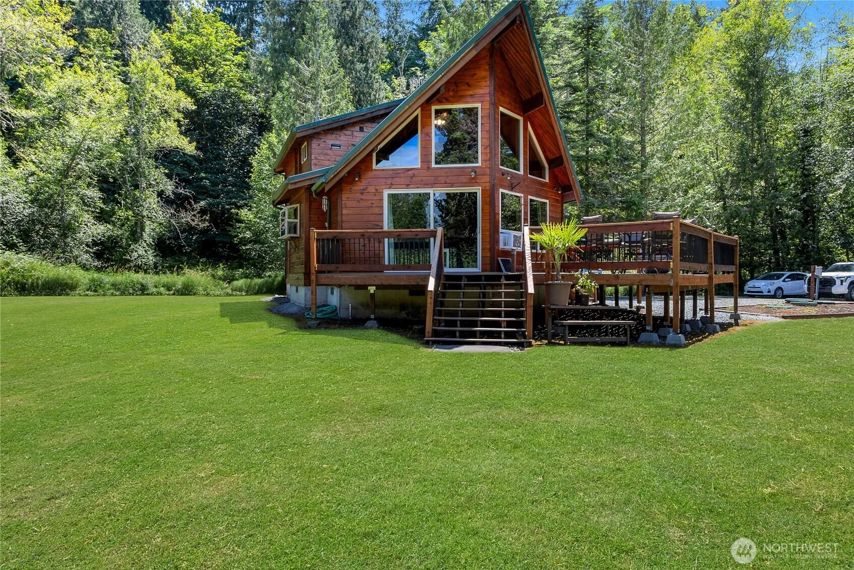Welcome home to this picture-perfect setting! Enjoy the outdoors from the amazing new deck! Enter into the great room with vaulted ceilings and a wall of windows to look out over your 2 ACRE lot from the kitchen. Two bedrooms and a full bath down and one bedroom, full bath with a private balcony up the spiral staircase. Granite countertops in the kitchen with some fresh appliances that stay! Fresh stained siding and deck railing.Detached garage with additional space for a play room/workout area and a canning room-so many options.Private and secluded but only a couple minutes to lovely DT Orting. Nothing to do, just move in! This is a MUST see!Setup a showing, fall in love, and call this place HOME!