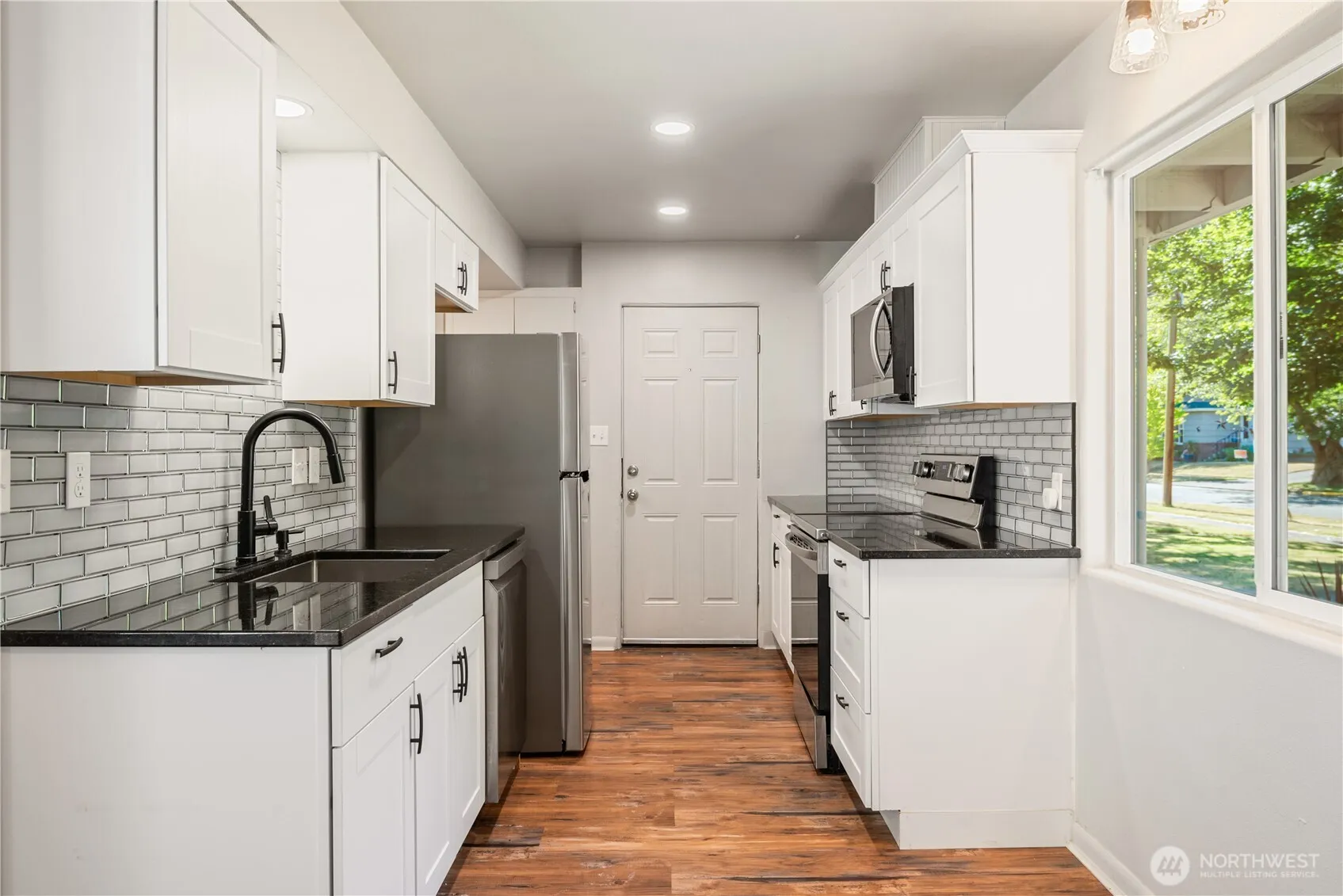 Fully updated mid-century modern charmer on the New West Side. Amazing location. Located right next to historic Longview Community Church, less than a half block from Lake Sacajawea, and right next to the Old West Side neighborhood. Large corner lot. All new exterior paint. Fully updated kitchen with quartz countertops, tile back splash, stainless steel appliances, white shaker cabinets. Classic mid century modern design. Updated luxury vinyl plank flooring throughout entire house. Updated paint and vanity in the bathroom. Fully fenced back yard with patio and storage shed. Schedule your viewing today!