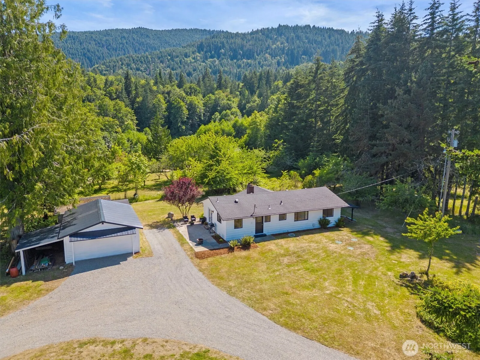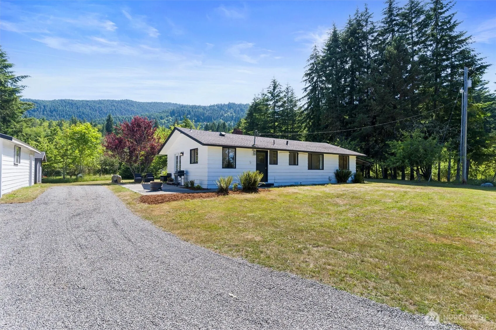 Welcome to the Grauel-Ramapo Heights community. This Gorgeous 3-bed, 1.75 bath, 1,264 sqft Rambler features an updated kitchen, stainless appliances, new butcher block counter tops, and fresh LVP flooring throughout. Enjoy Spectacular water views of the Strait of Juan de Fuca and Sooke, BC, from your primary bedroom, guest room, utility room, and kitchen. Entertain and enjoy on a spacious patio with views of the mountains. The home is situated on a private and expansive 8.4-acre lot. Brand new upgraded 4-bedroom septic system, ready to build your dream ADU or Shop, upgraded electric panel 2020. Large oversized Detached 2-car garage, with RV/ Boat parking. No CC’Rs, Established orchard, 22 fruit trees,4 cherry,1 peach,2 plum, and 15 apple.