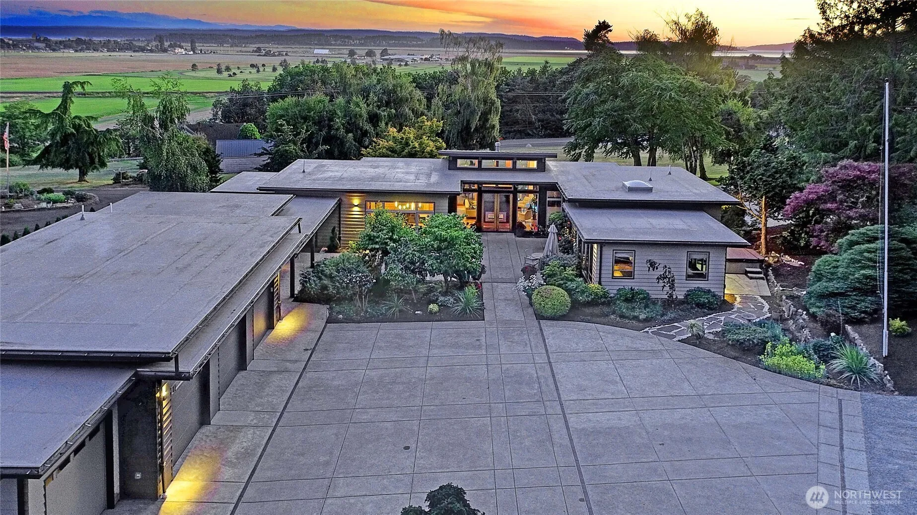 Exquisite Mid Century style home on 6.4 beautiful acres with evergreens and trails throughout. Views of the Olympics, Sound, City, Sunsets, & Valley. 6 parcels within the city limits. Drive up to your finished 4 car garage and walk through a gorgeous courtyard into your own piece of Paradise. Beautiful open kitchen with large island. Stainless high-end appliances. Adjoining is your dining area with lots of built-ins. TV room, with adjoining office. Huge deck the width of the house. Large living room with steel fireplace. Secondary bedroom, 3/4 bath, machine room and guest closet are steps away. Spacious primary suite with updated bath and walk-in closet. Detached studio guest room with beautiful granite counters and 3/4 bath. Green Built!