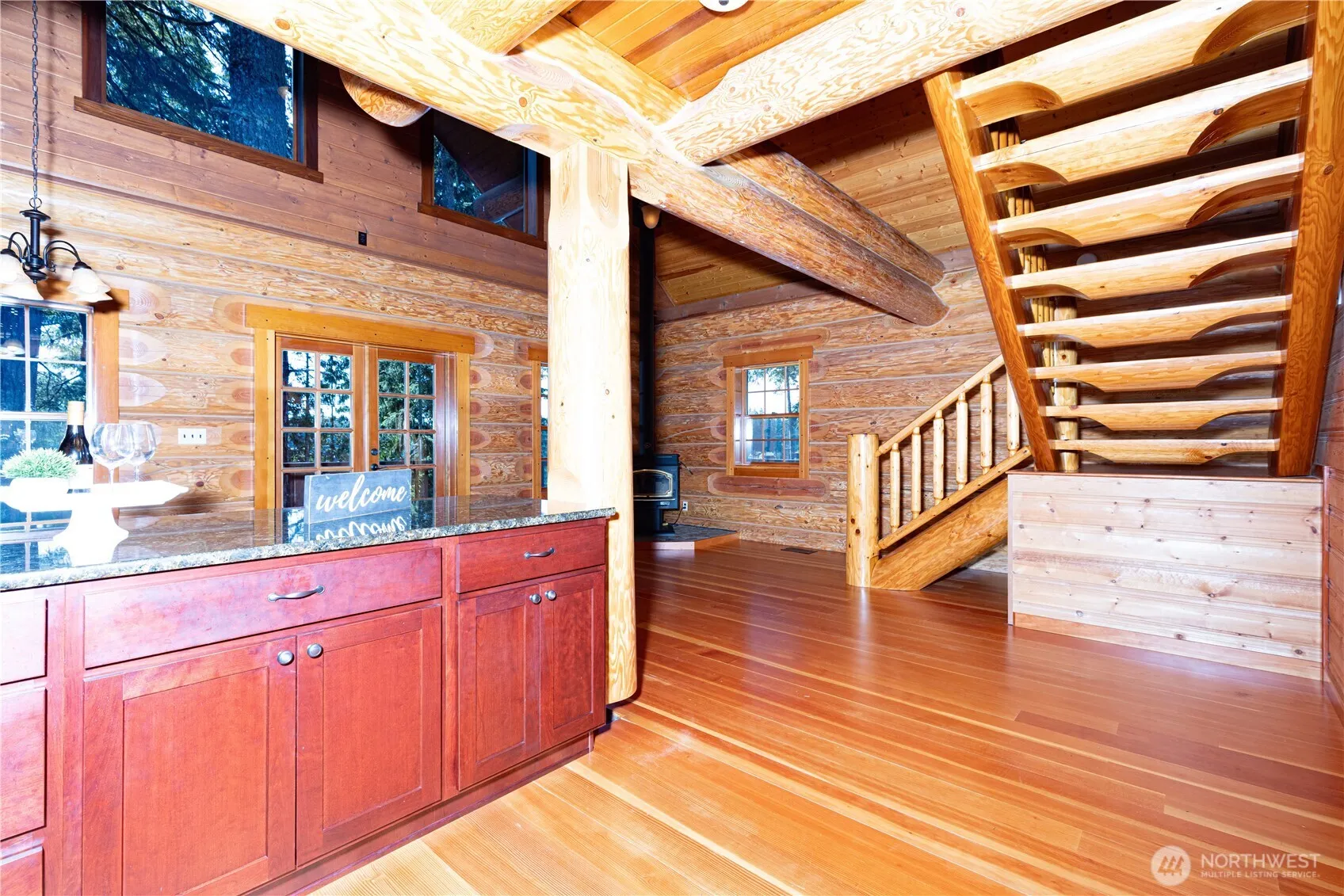 Welcome to your dream lakefront retreat in Trails End! This stunning custom log home blends rustic charm with modern comfort. The main floor features a warm wood-burning fireplace, stylish kitchen, office, and full bath. Upstairs, relax in the cozy loft with breathtaking lake views, then escape to the tranquil primary suite. The lower level offers its own entrance, full kitchen, bedroom, and bath—ideal for guests or rental income. Enjoy 75 ft of private lakefront, your own dock, a single-car garage, heat pump, storage, and year-round electric-motor-only lake fun—trout fishing, kayaking, and swimming. No HOA!