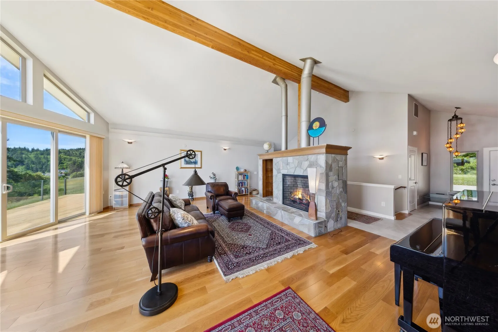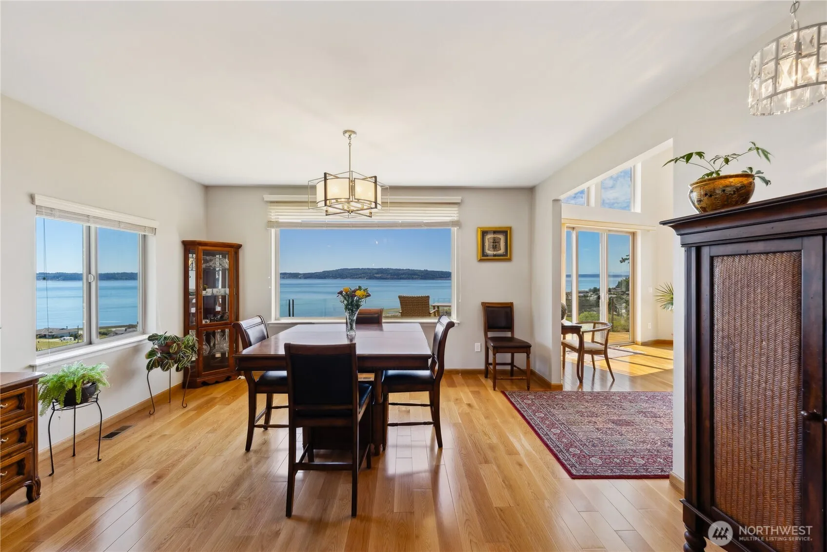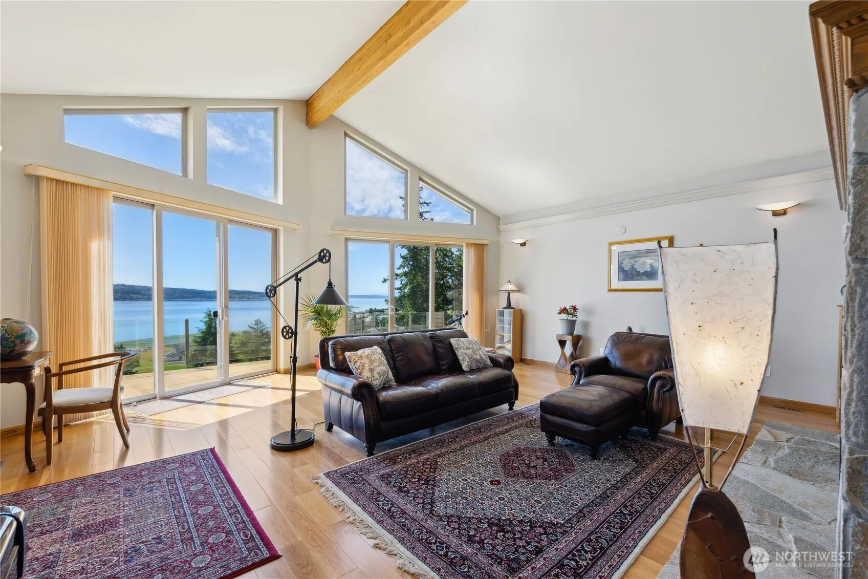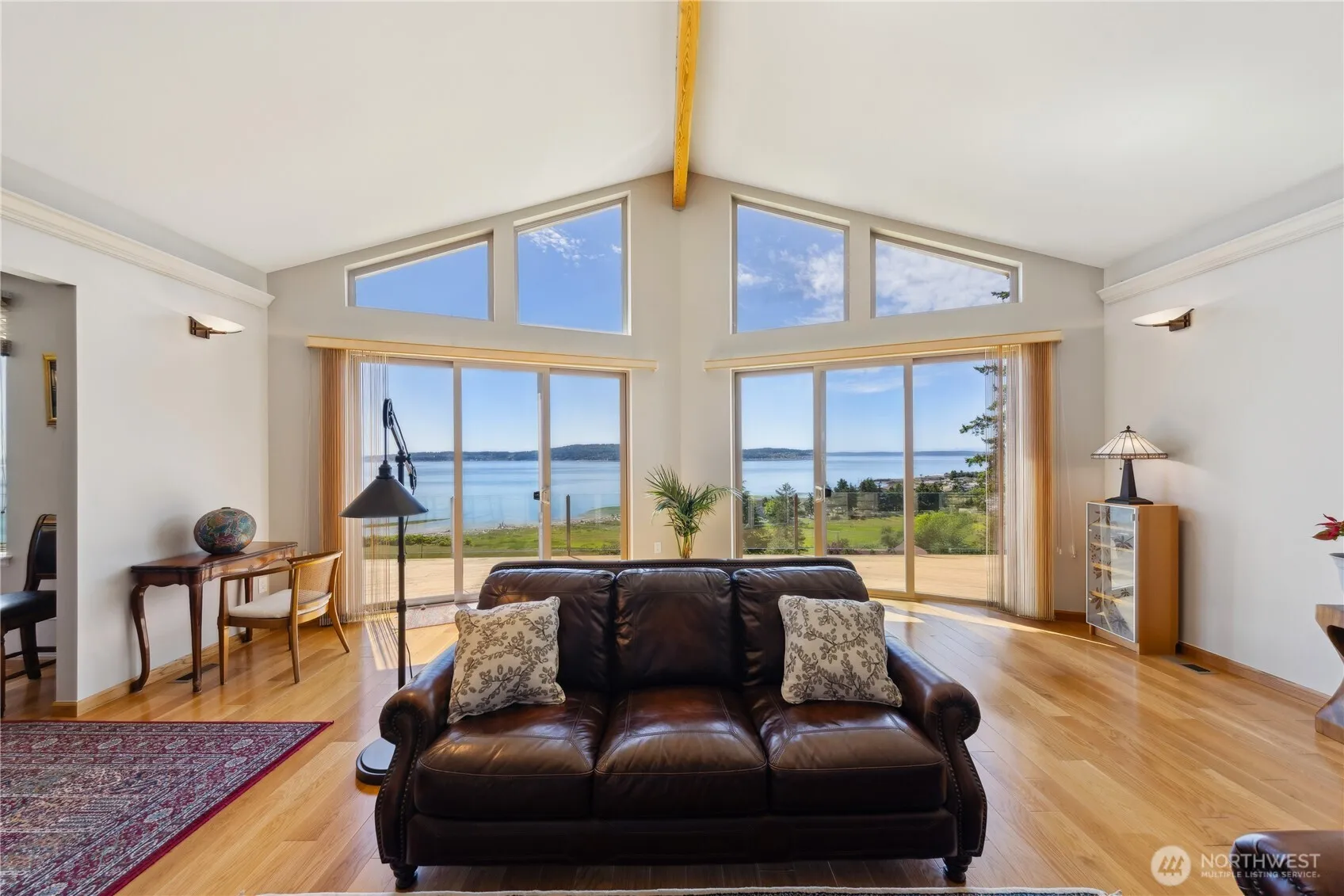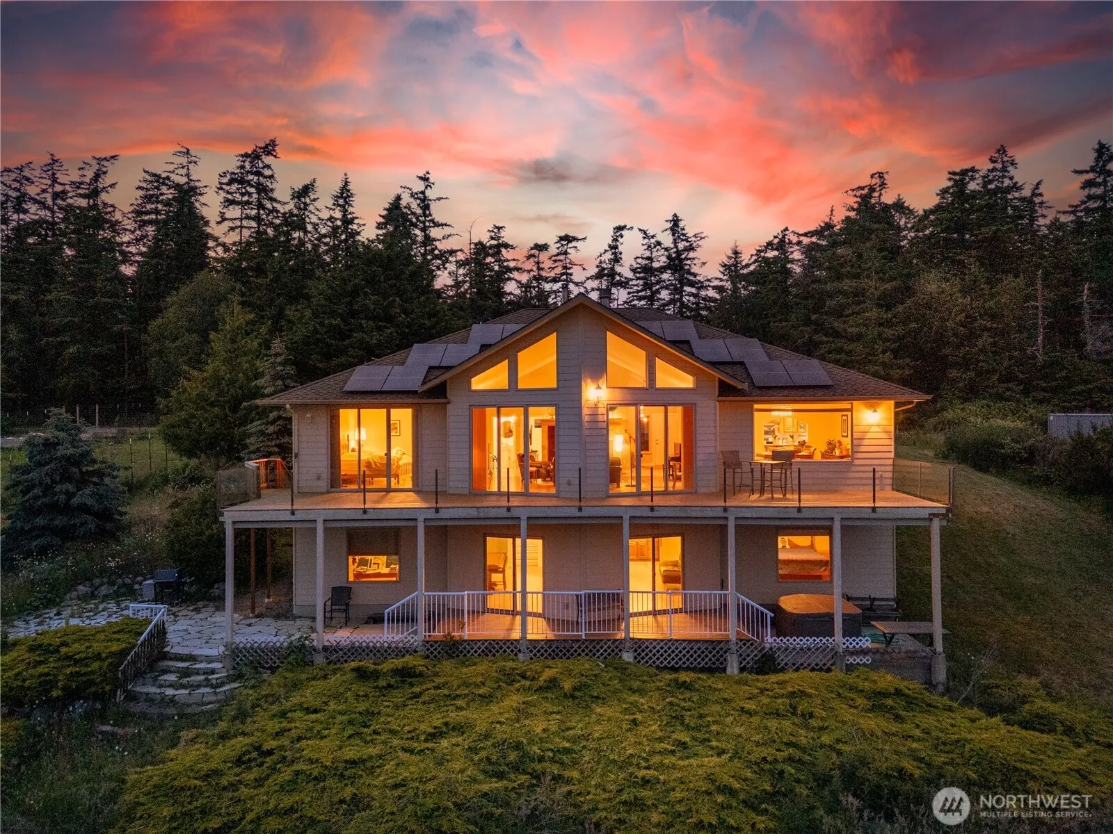Stunning, expansive water, mountain, and territorial views from this beautifully designed home! Enjoy watching boats & marine life from the large living room with twin sliding glass panel doors open to the transparent viewing deck. Vaulted ceilings, stone gas fireplace, spacious updated kitchen, breakfast bar. New flooring & decking. Active Solar Panels. Primary suite w/Luxury bathroom, and glass sliders to the deck. Lower-level water views, large Great room, full kitchen, Guest suite, bathroom, stone patio, wood stove, and hot tub. Almost every room has water views. Bring your RV or Boat, lots of parking space. Garage is 827 sq ft. Electric Car Charger. Just 3 mins to launch your boat at Mariners Cove. Move-in ready. *See Features List*