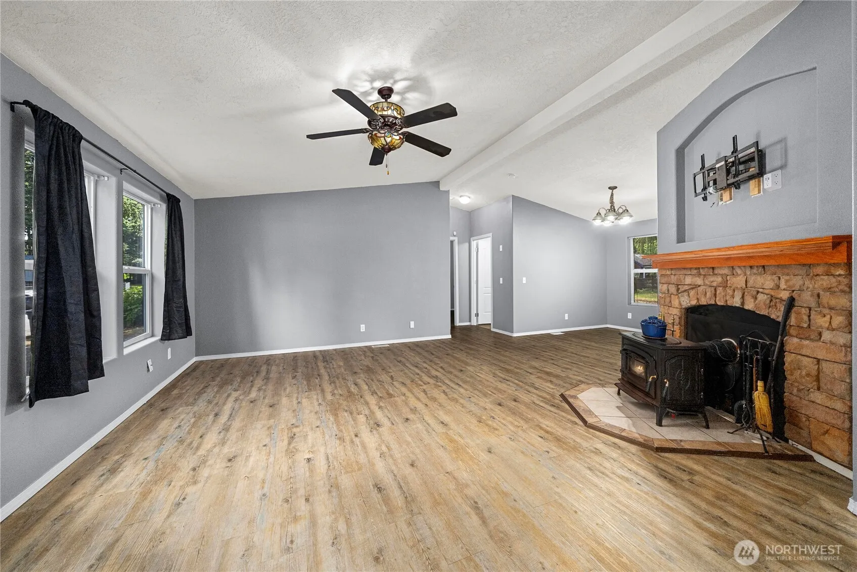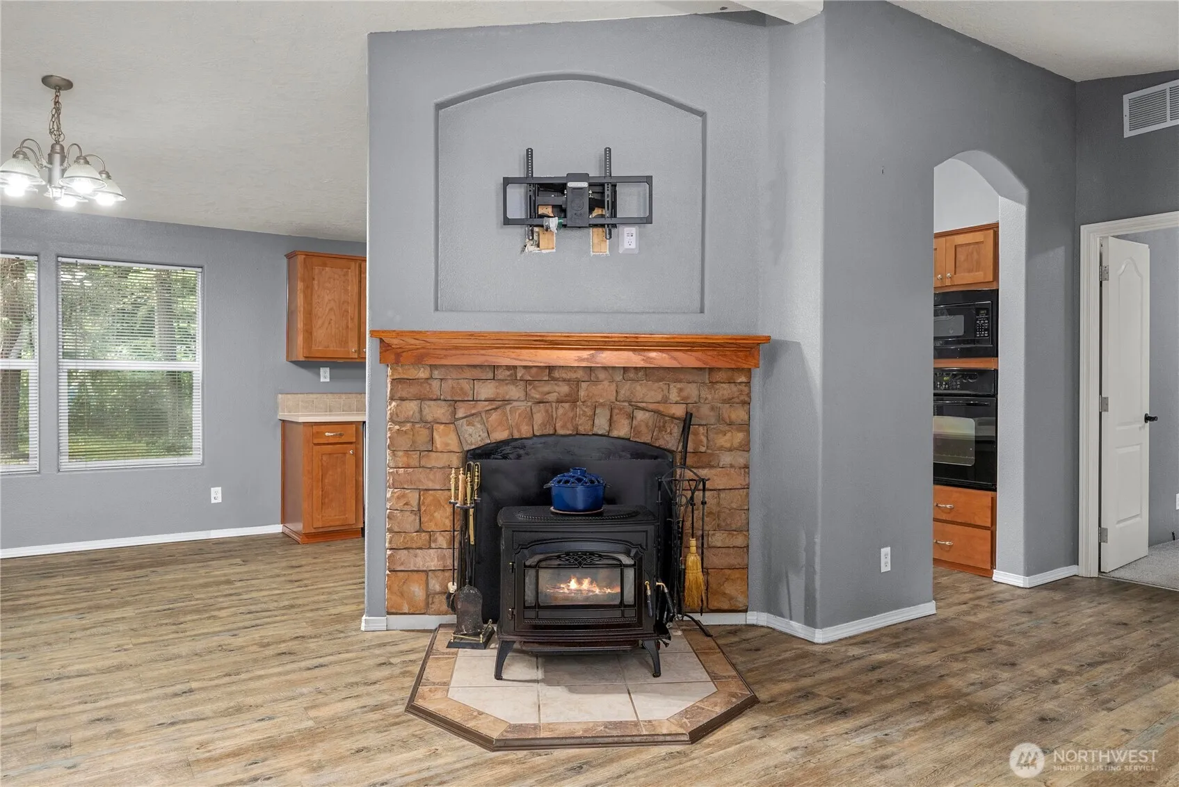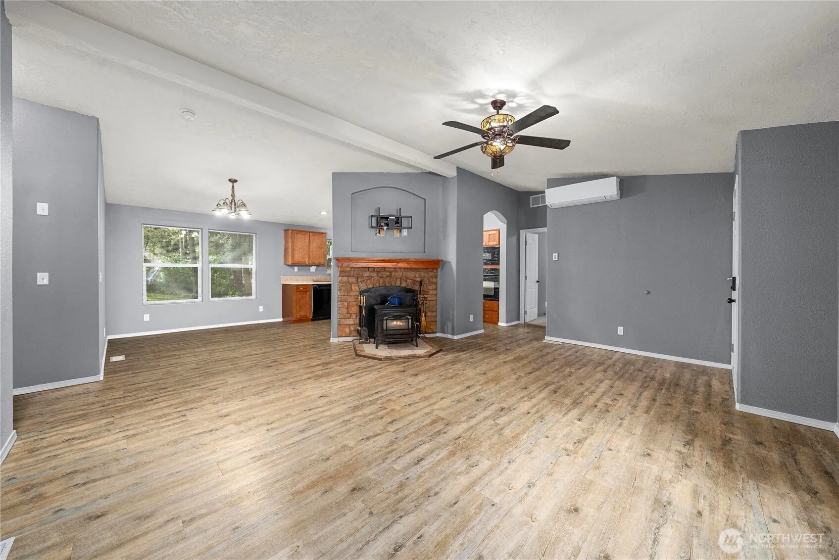 Discover comfort and convenience in this newer manufactured home on leased land—lot rent is $950/month. Stay cozy year-round with a mini-split system, forced air circulation, and a charming wood-burning stove with ceramic tile surround. Vaulted ceilings enhance the spacious living area, and the kitchen features a wall oven, glass cooktop, admin station, and generous cabinet space. The primary suite is separate from the two additional bedrooms and includes a handicap-accessible bath. Enjoy a pantry in the laundry room, two backyard sheds, and a yard ideal for gardening. Wheelchair ramp included!