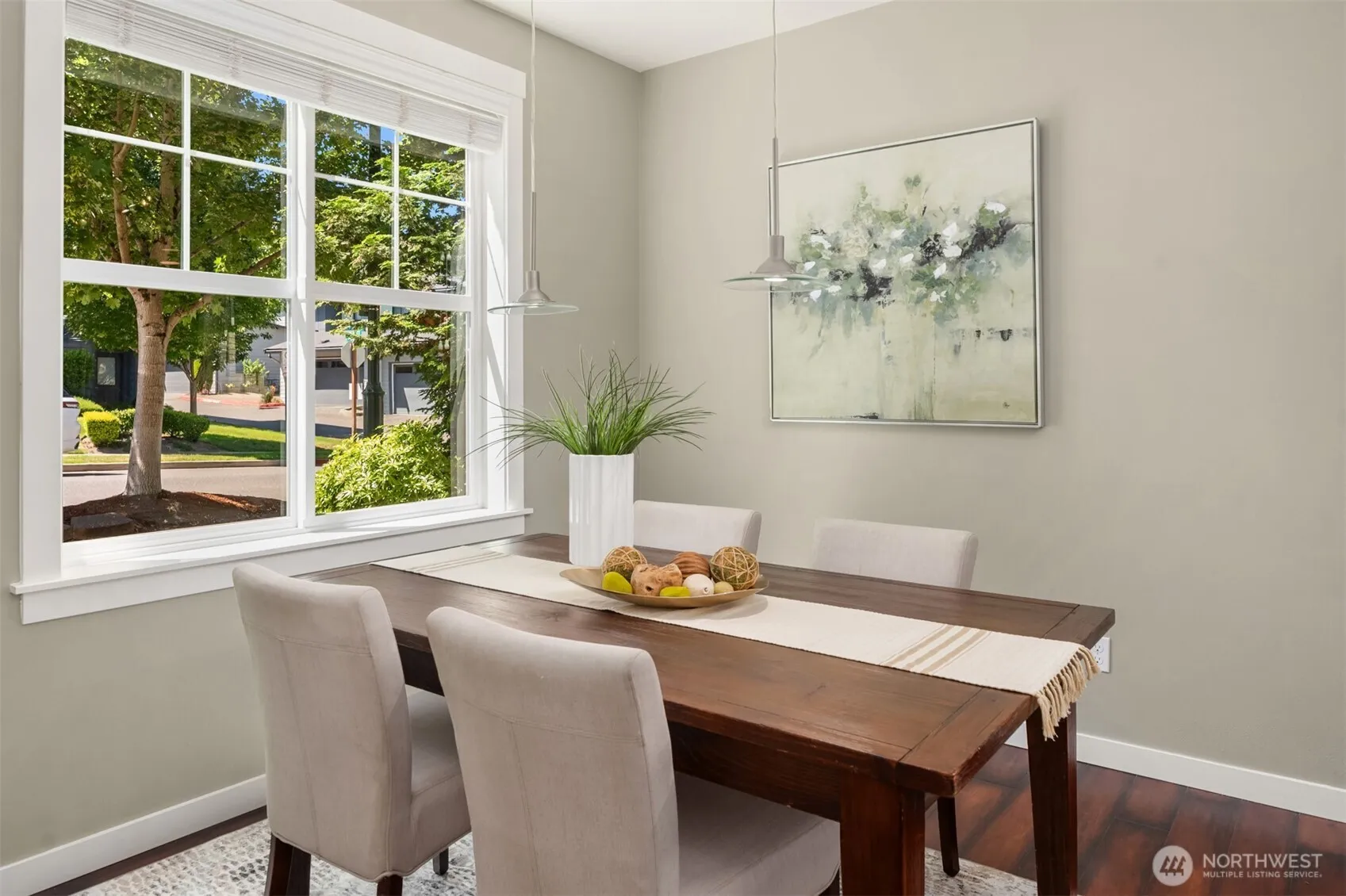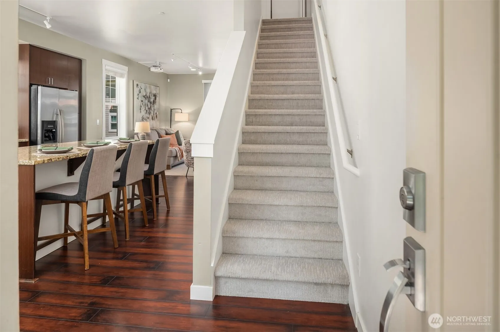LAKESIDE OASIS ~ Nestled in the heart of Newcastle in highly sought-after Lake Boren Townhomes, this pristine 1440sf 3 bed 3 bath end-unit is affordable waterfront luxury! Sophisticated curb appeal with timeless architectural details, shingled siding & stone accents. Modern open concept with tall ceilings, large windows & stylish designer finishes. Stunning contemporary kitchen with massive granite island bar opens to formal dining, living room with glass fireplace & spacious balcony with pergola. Primary suite with full-length closet & lavish bath with dual sinks & frameless glass shower. Garage with storage +driveway parking. Private community beachfront with dock, fire pit & patio with BBQ’s. Steps to parks, trails, shops, dining & more!