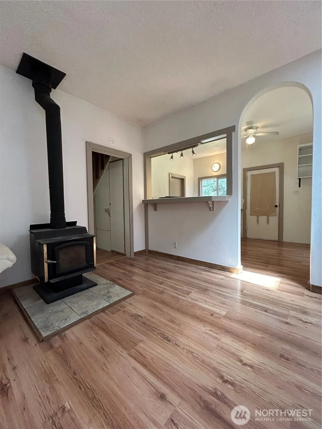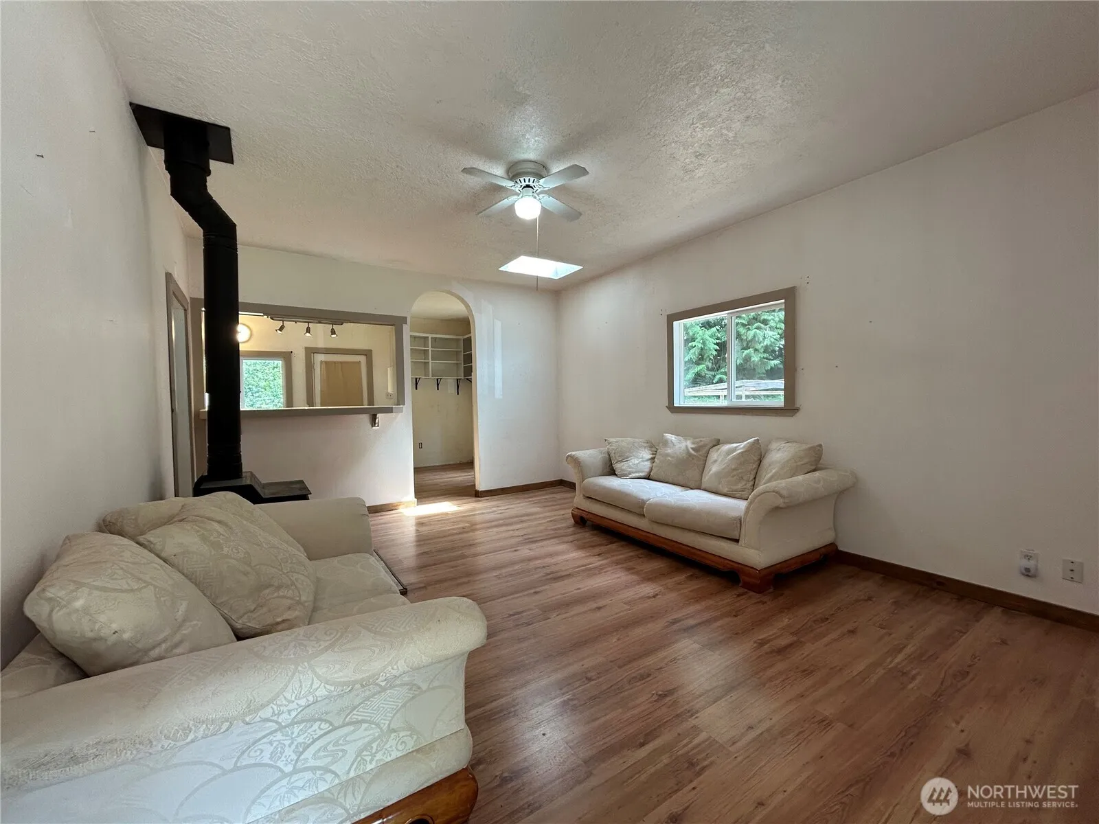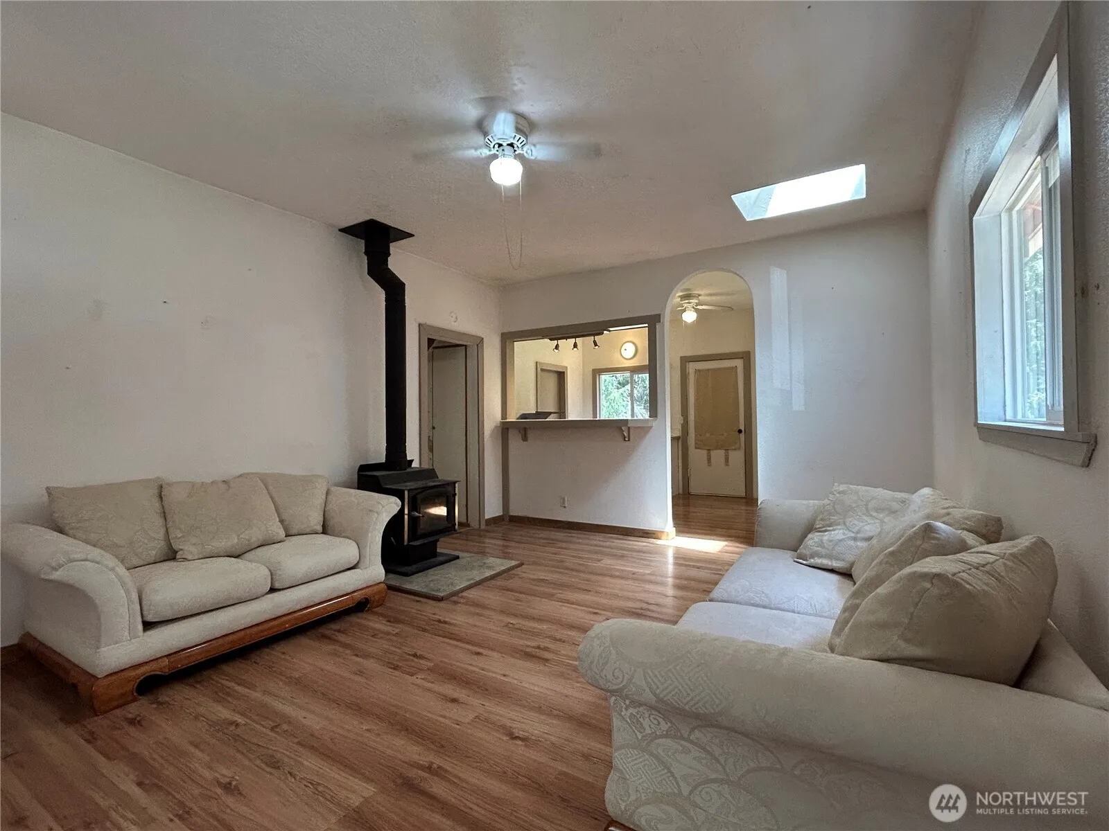 Charming 2 bd cabin in great location! Seller’s plans changed and this could be your opportunity for a livable space while applying your finishing touches; all systems functioning; imagination and TLC will make it shine! Front porch, free-standing wood stove, A/C, skylight, high ceilings, ceiling fans, dbl-pane windows, metal roof, arched detail, kitchen w/ pass-through/bar & eating space. 1/2 story upstairs; bedroom, office, craft room, game room, storage – you decide! Outbuilding, det. 1 car garage and .4 acres of level land with good exposure for gardening. To be sold “as-is”, with potential! A tidy footprint with everything you need just far enough from town for that rural feel but short drive to all amenities; come take a look!