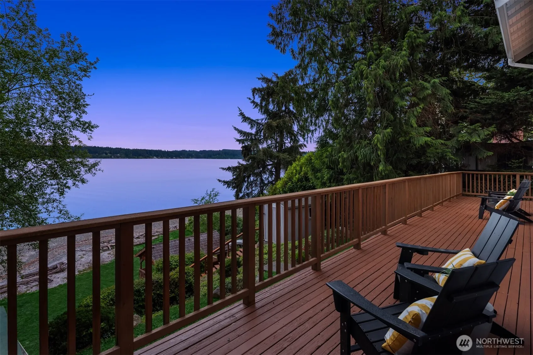 Nestled near the end of a quiet residential road + directly on the waterfront, this Poulsbo estate blends natural beauty with modern luxury. Natural light fills spacious open-concept main living level. French doors lead graciously to expansive deck overlooking Agate Passage. Primary suite occupies entire upper level, offering balcony, home office, walk-in closet, exercise studio, + spa-like bath featuring soaking tub. Flexible space on lower level with media room, bedroom + bonus room. Stairs lead to private 82-foot shoreline with great entertainment facilities including cabana, sports court + mooring buoy. Finished space above two-car garage offers many possibilities. Minutes to Bainbridge Island ferries.