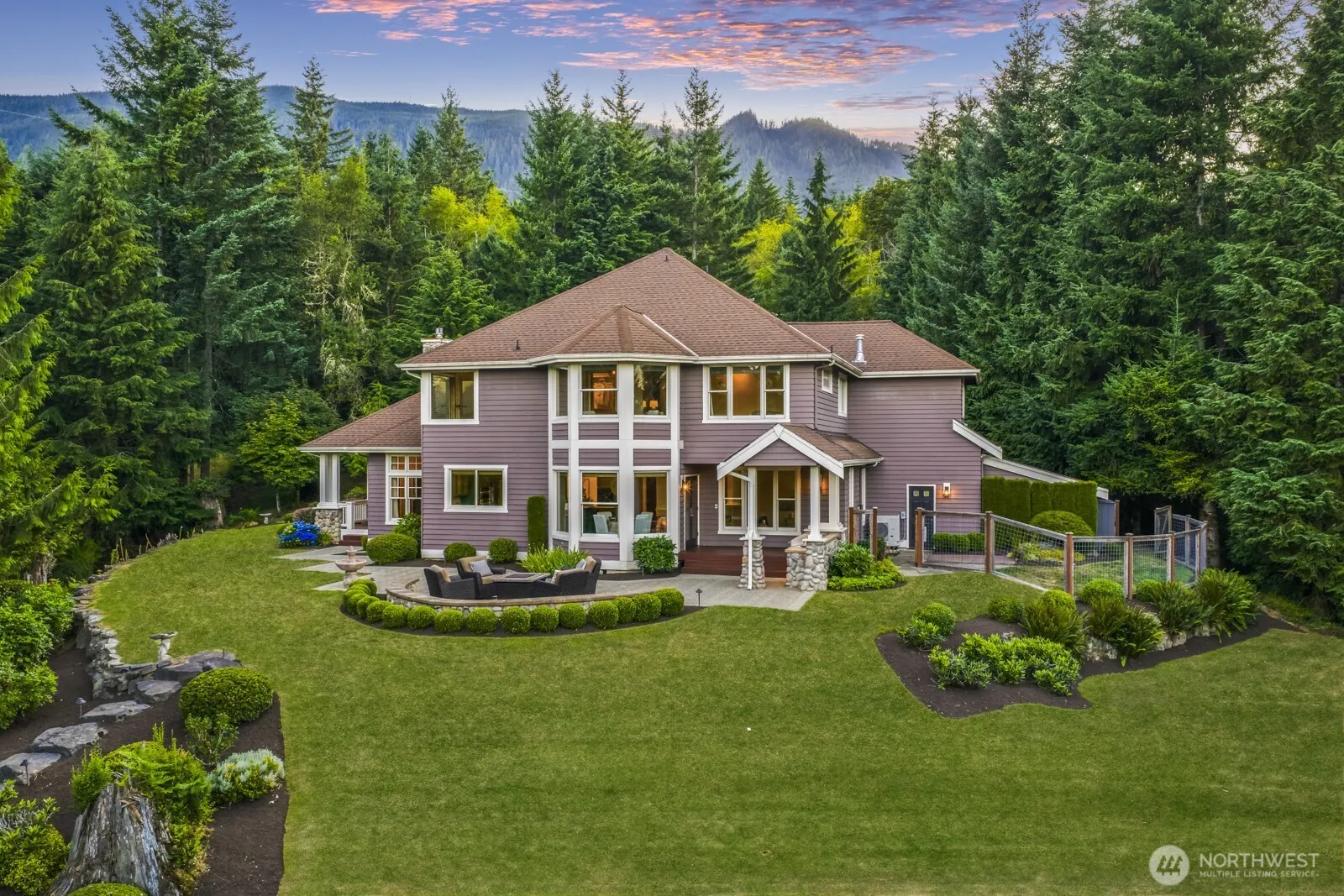 Majestic. Scenic. Elevated. Tucked away on nearly 10 sun-drenched acres this extraordinary Uplands estate offers a rare blend of privacy, luxe & epic views of Mt. Si & Cascades from nearly every room. 4 beds, 3.5 baths, office, media lounge & 3,740 sf of light-filled living. Soaring ceilings, custom wood windows, hardwoods, & a showstopping, magazine-worthy kitchen designed for gathering. 3 ensuite beds=ideal for guests or multi-gen living. Dreamy primary w/ spa bath, walk-in, sitting area, & stunning views. 3-car garage + toy garage. Indoor/outdoor spaces flow seamlessly—perfect for entertaining, relaxing, or watching the sun rise & set. Thoughtful finishes throughout. Mins to trails, river, DT NB & I-90. More than a home—it’s a lifestyle.