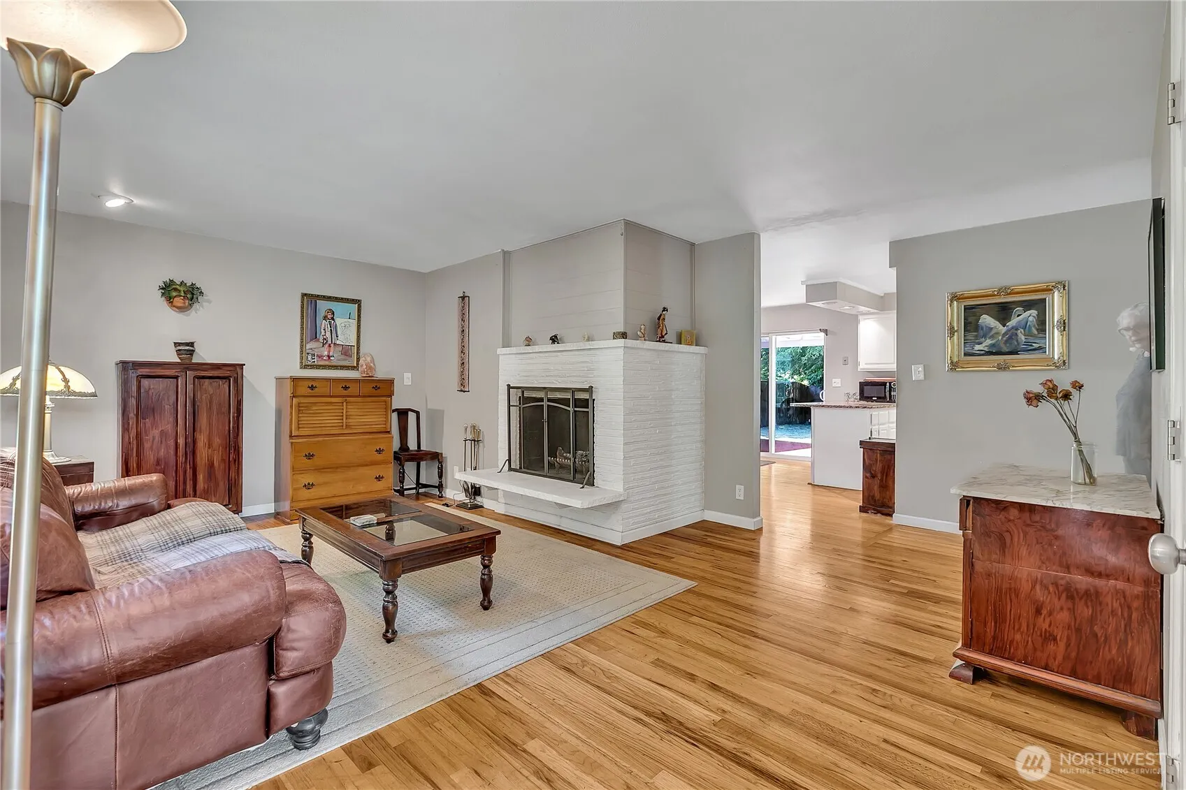 Impeccably maintained & upgraded rambler ready for your personal touches. Privacy & serenity abound from the lush yard & quiet street. Gleaming hardwoods throughout plus tasteful colors. Large kitchen has granite countertops, white cabinets and stainless steel appliances plus large garden window over the sink. Eating counter divides kitchen from dining room that provides access to the private backyard covered patio and garden spaces. Primary bedroom has 2 huge closets 1 being a walk-in. The 4th bedroom could easily be a family/rec room and features vaulted ceiling and 2 skylights. Fireplace in both living and dining room. Commuter’s dream location minutes to I 5, 99 and airport. Walk to fab YMCA or Community Park adjacent to Angle Lake